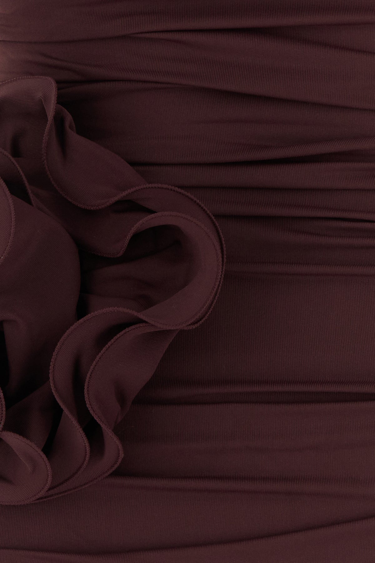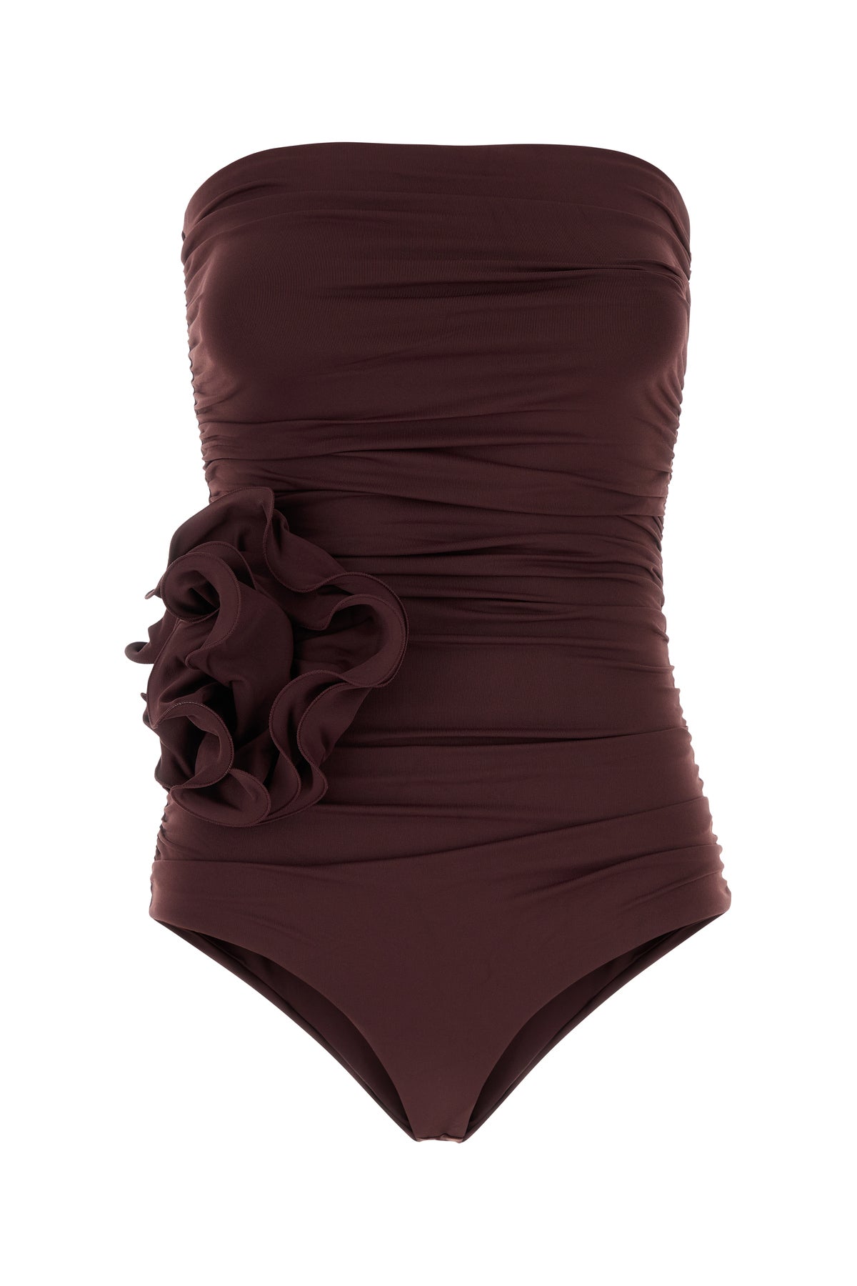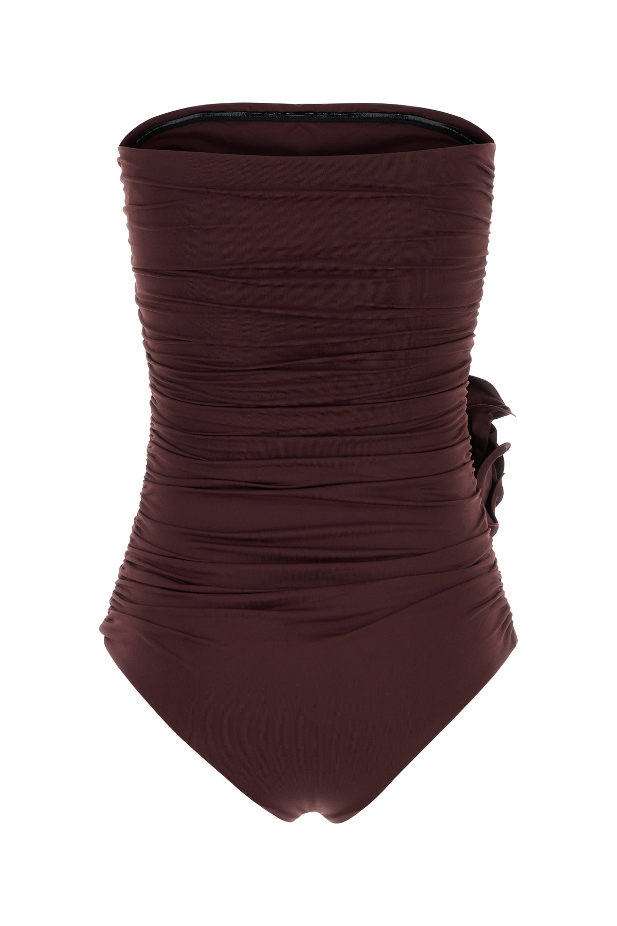 Swimsuit realized in stretch nylon characterized by gathering on the side enriched by floral patch on the side.