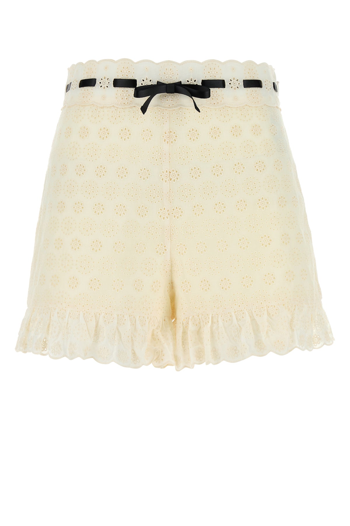 Shorts realized in pure cotton broidery anglaise enriched by satin ribbon with decorative bow at the waist.