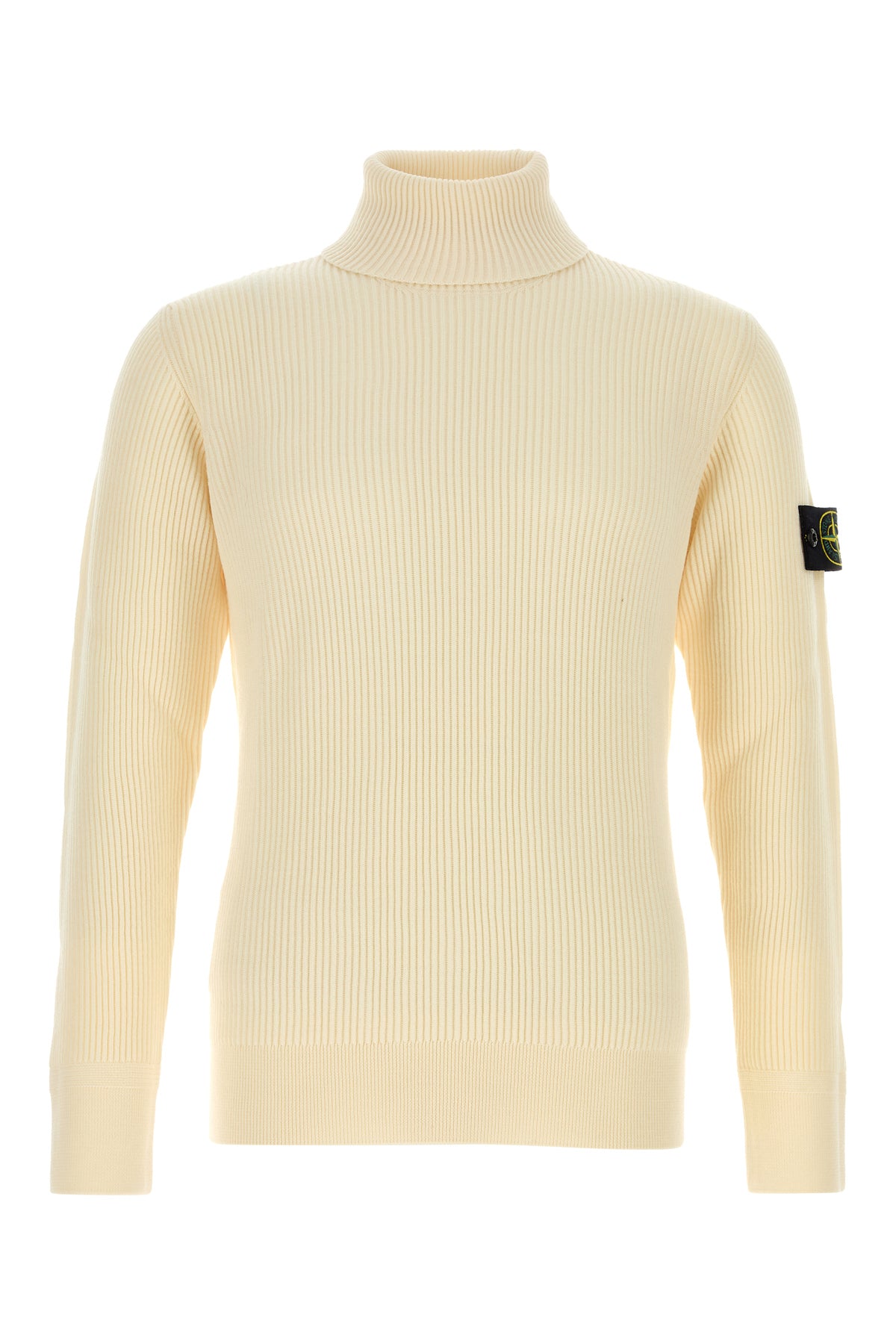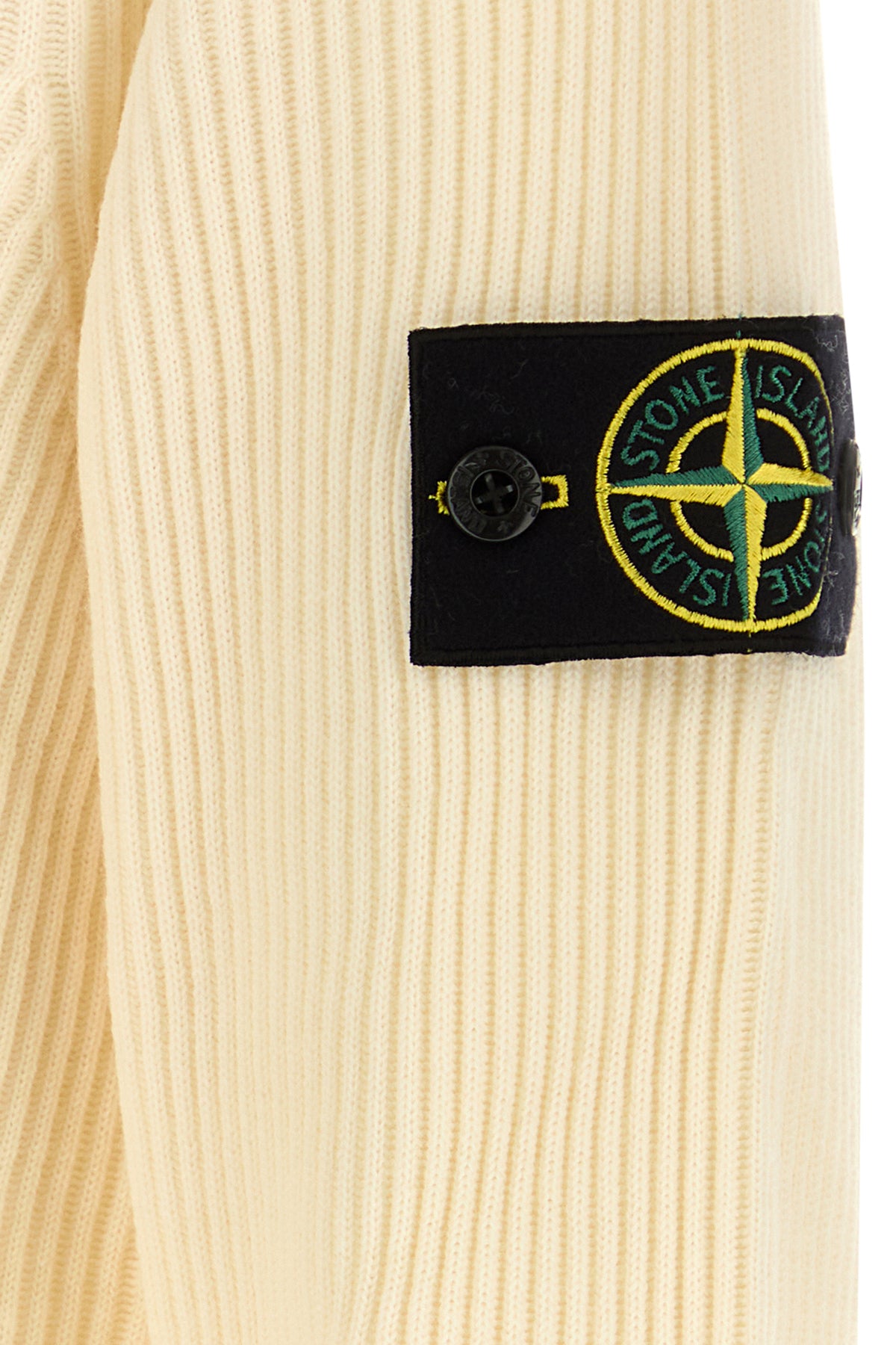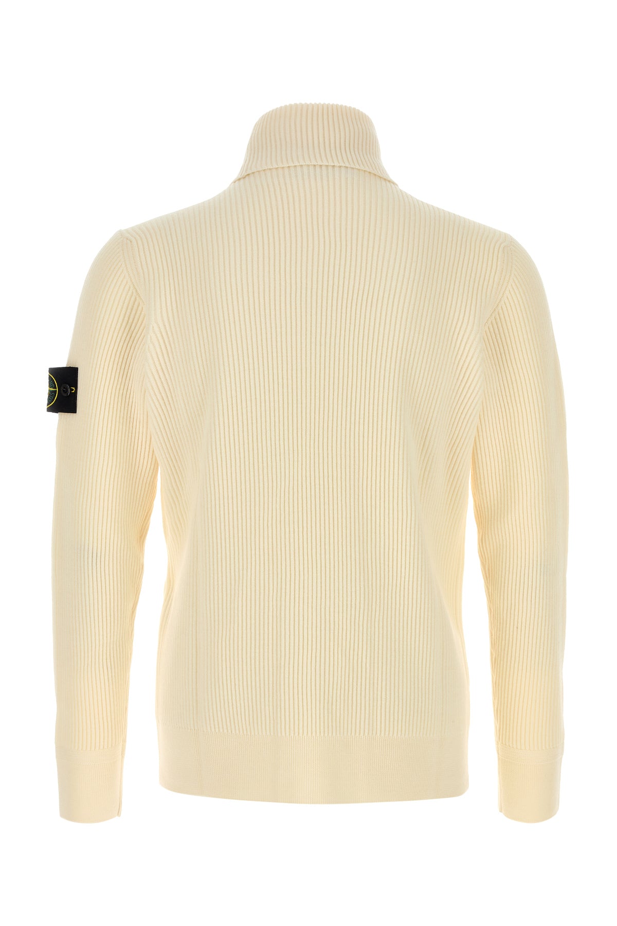 Sweater realized in pure ribbed virgin wool enriched by detachable logoed label on the sleeve.