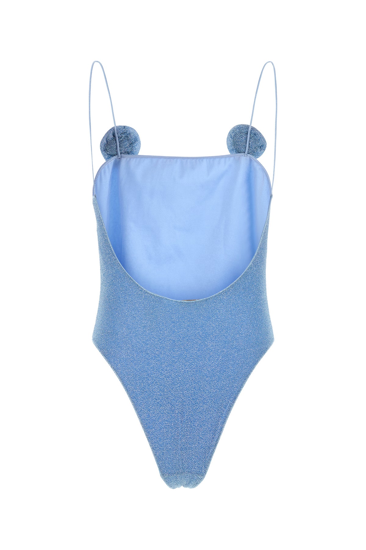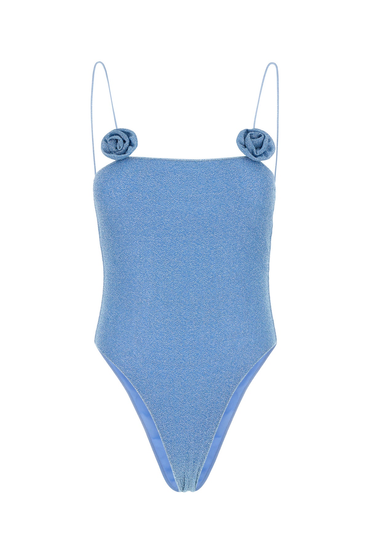 Swimsuit realized in nylon with lurex threads enriched by floral embellishments at the top.
