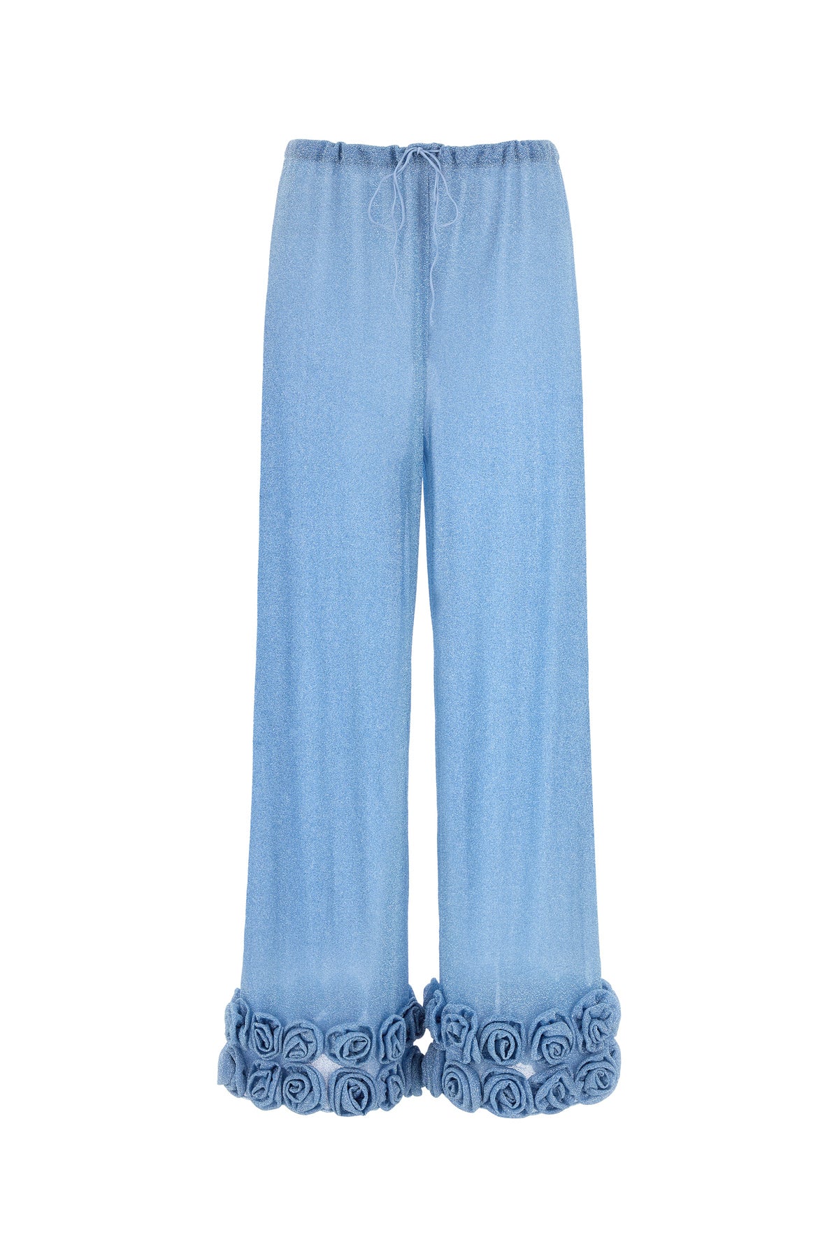 Wide-leg pant realized in nylon with lurex threads enriched by floral embellishments on the hemline.