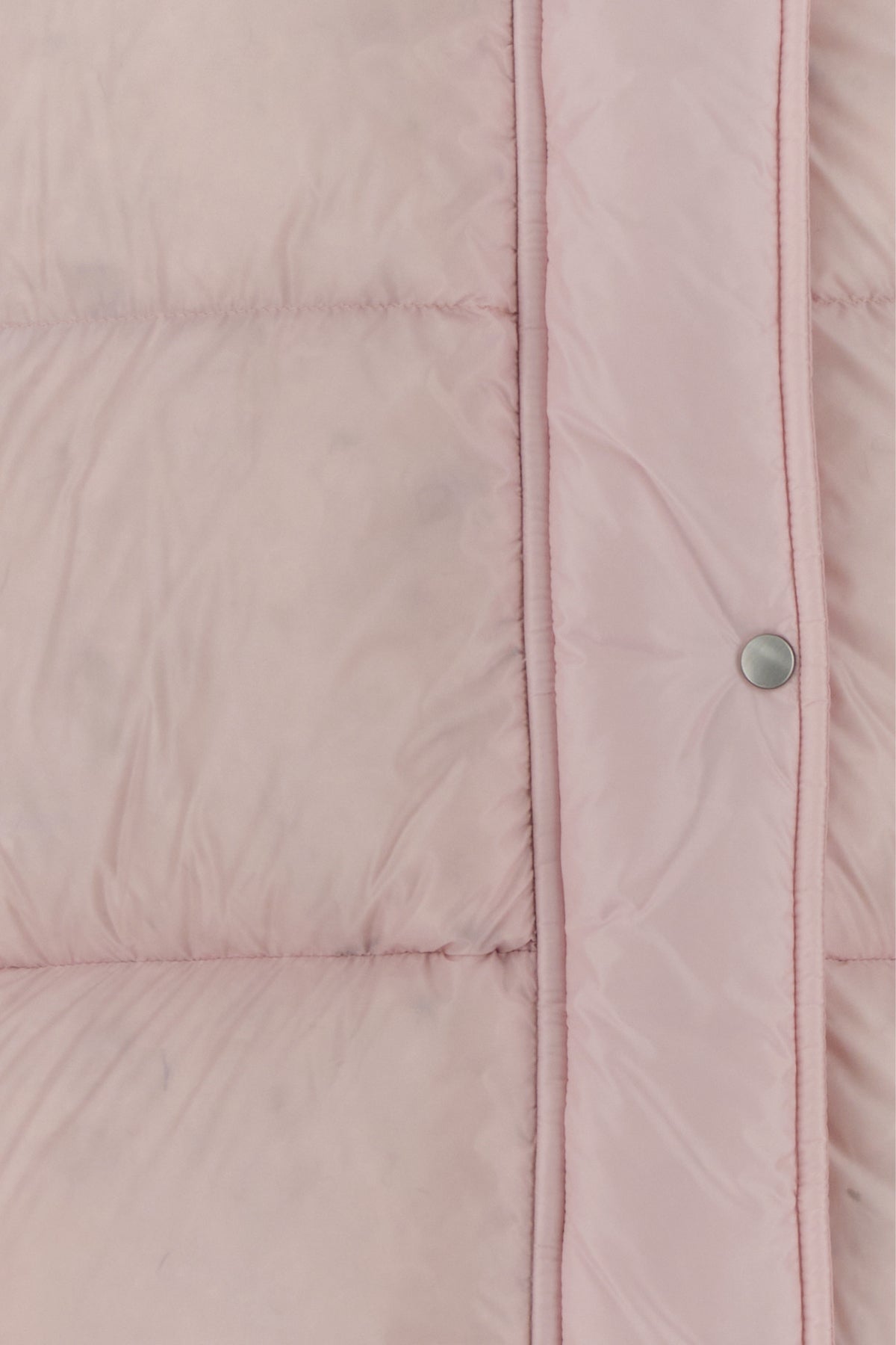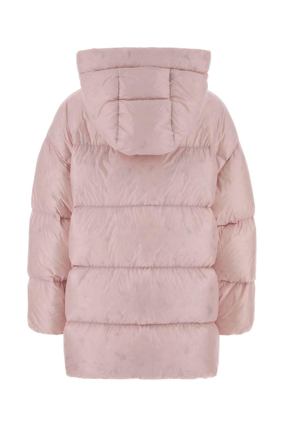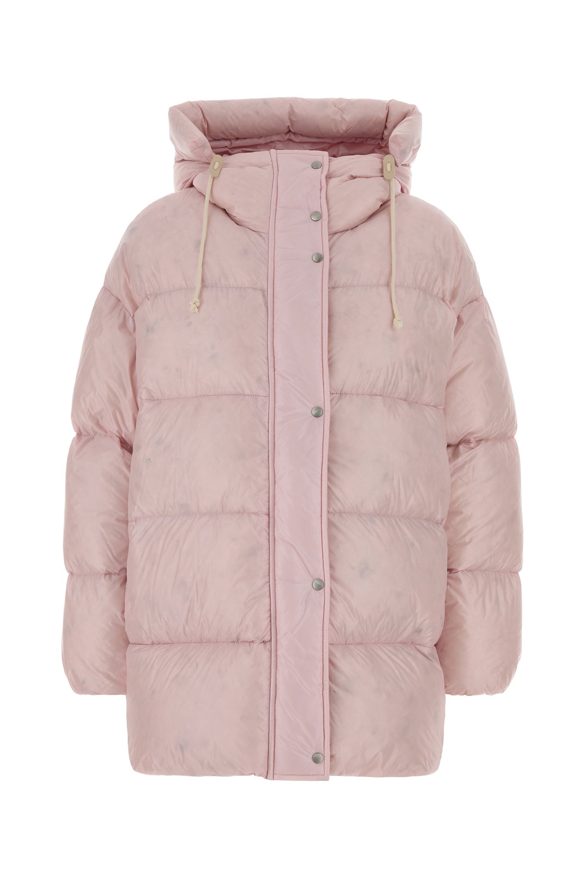 Down jacket realized in quilted nylon with intentional dirties characterized by drawstring hood.