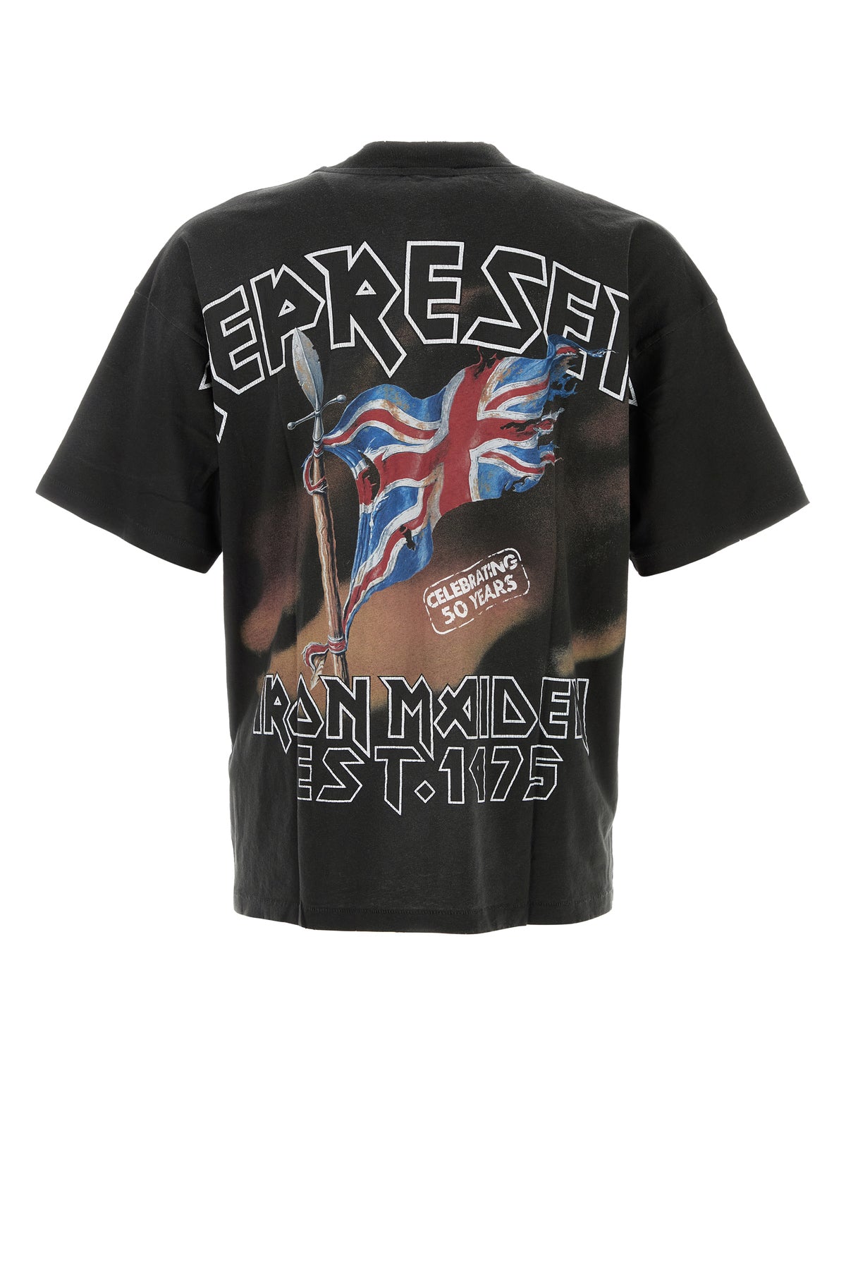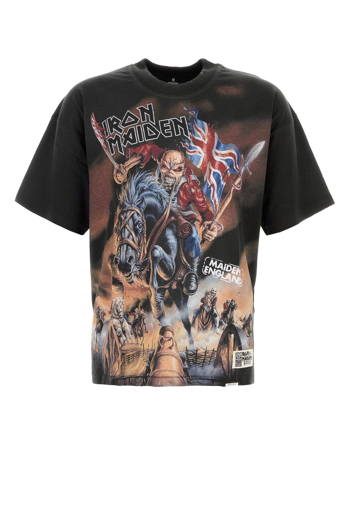 Oversize t-shirt realized in stonewashed cotton and hemp characterized by Iron Maiden print at the front and at the back enriched by metal logoed plate on the hemline.