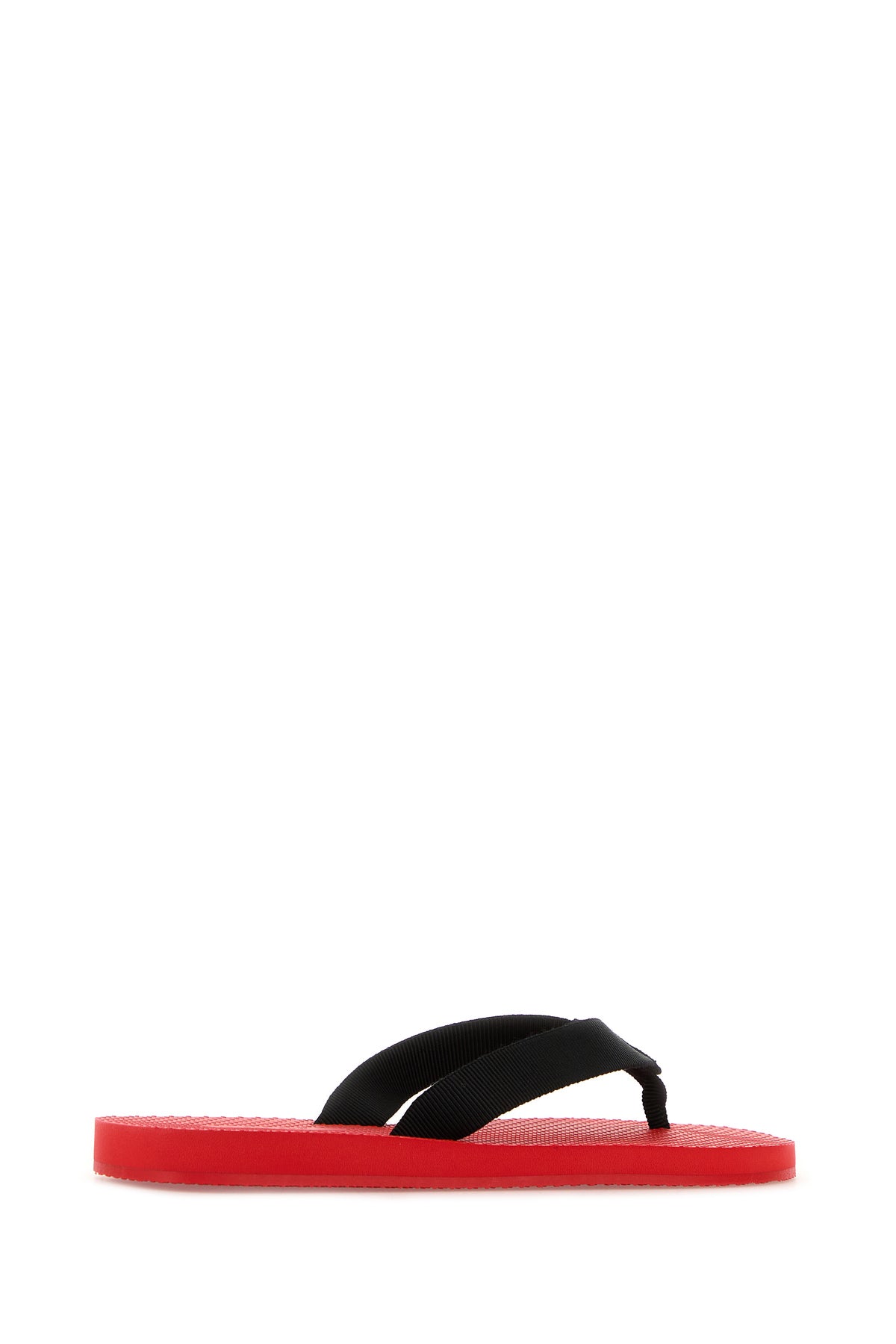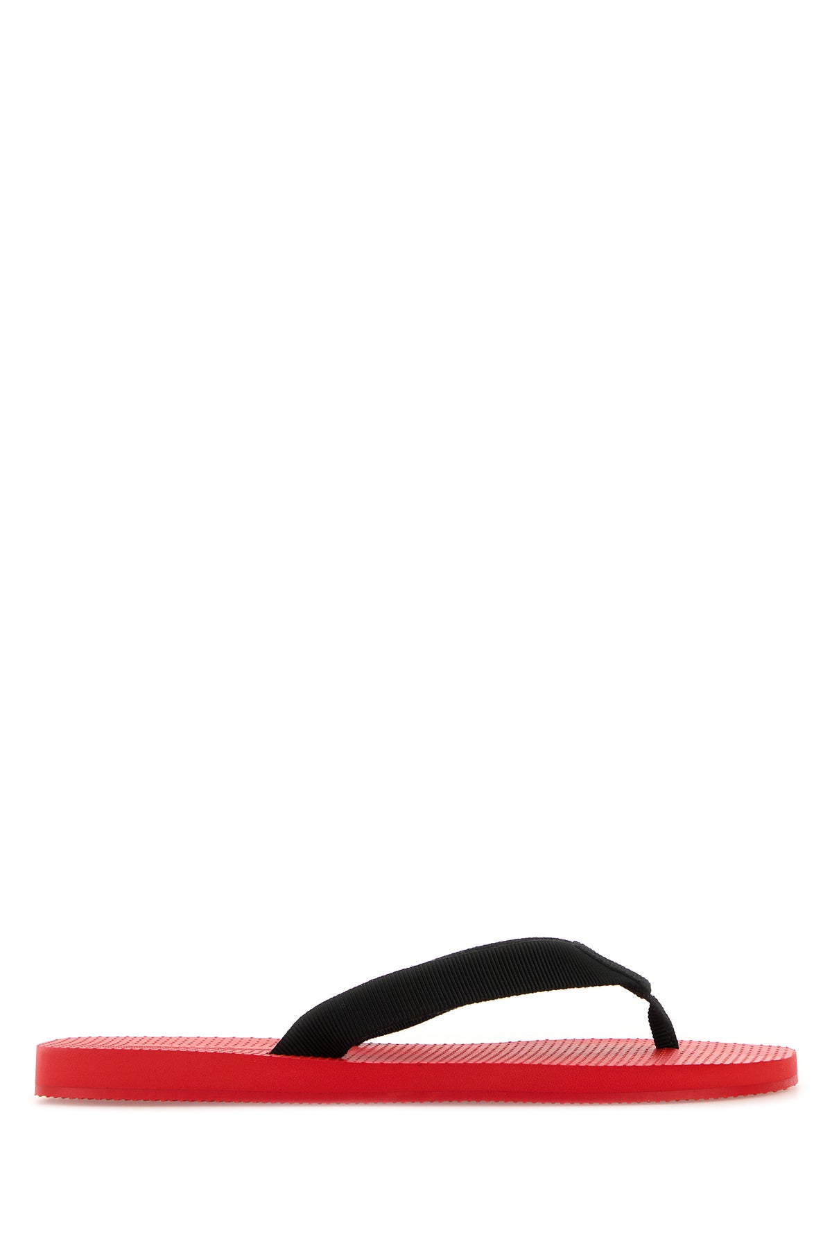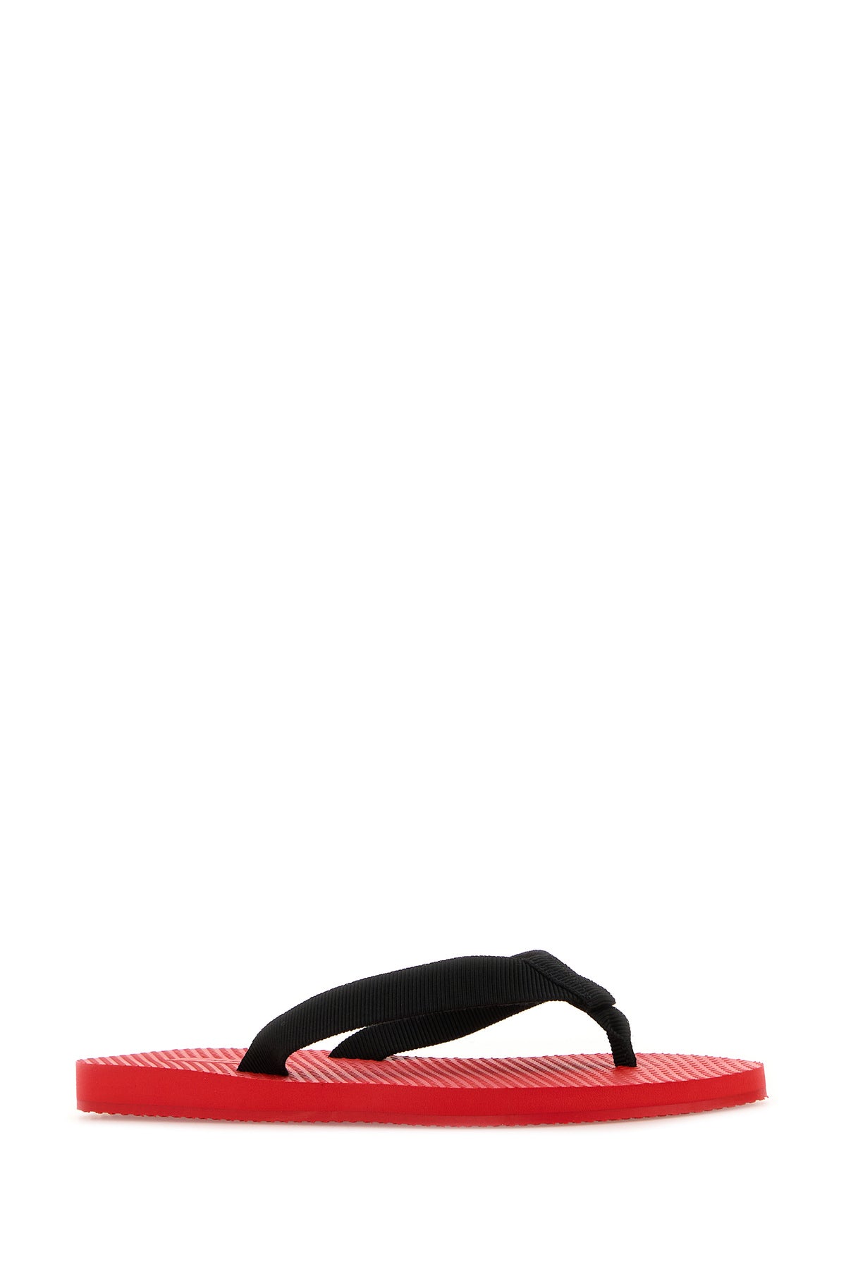 Thong slippers realized in fabric.