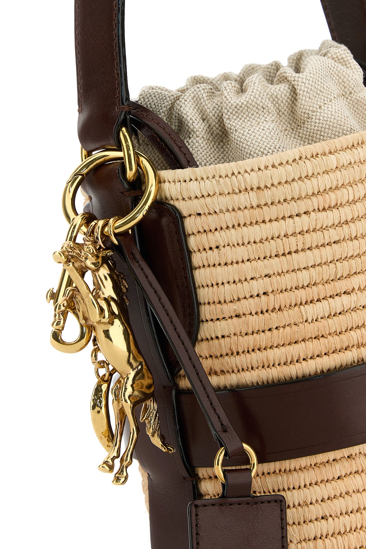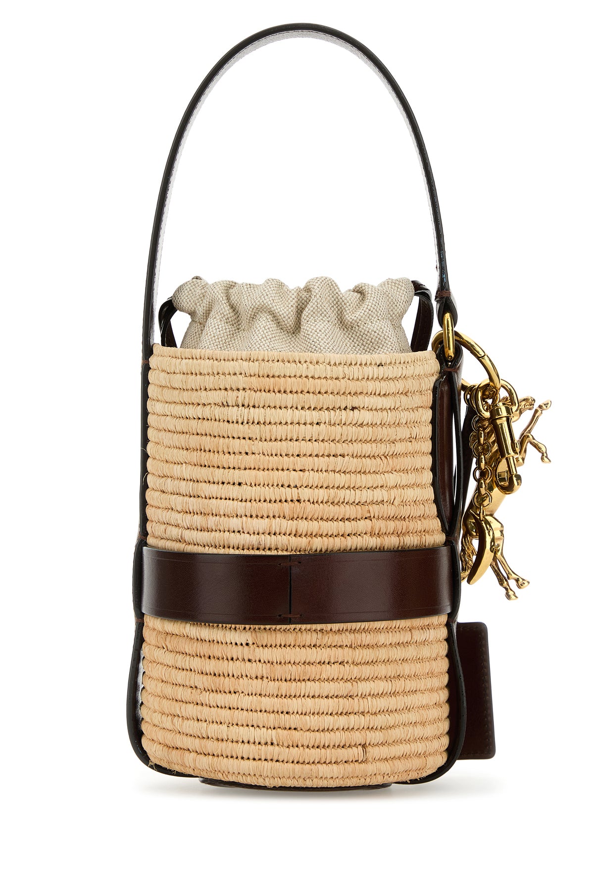 Bucket bag realized in raffia and smooth calf leather characterized by laminated printed logo at the front enriched by detachable accessory with logoed charms on the side.