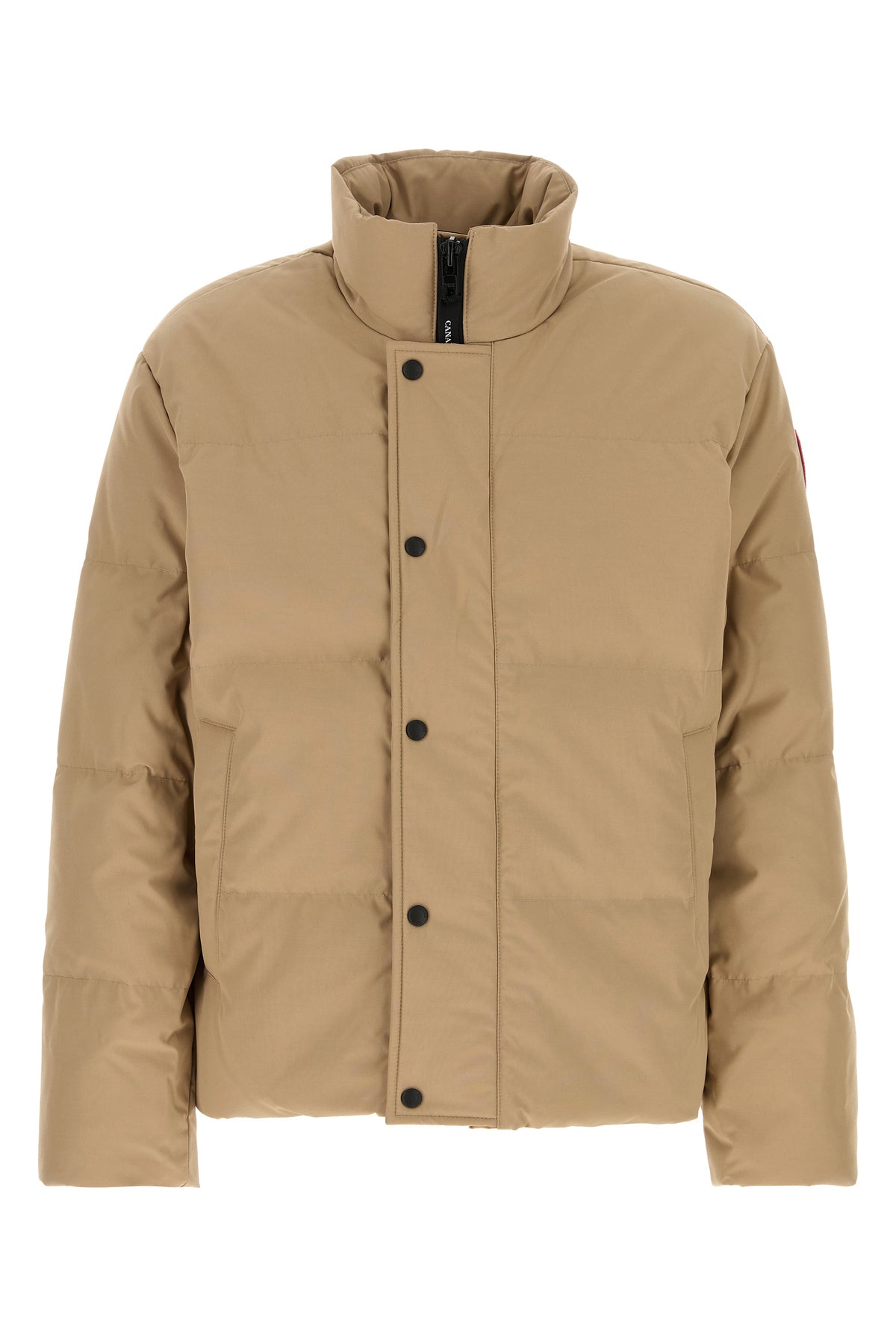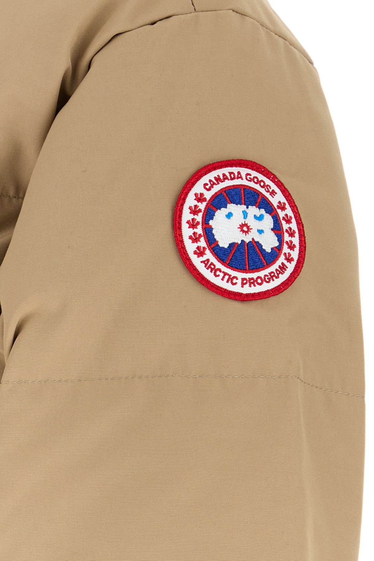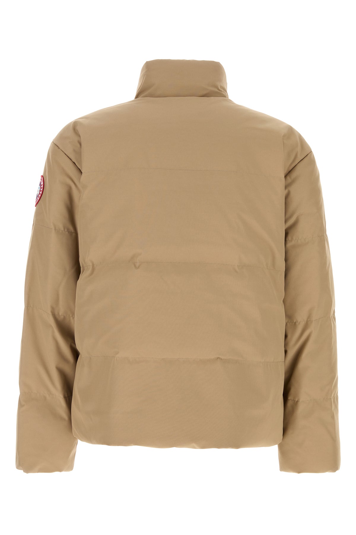 Down jacket realized in polyester and cotton enriched by contrasting logoed patch on the sleeve.