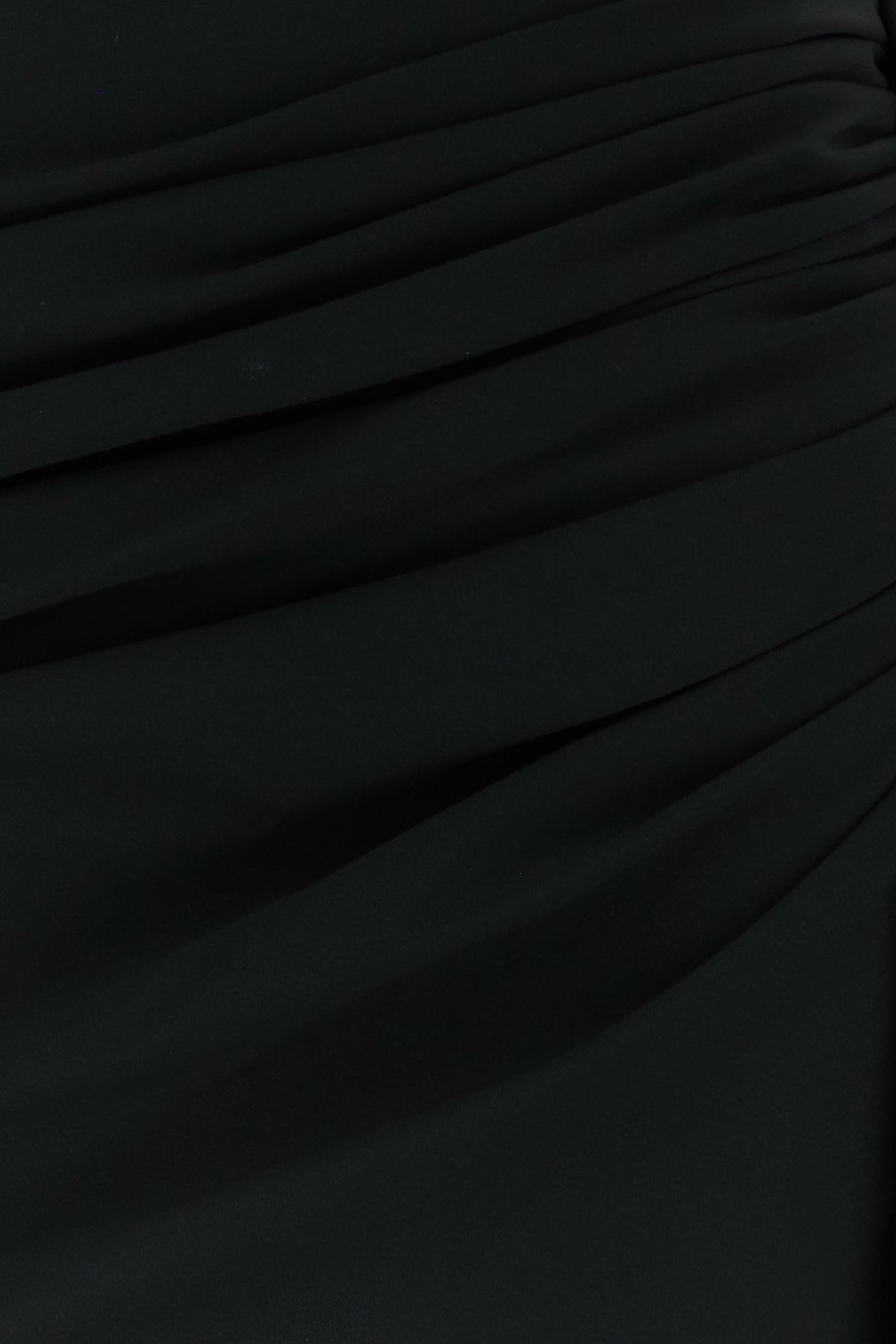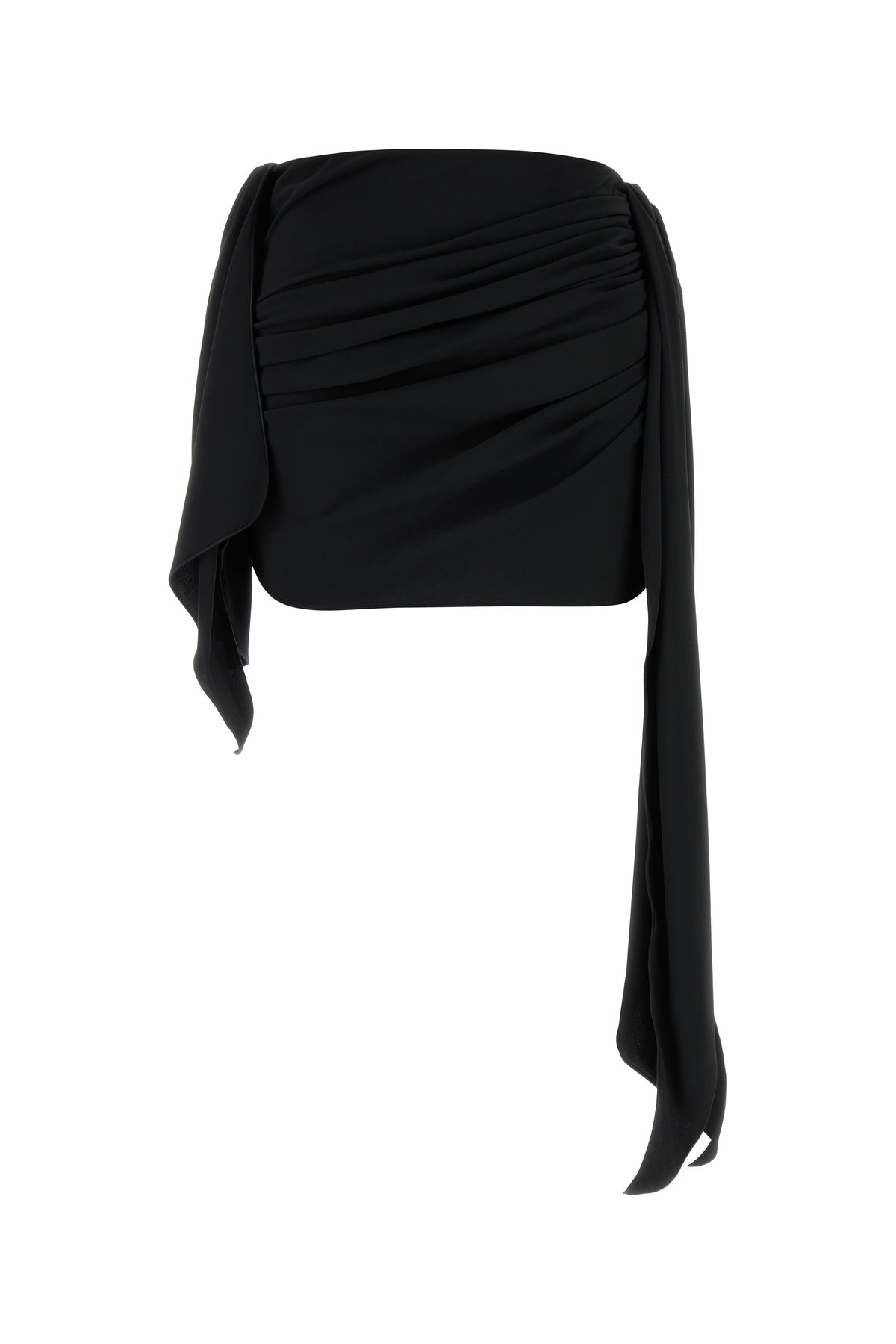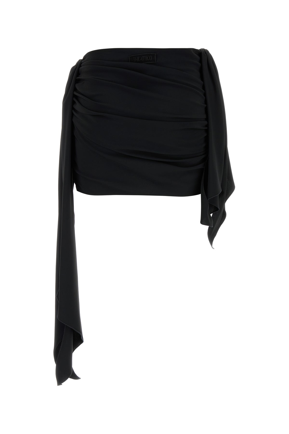 Draped mini skirt realized in crepe enriched by tonal logoed label at the back.