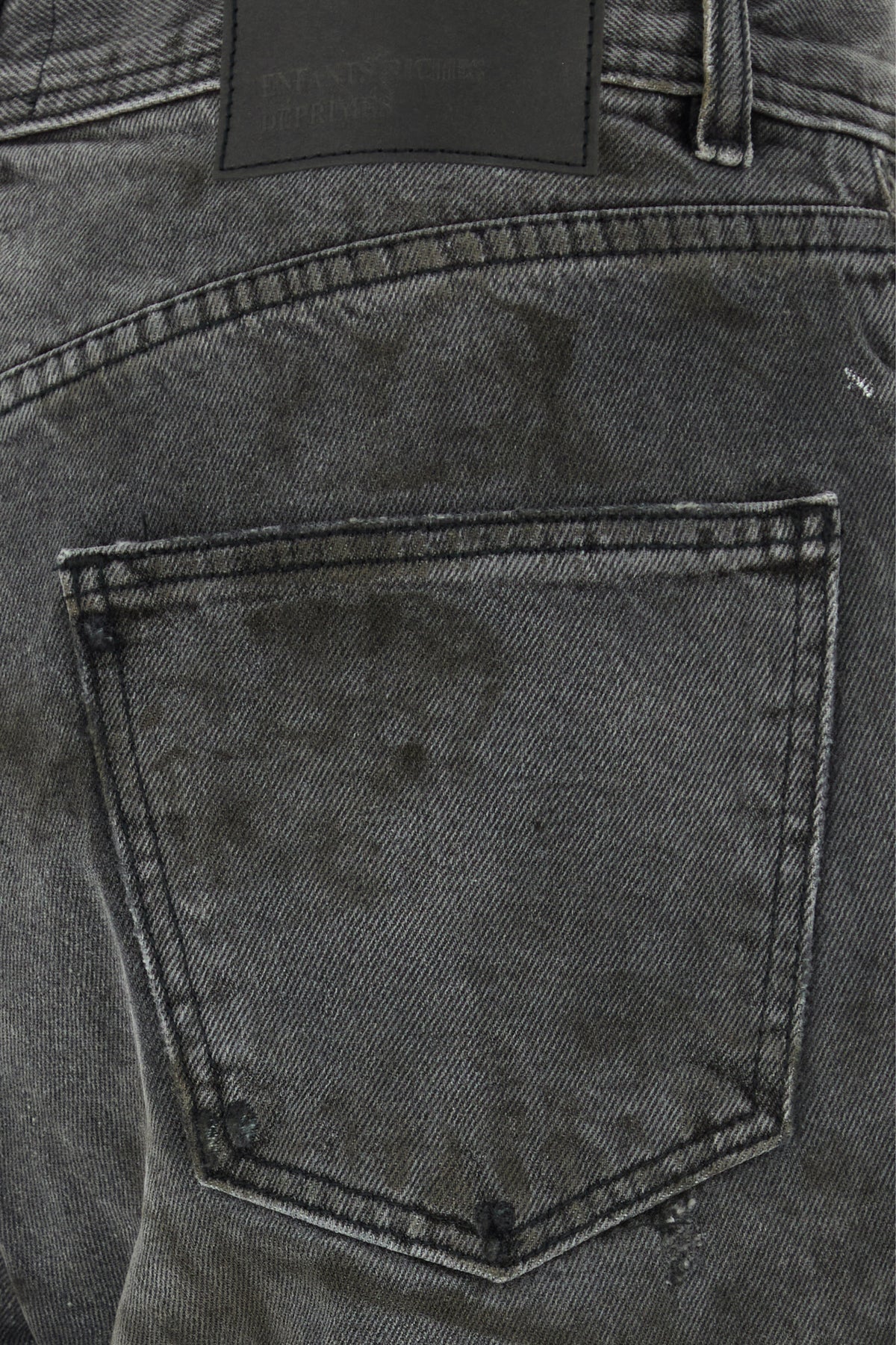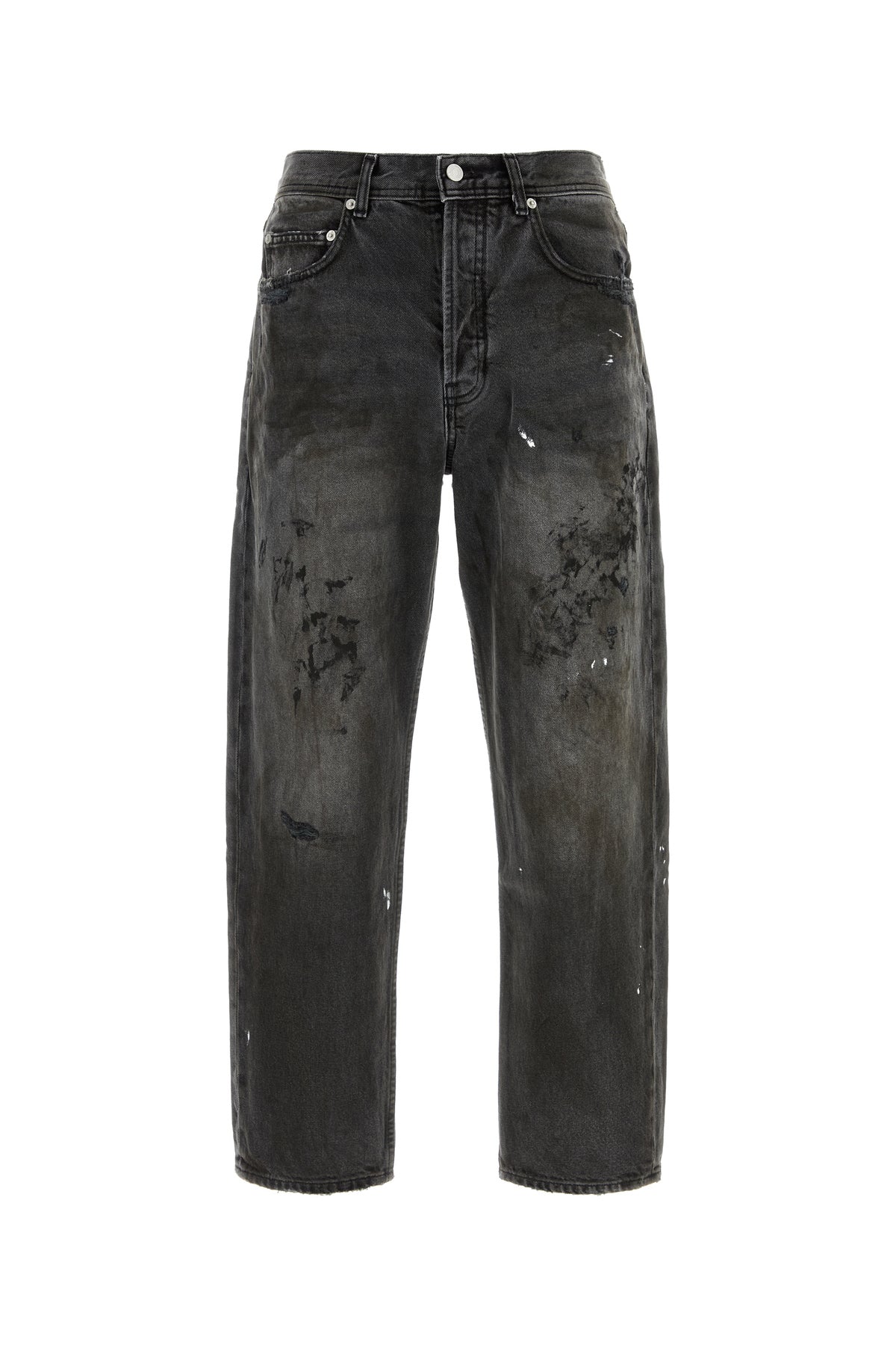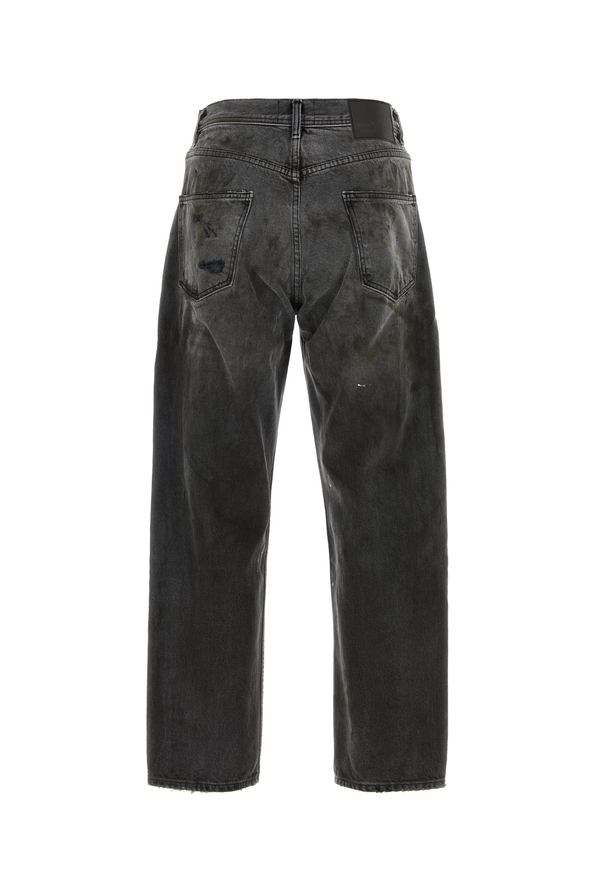 Baggy jeans realized in vintage-effect pure cotton denim with intentional dirties enriched by logoed label at the back.