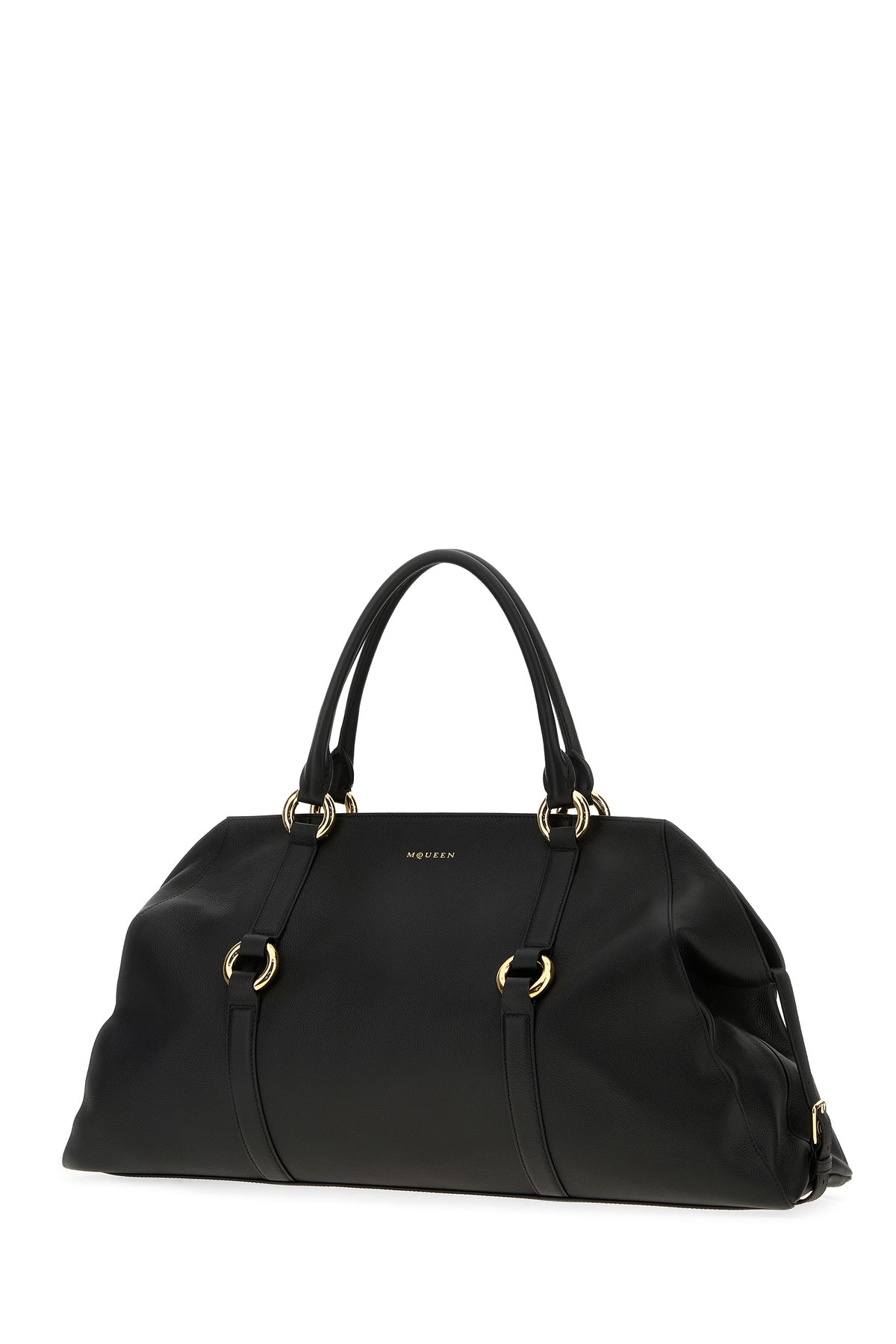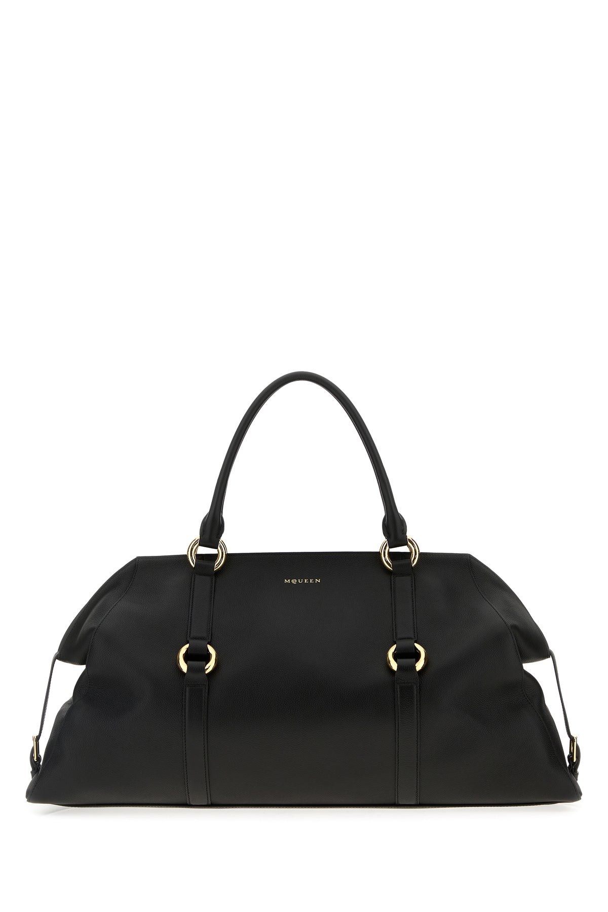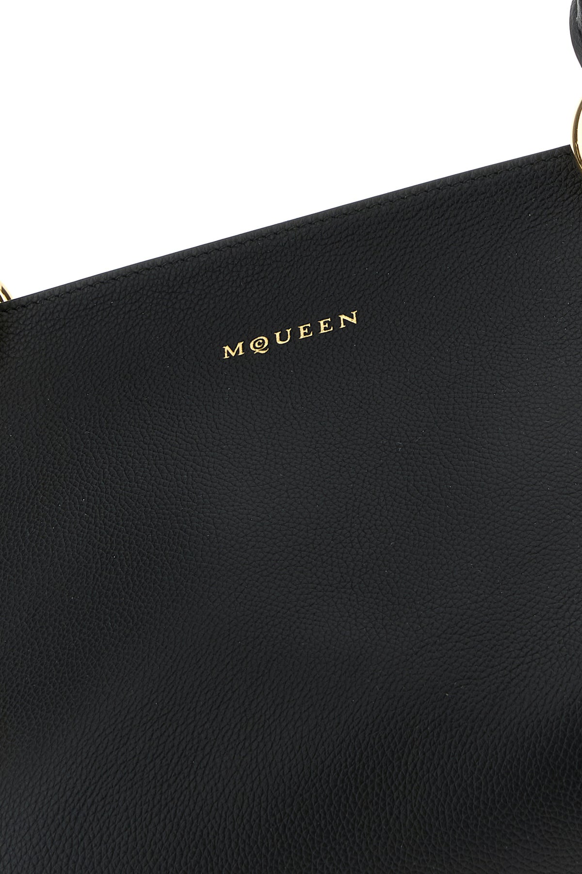 Handbag realized in pebble calf leather characterized by laminated McQueen print at the front enriched by Harness straps.