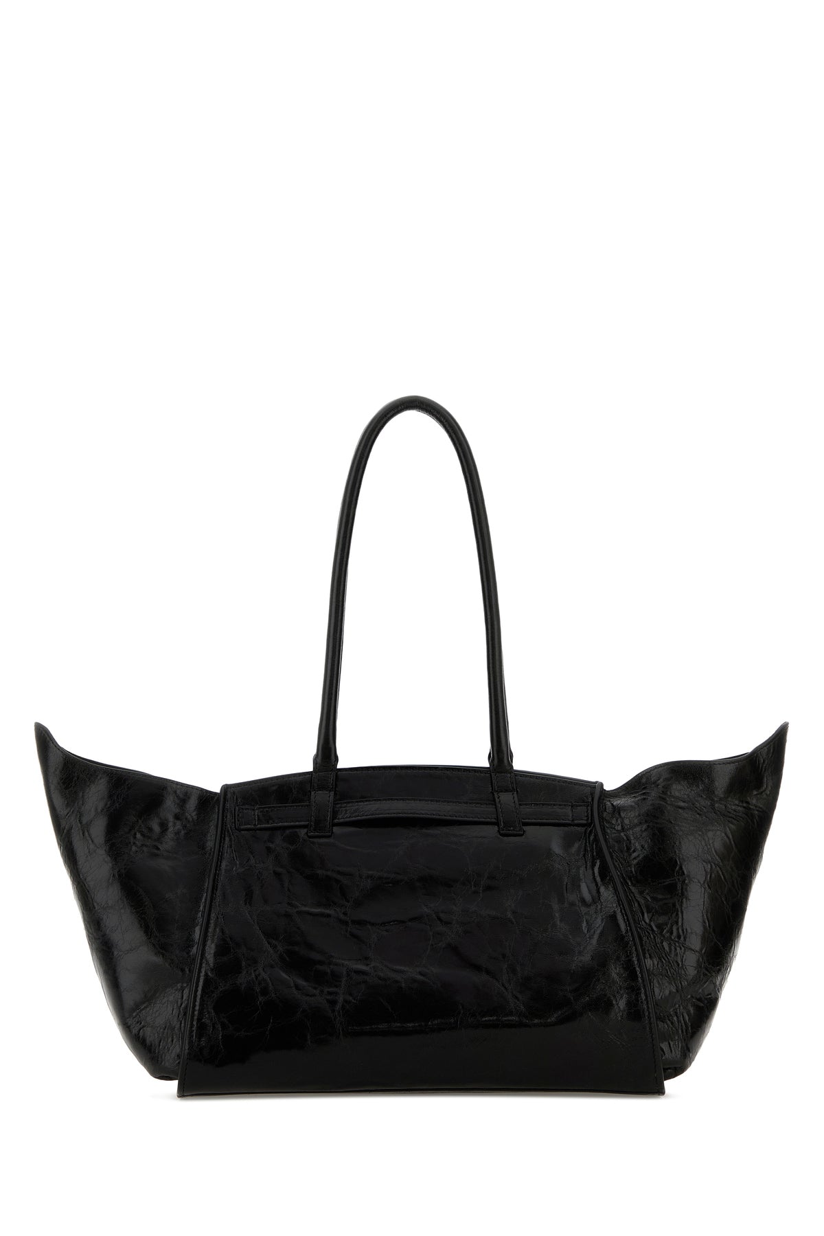Handbag realized in creased-effect leather characterized by embossed logo on the hemline enriched by decorative strap with metal logoed buckle at the front.