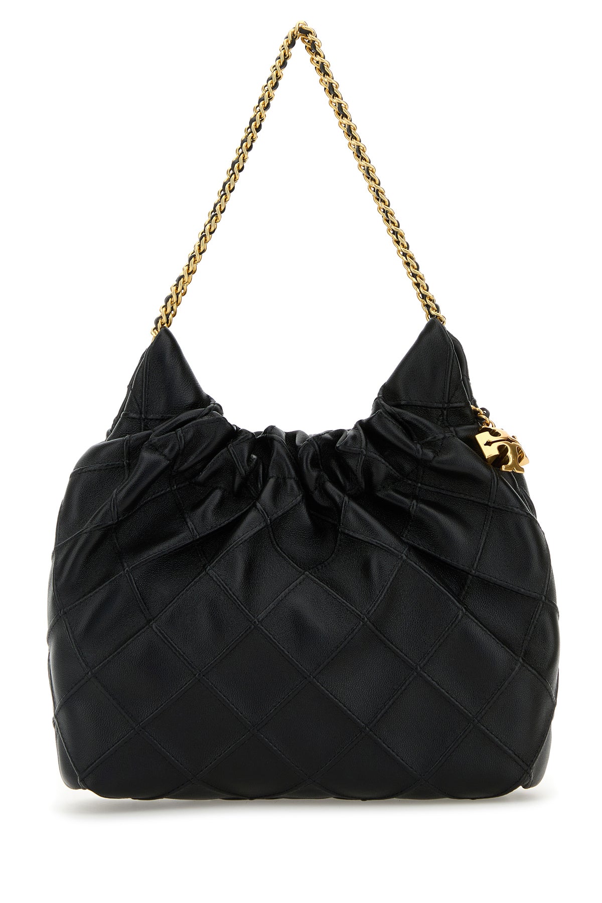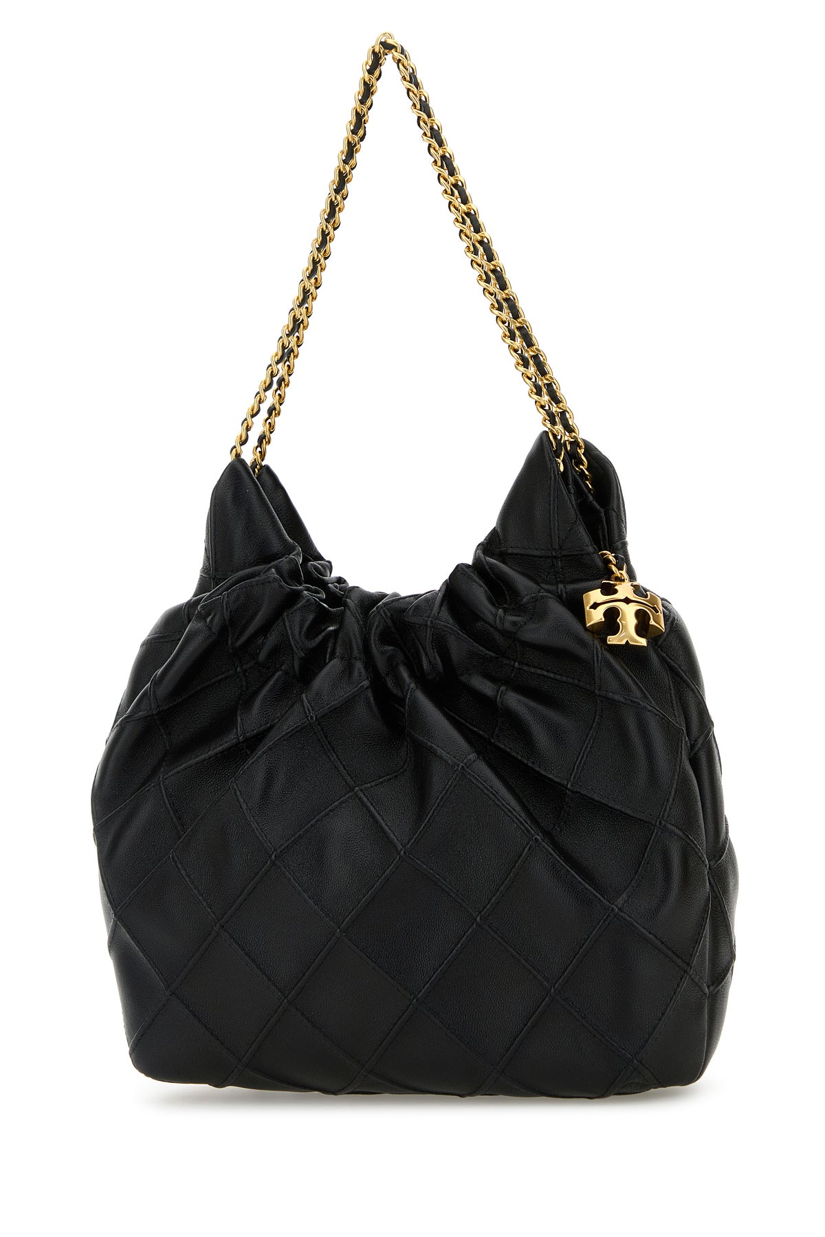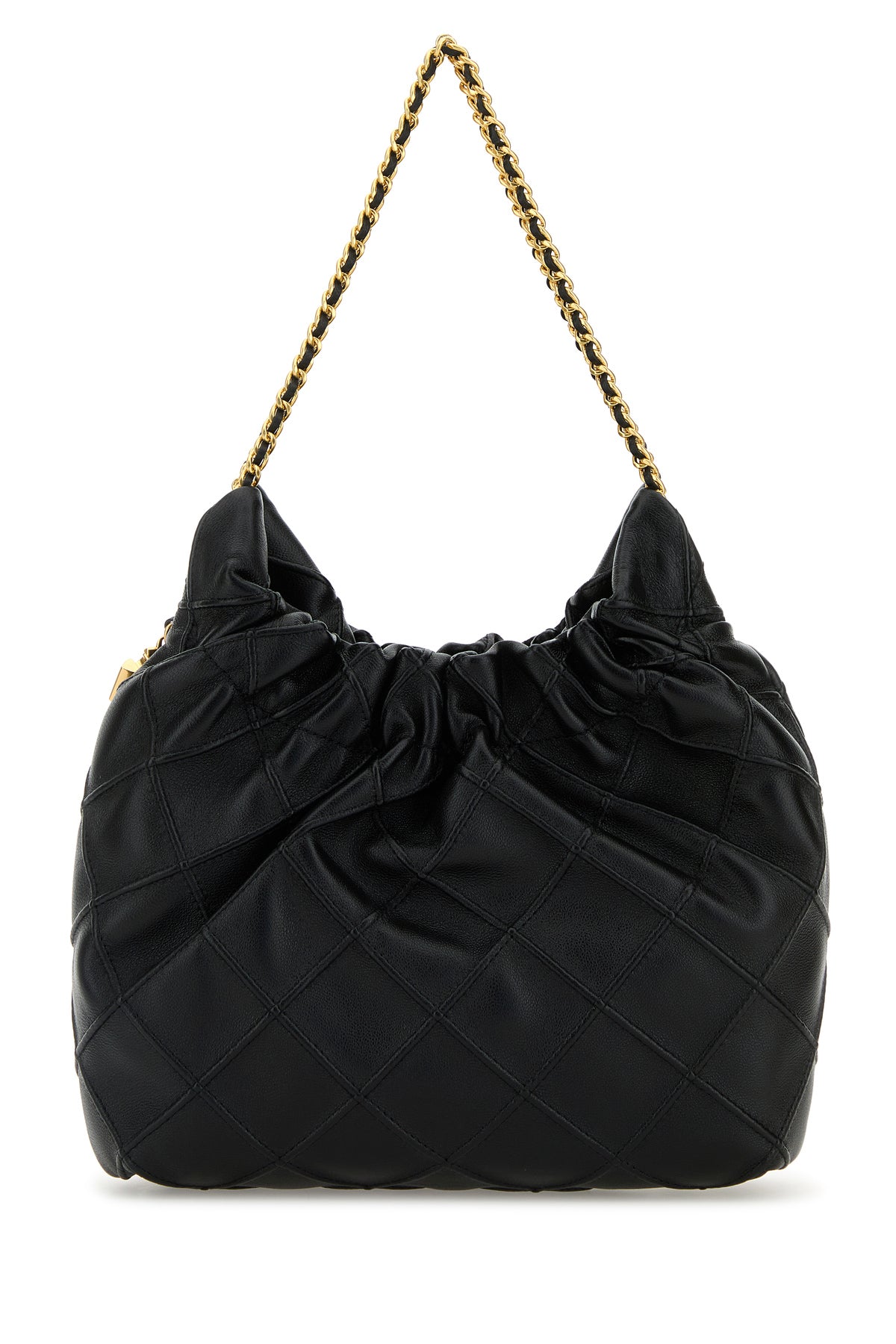 Handbag realized in quilted leather enriched by metal logoed charm.