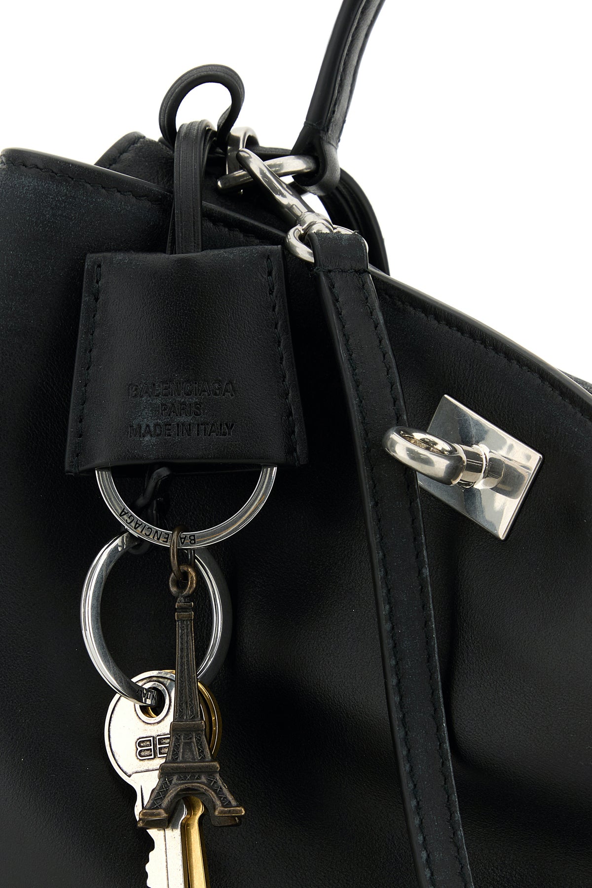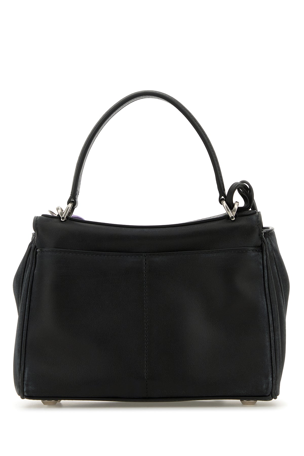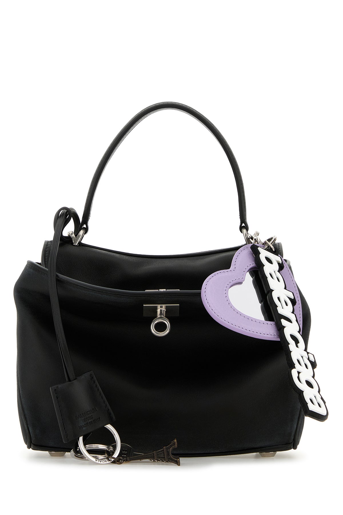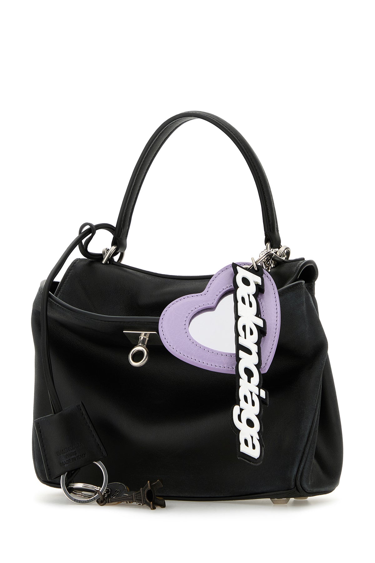 Handbag realized in vintage-effect smooth calf leather enriched by detachable peculiar logoed accessory.
