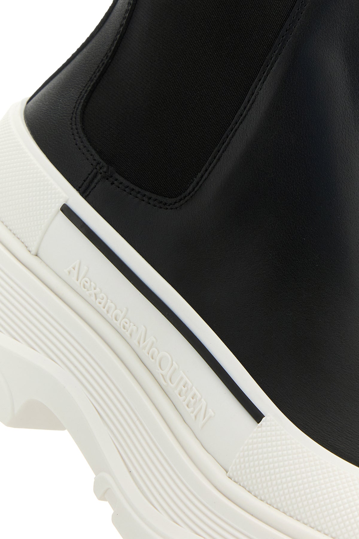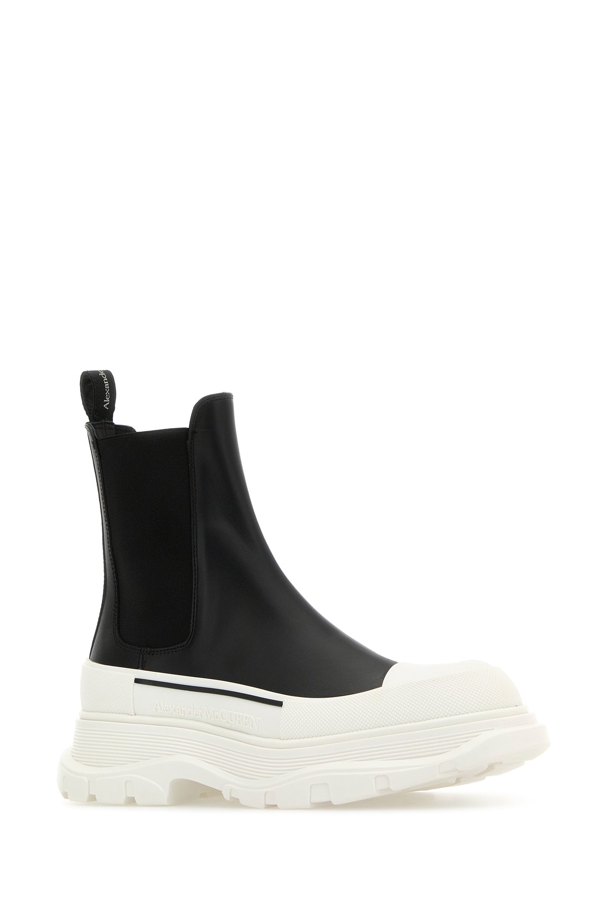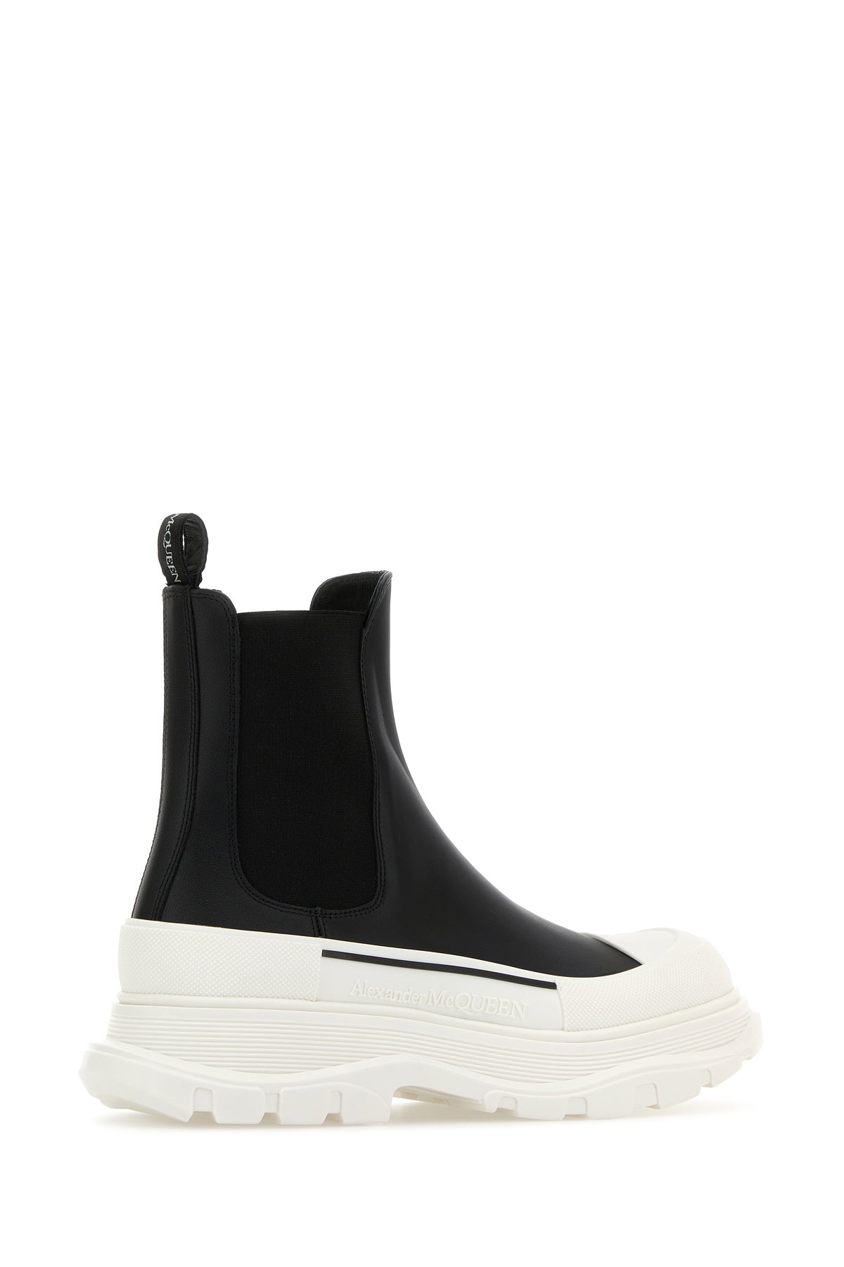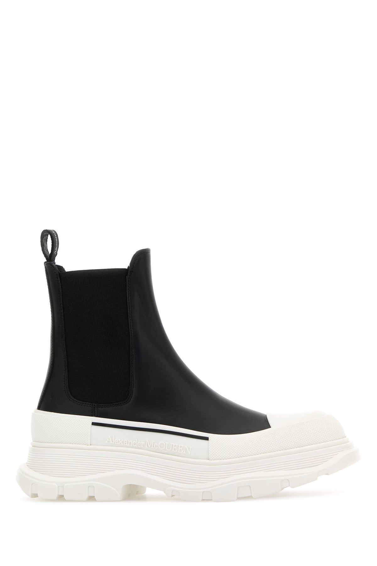 Ankle boots realized in nappa leather with elastic fabric inserts on the sides characterized by Alexander McQueen motif in relief on the side.