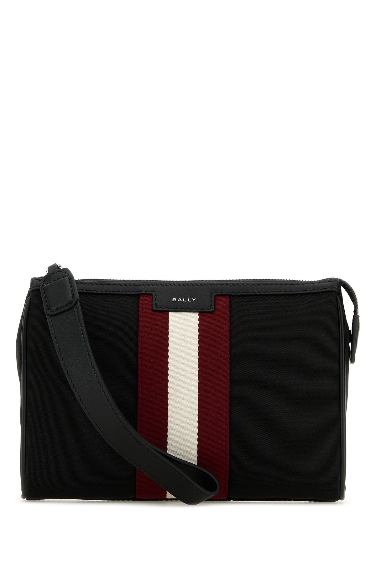 Clutch realized in nylon characterized by contrasting logoed print at the front enrcihed by Bally Stripe at the front.