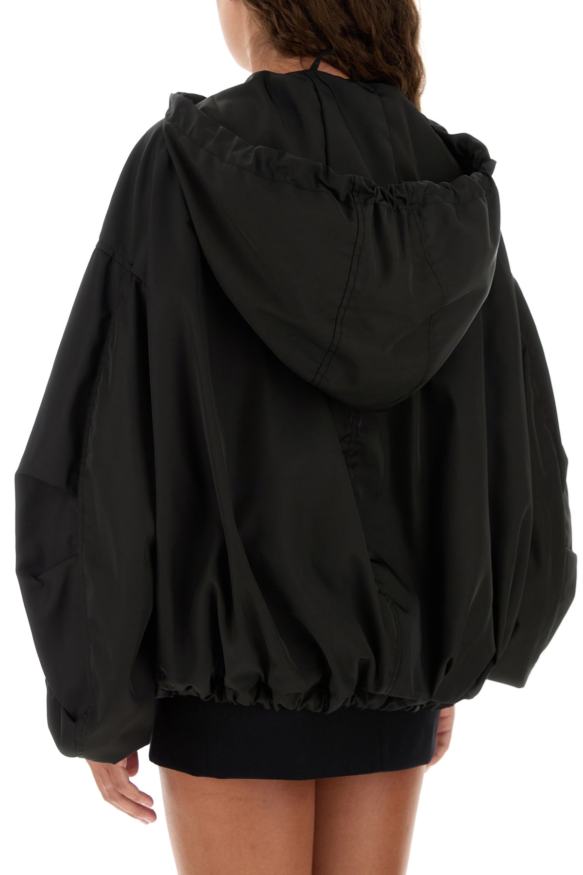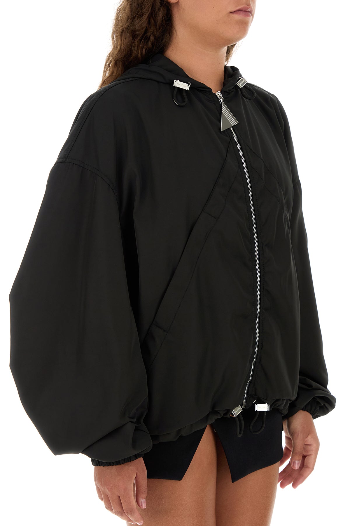 Bomber jacket realized in polyester characterized by drawstring maxi hood.