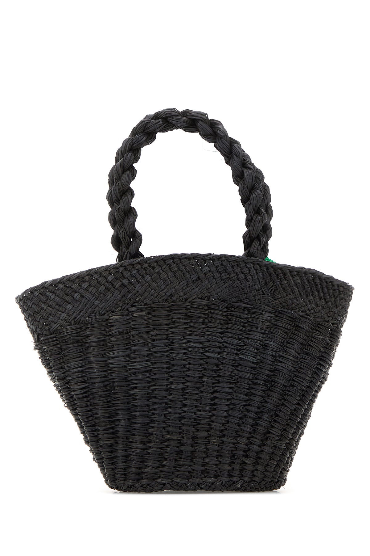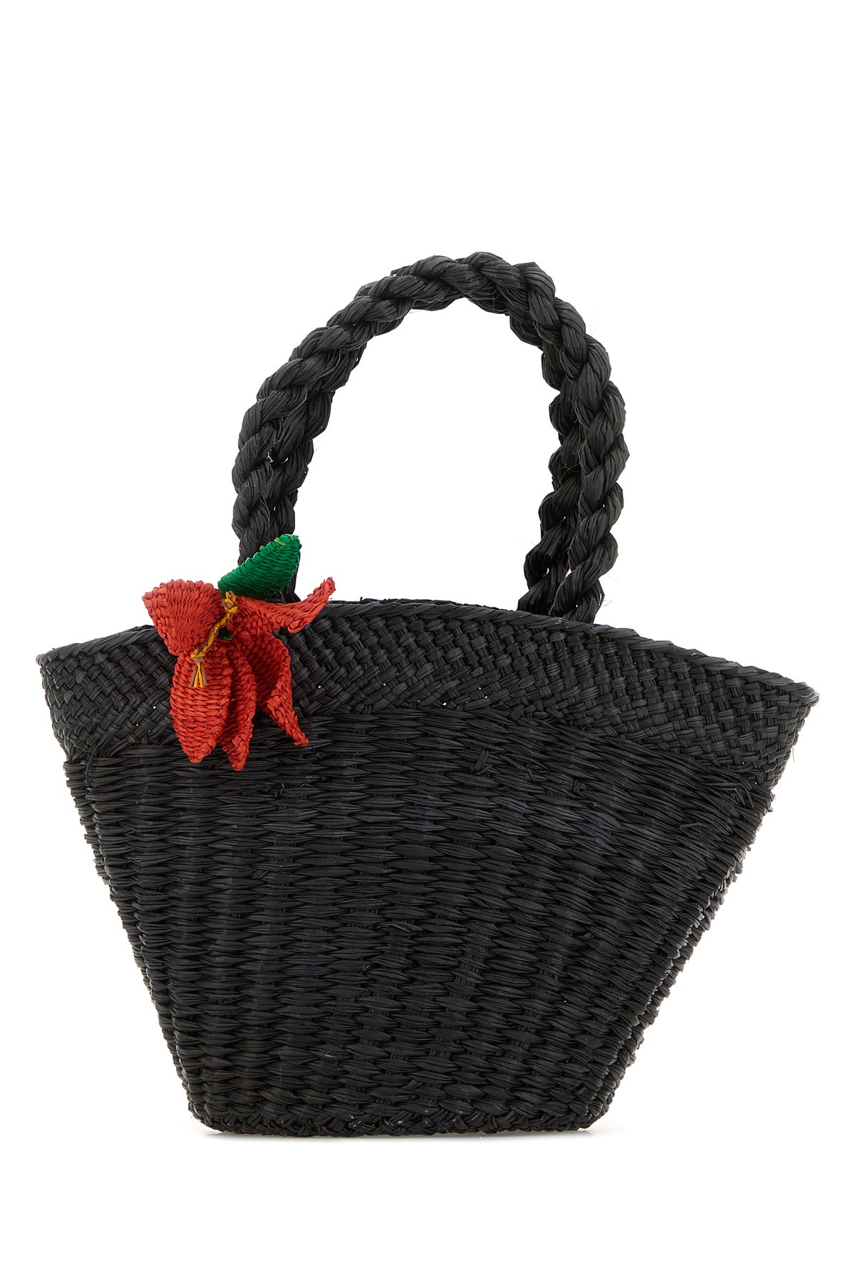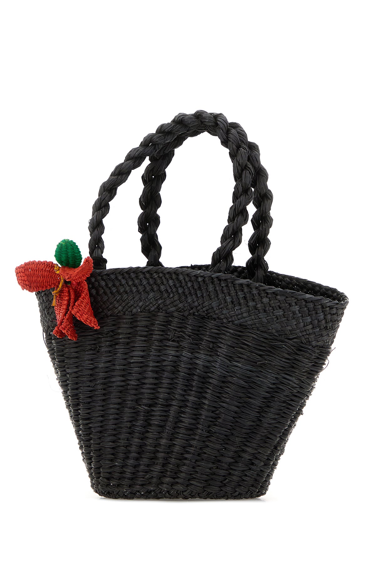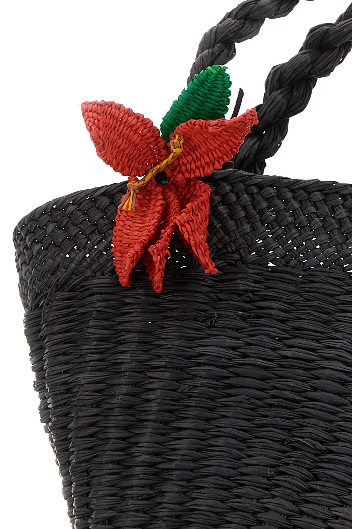 Bucket bag realized in raffia enriched by floral patch at the front.