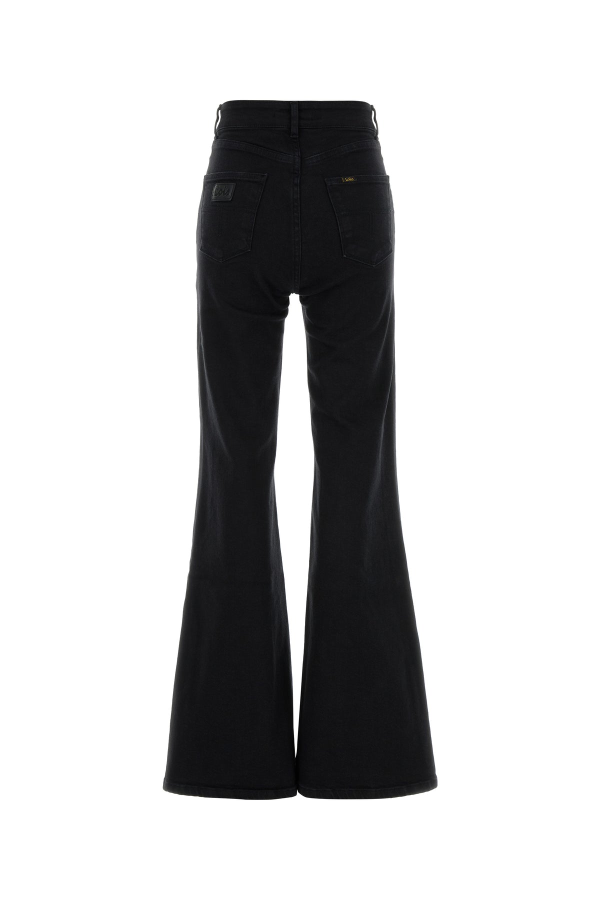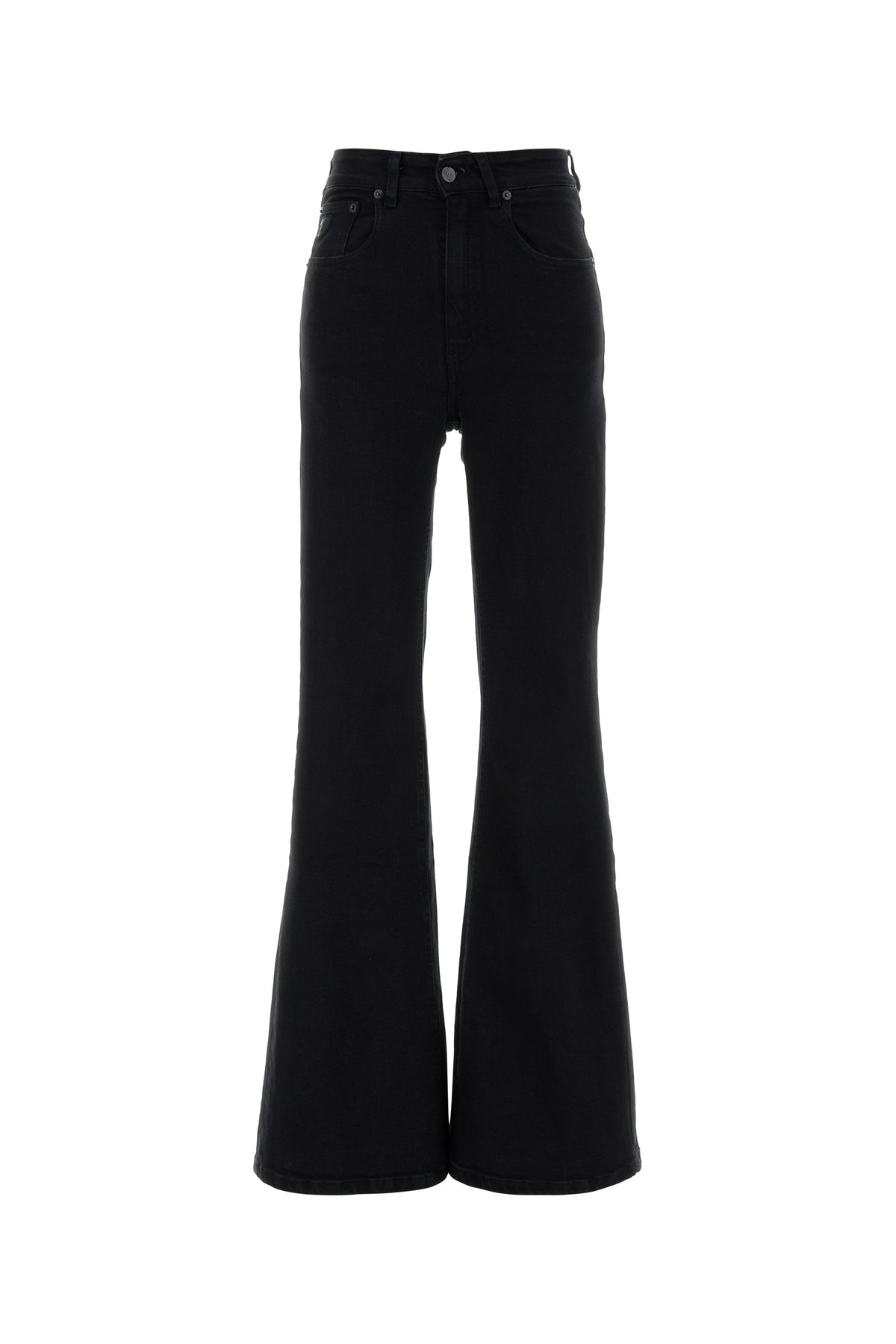 Flared jeans realized in stretch cotton denim enriched by logoed label at the back.