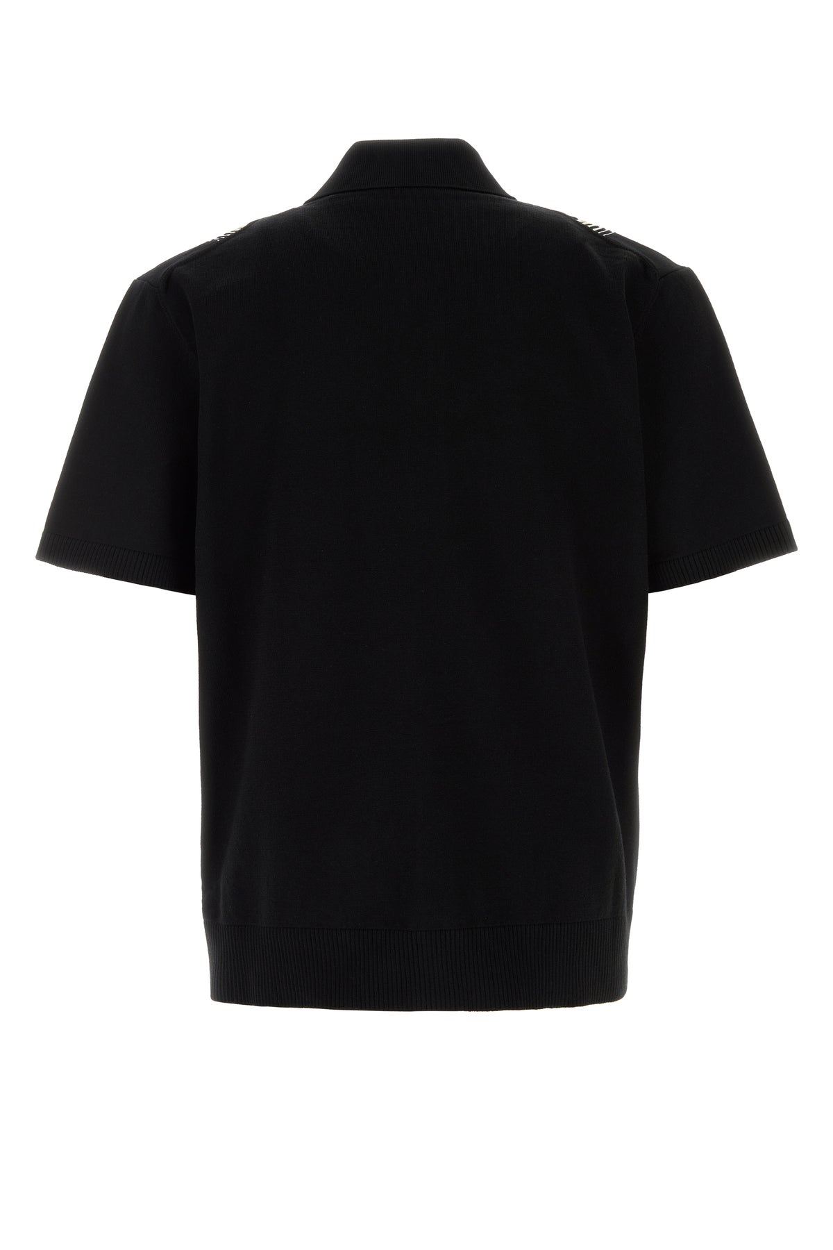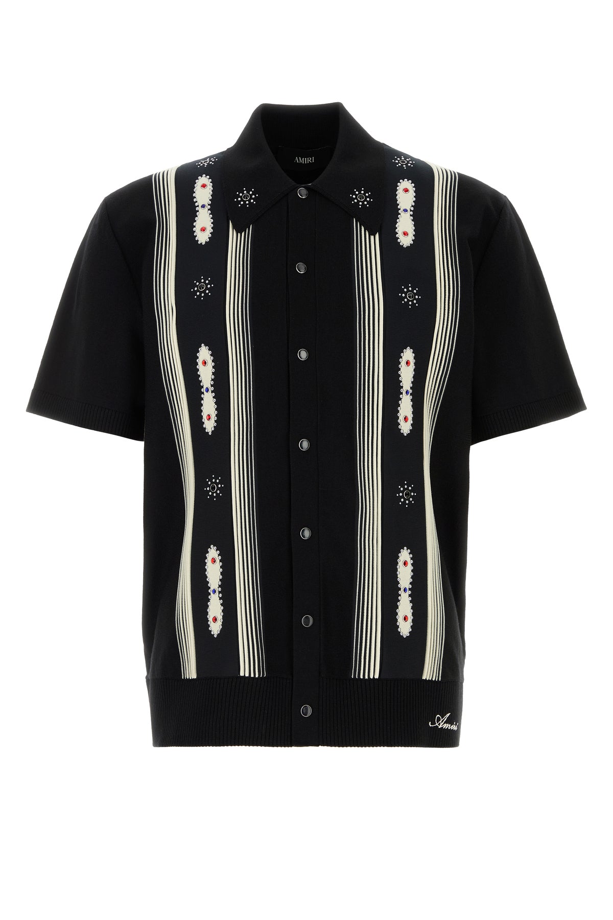 Short-sleeves shirt realized in wool blend characterized by embroidered logo on the hemline and striped embroidery enriched by jewel embellishments at the front.