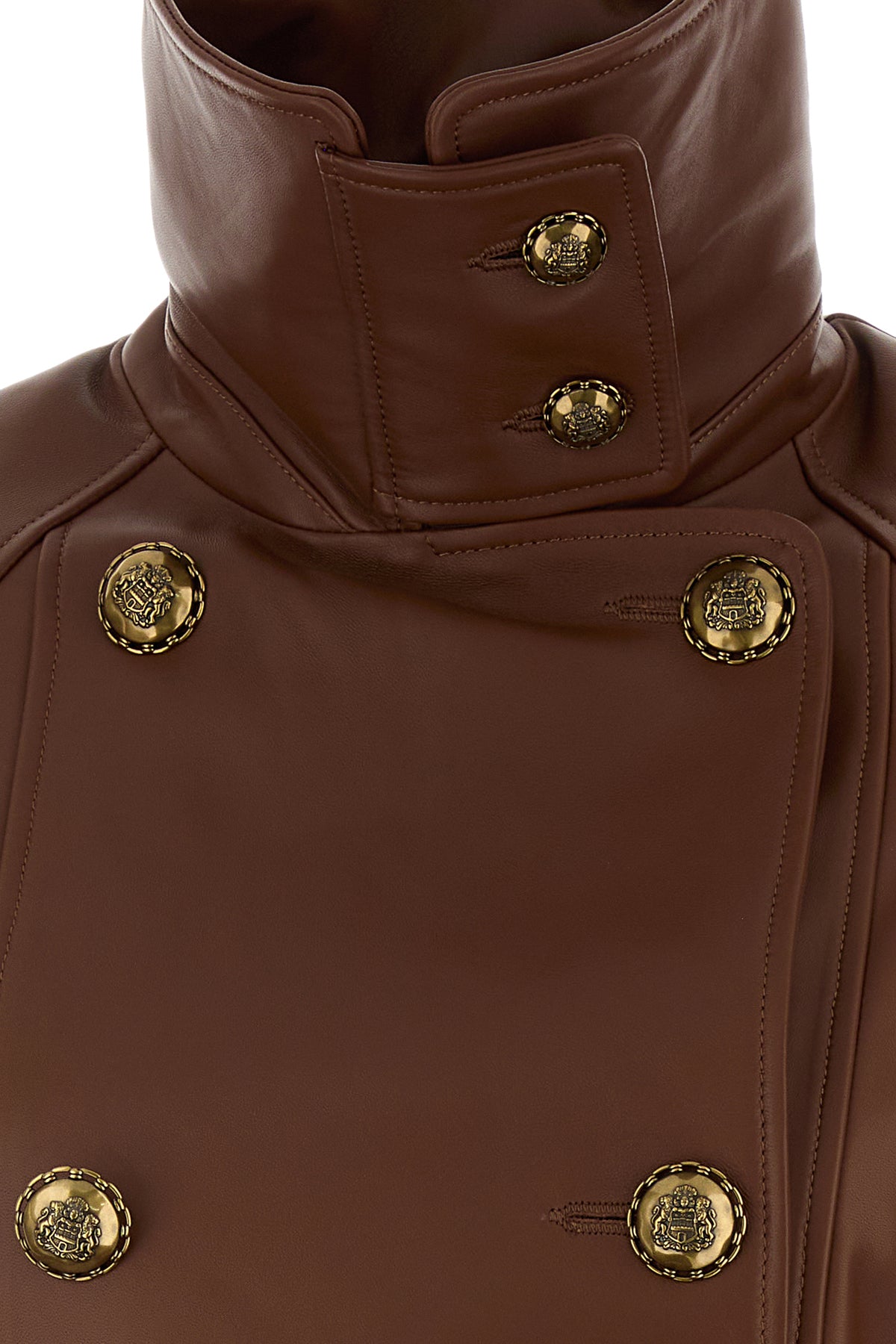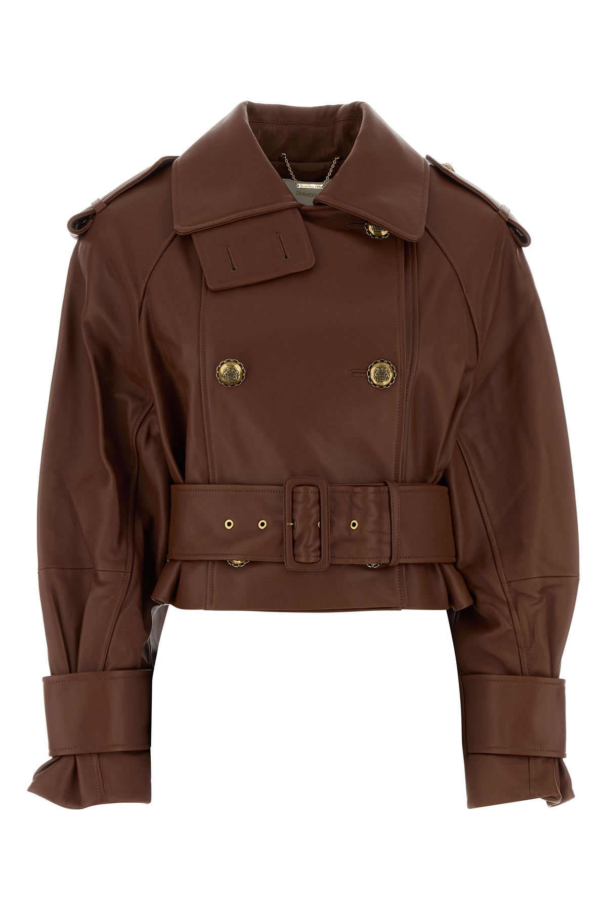 Short-cut trench coat realized in leather enriched by detachable tonal belt at the waist.