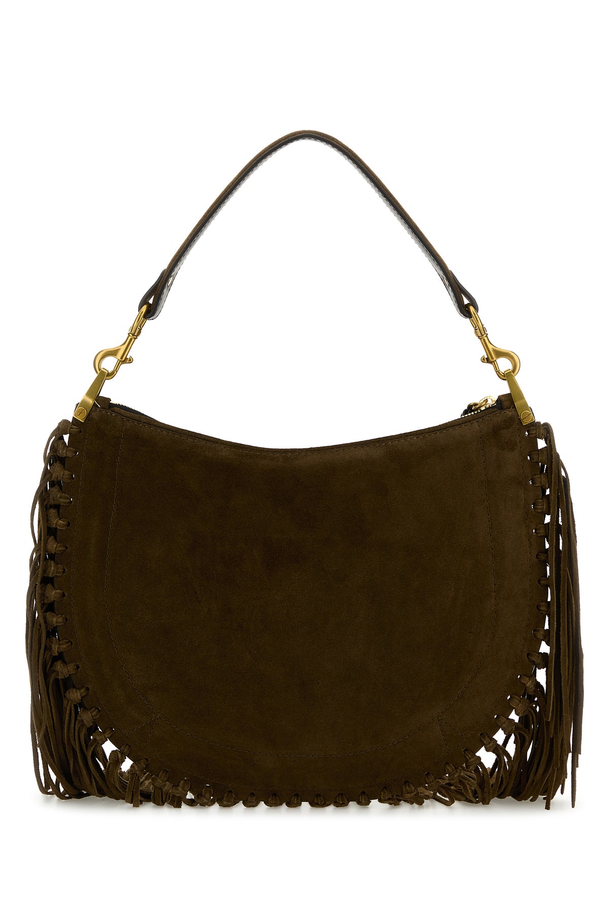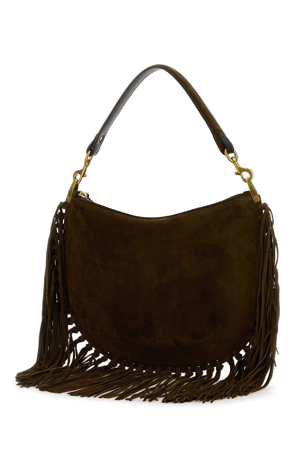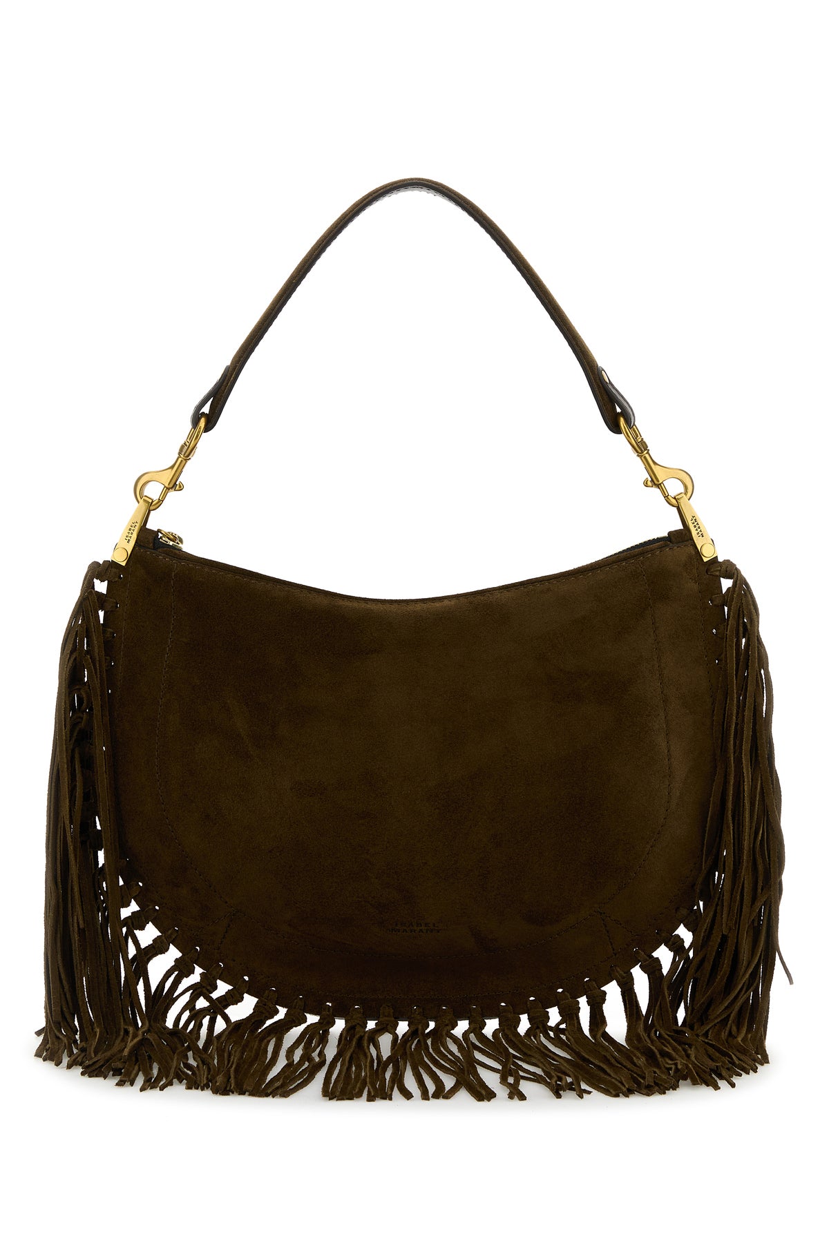 Shoulder bag realized in suede characterized by embossed logo at the front enriched by fringes on the hemline.