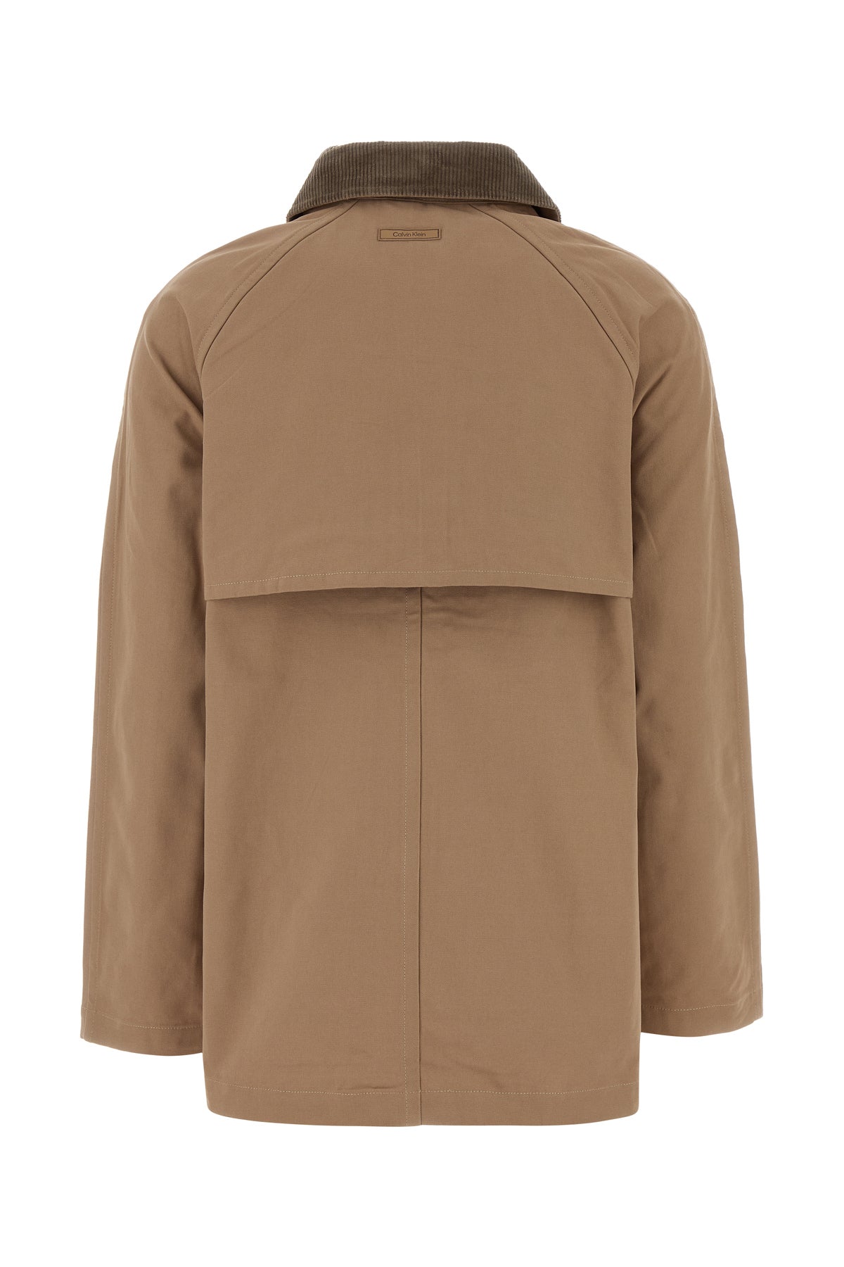Short-cut overcoat realized in pure cotton enriched by tonal logoed patch at the back.