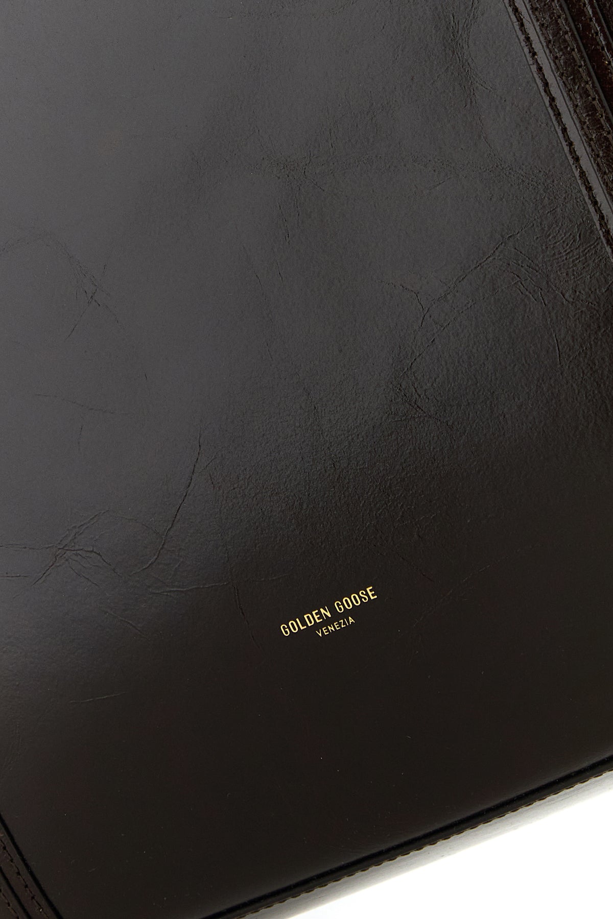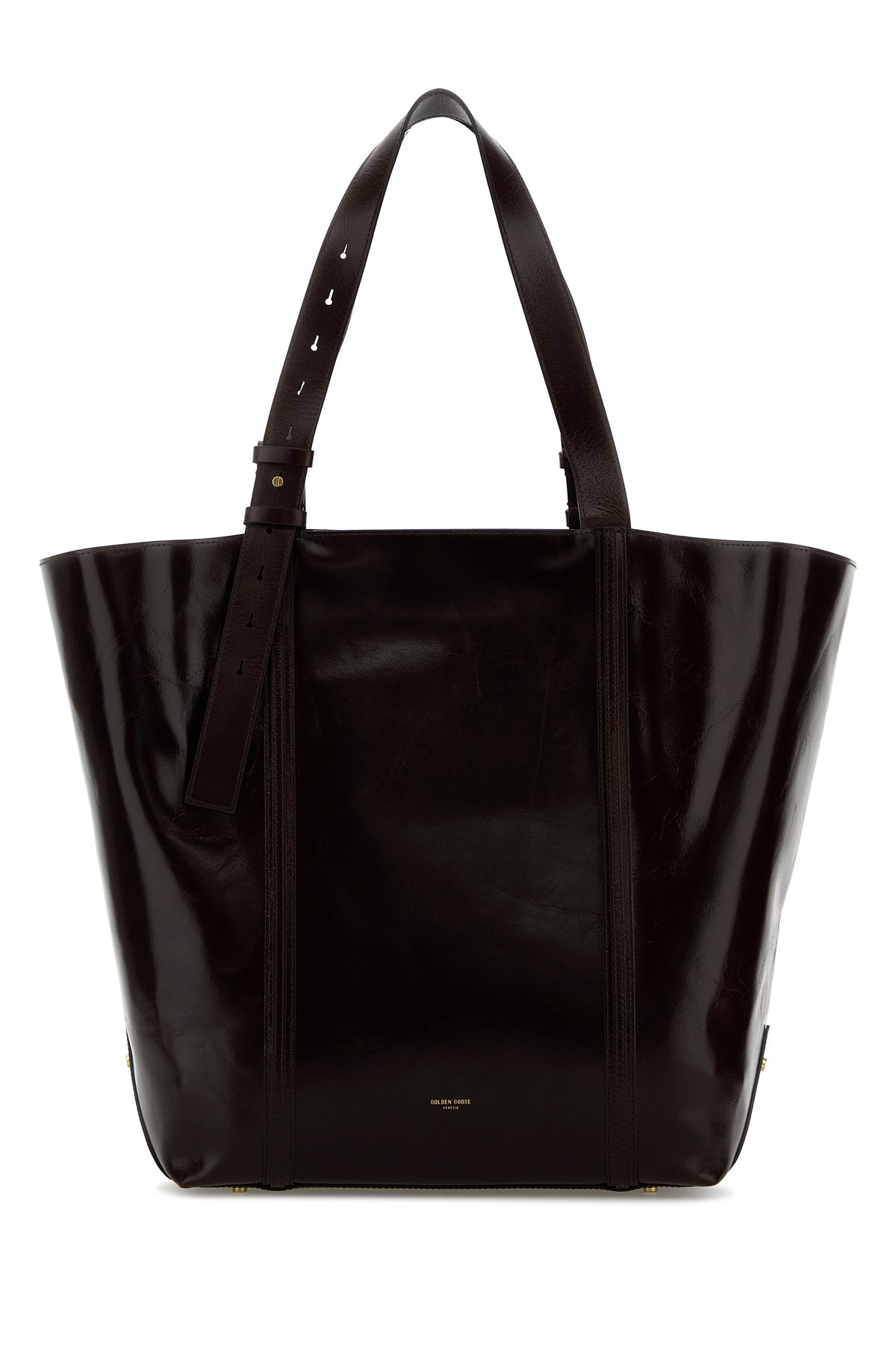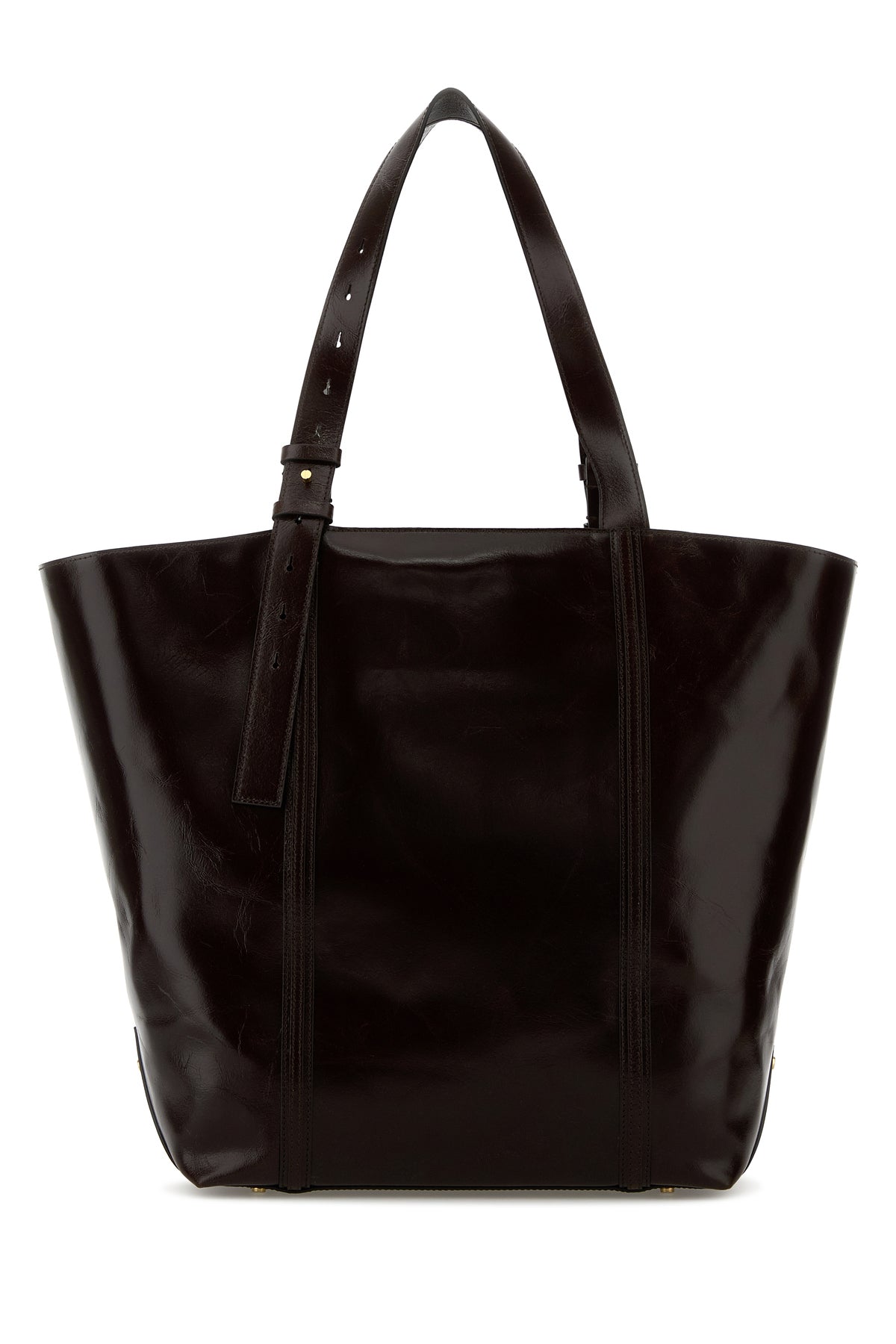 Shopping bag realized in polished-finish leather characterized by laminated printed logo at the front.