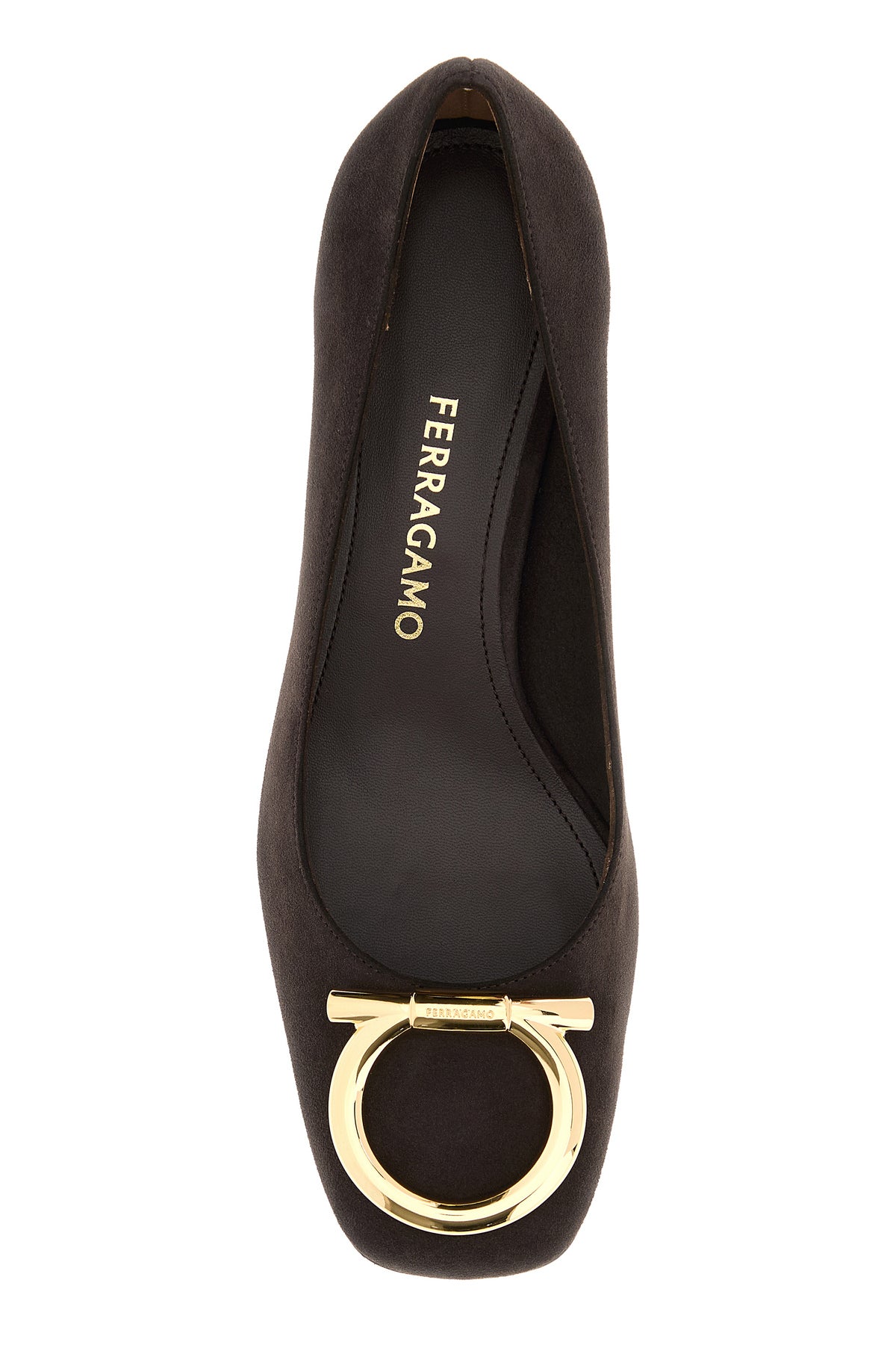 Pumps realized in suede enriched by metal Gancini detail at the front.