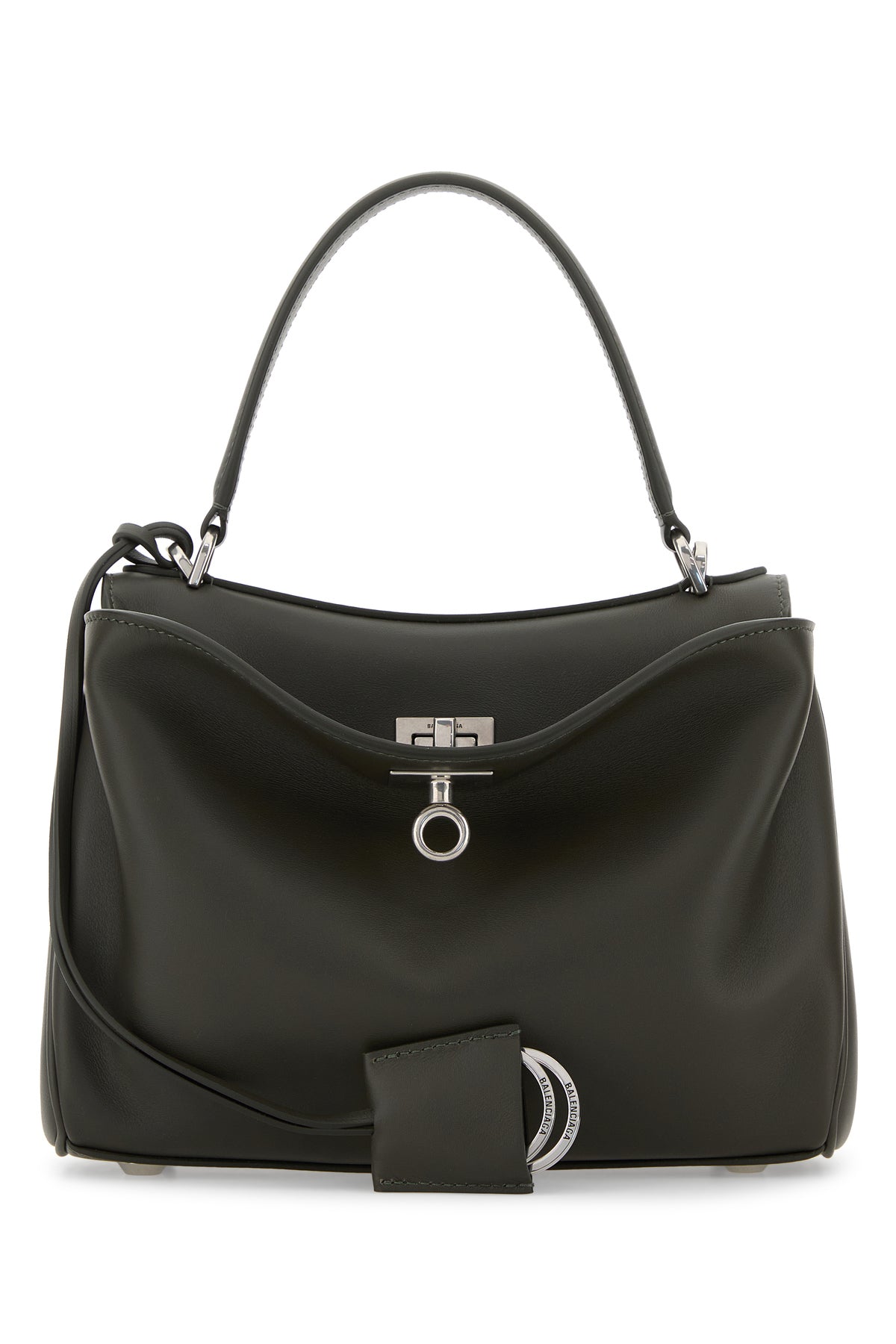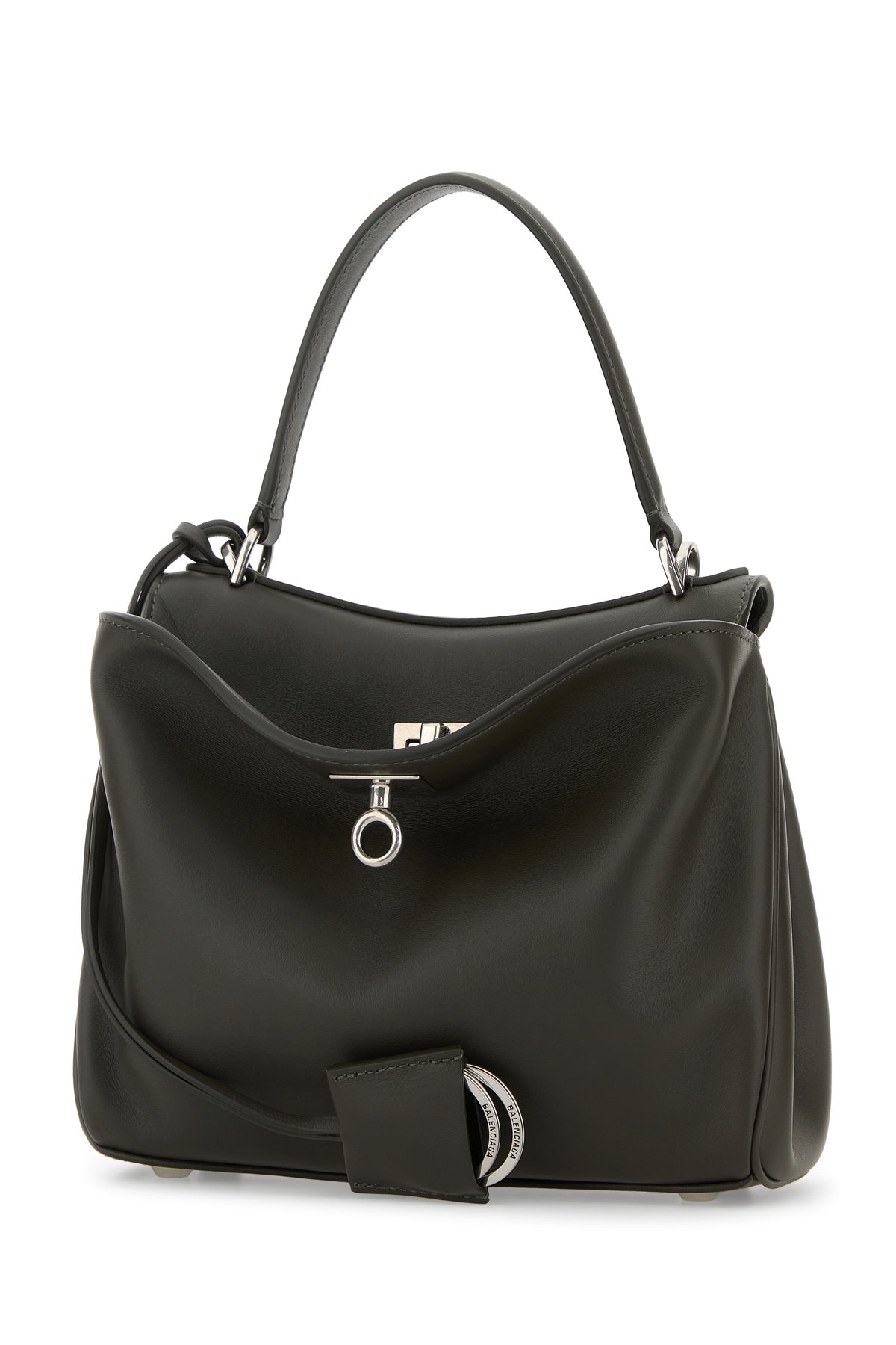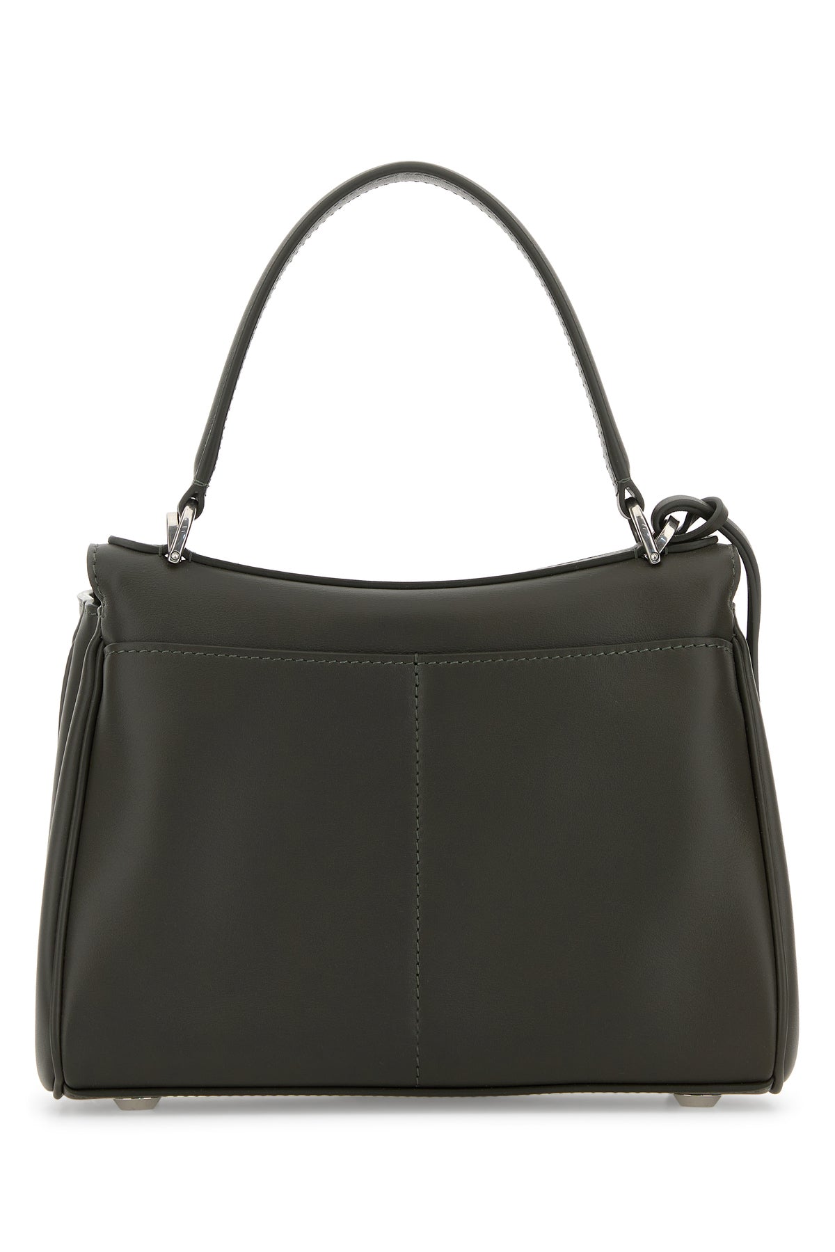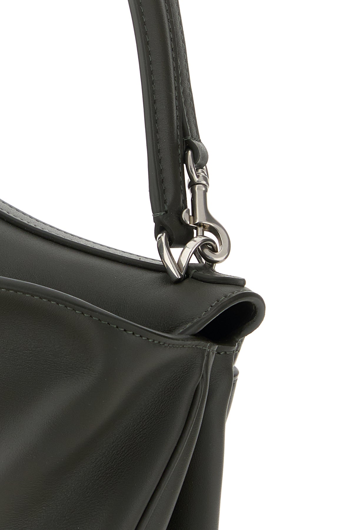 Handbag realized in calf leather enriched by detachable tonal leather and metal keyring accessory.