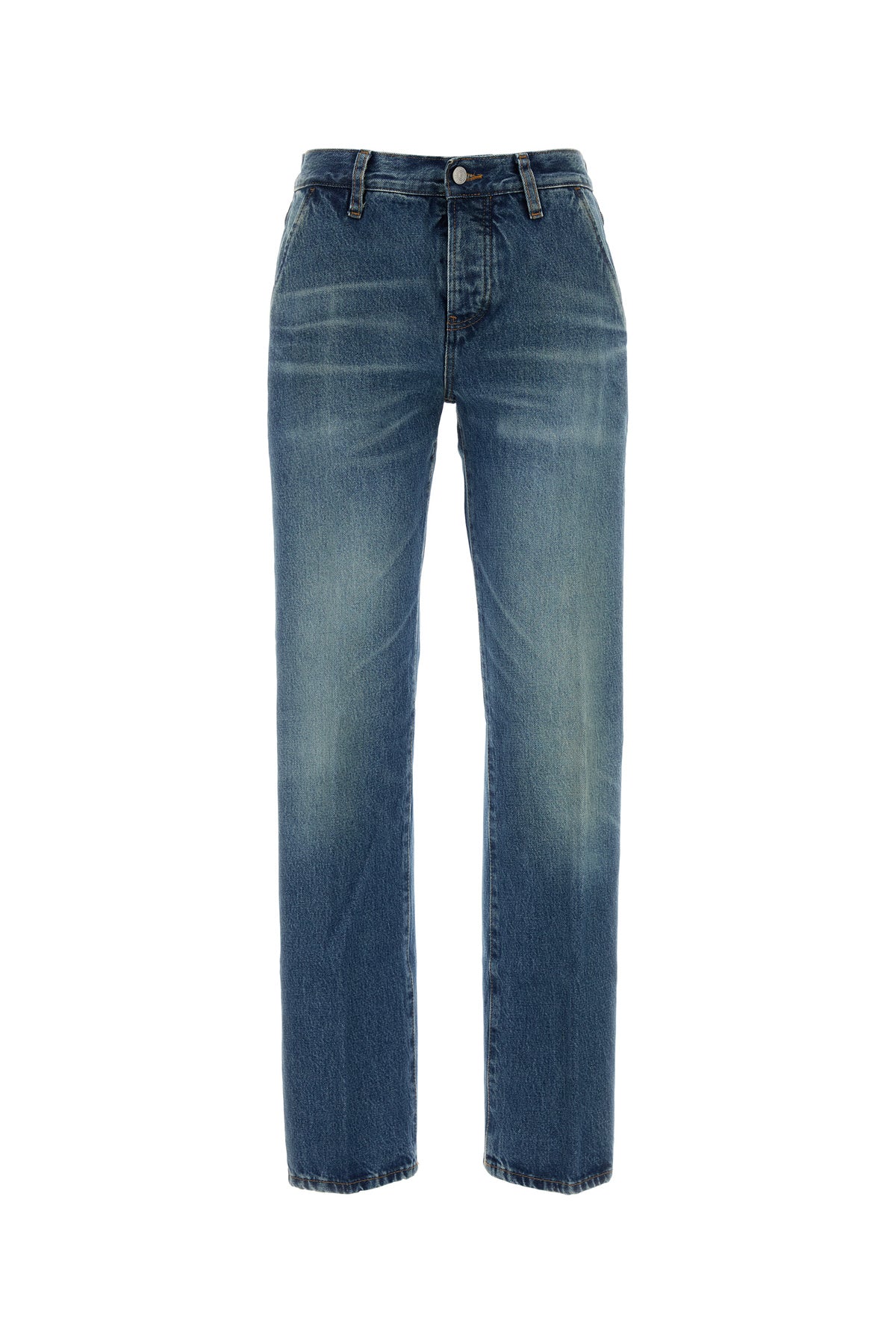 Jeans realized in stonewashed pure cotton denim characterized by central ironed pleats.