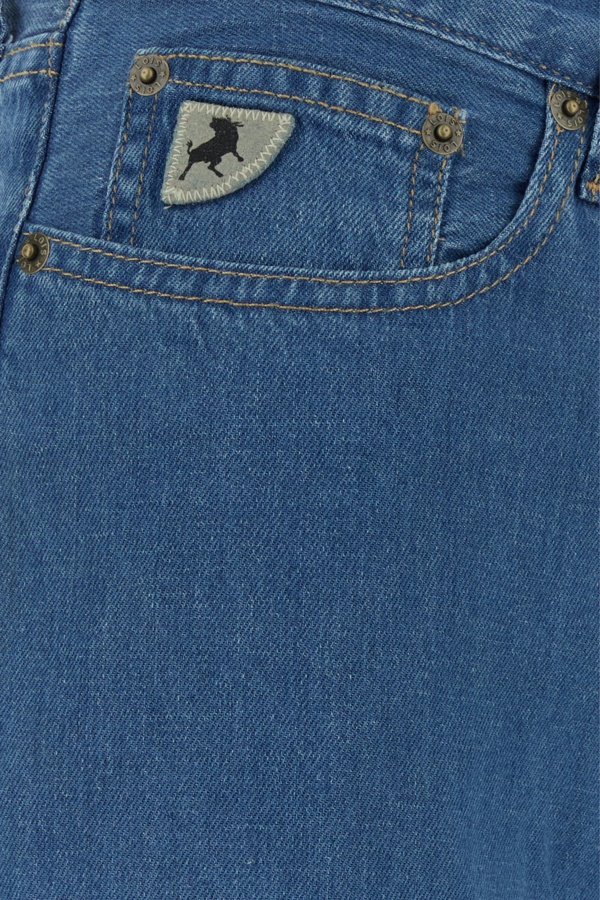 Wide-leg jeans realized in denim enriched by logoed label at the front and at the back.