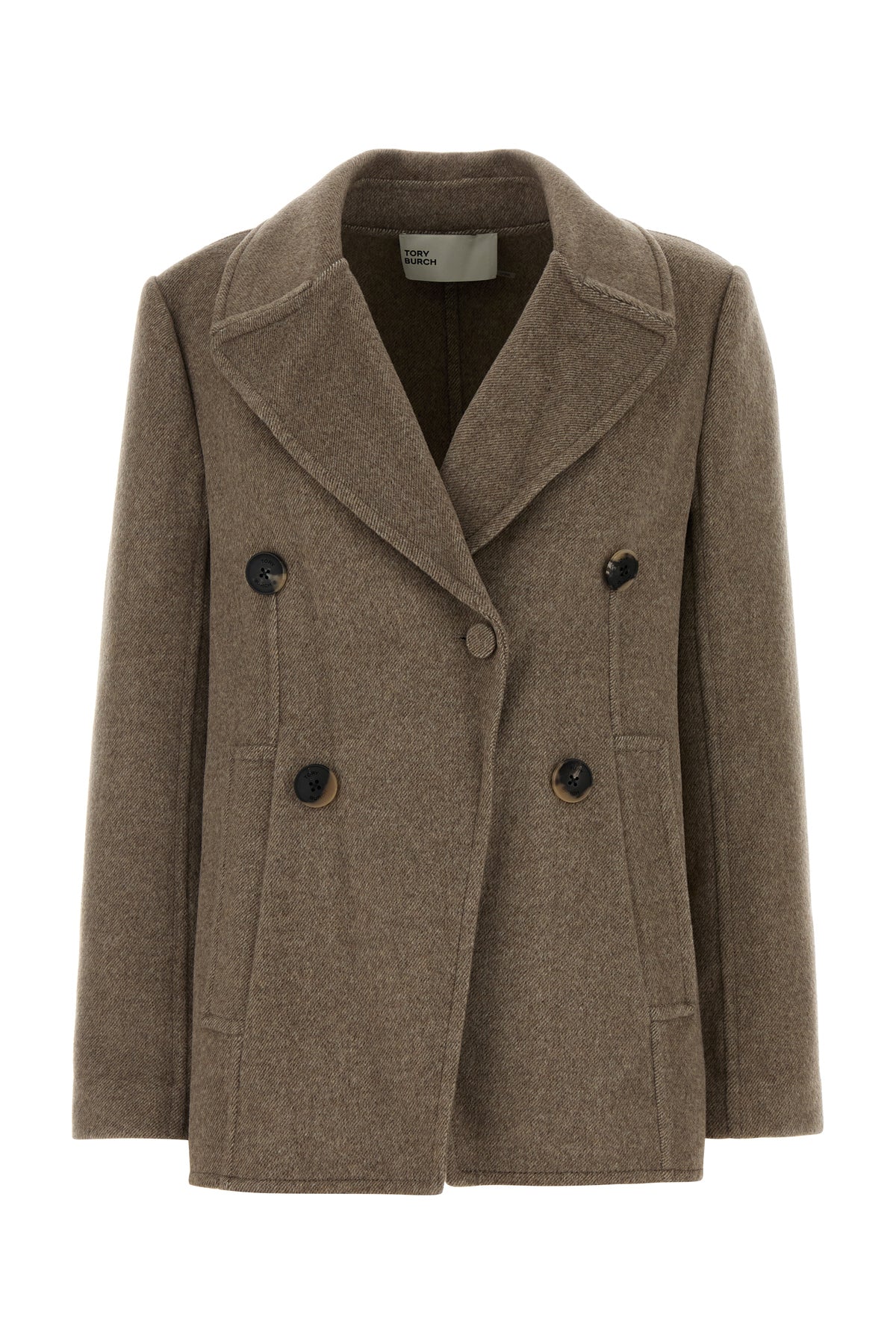 Short-cut coat realized in wool blend.