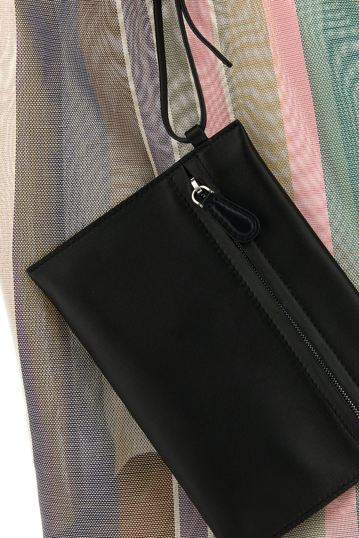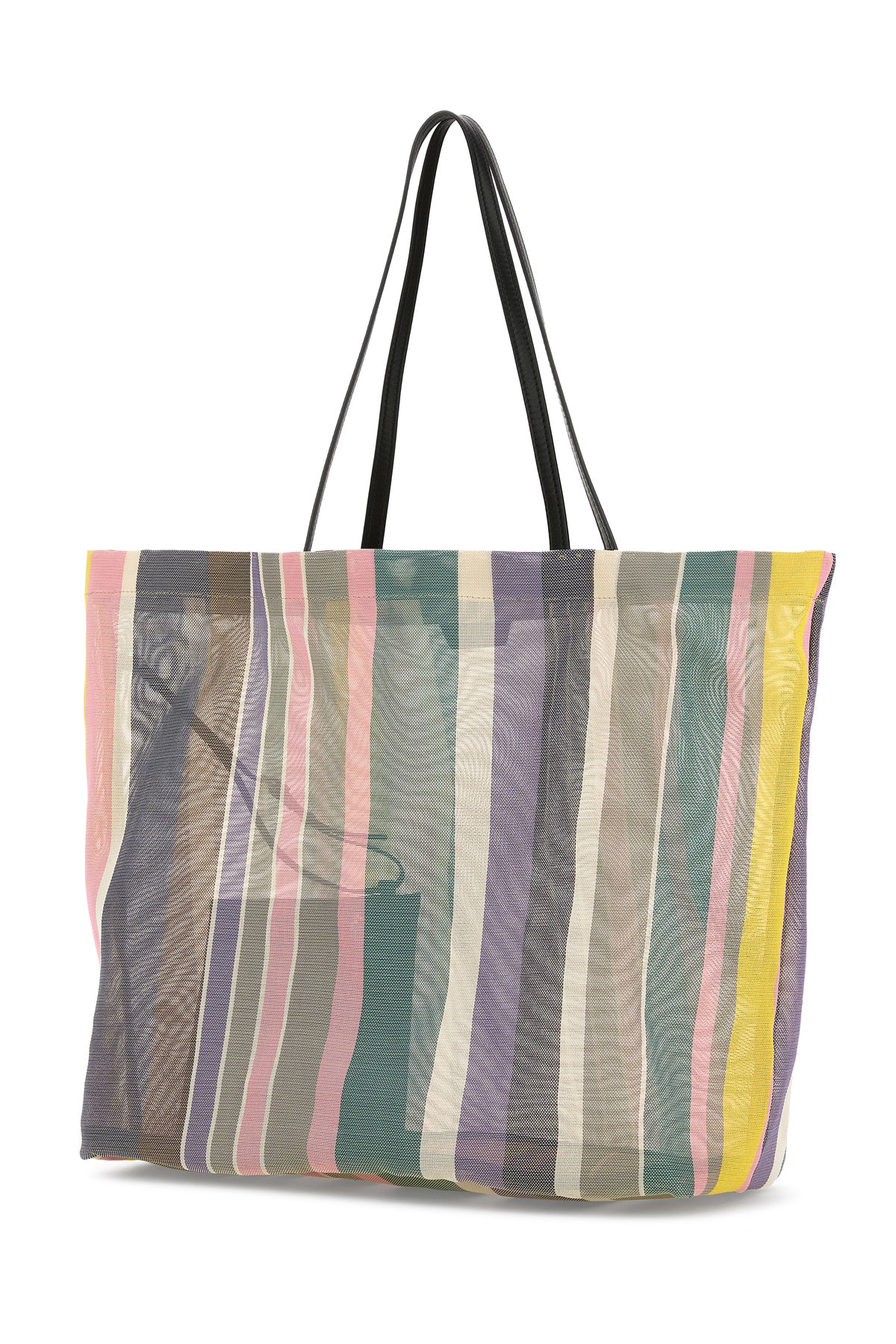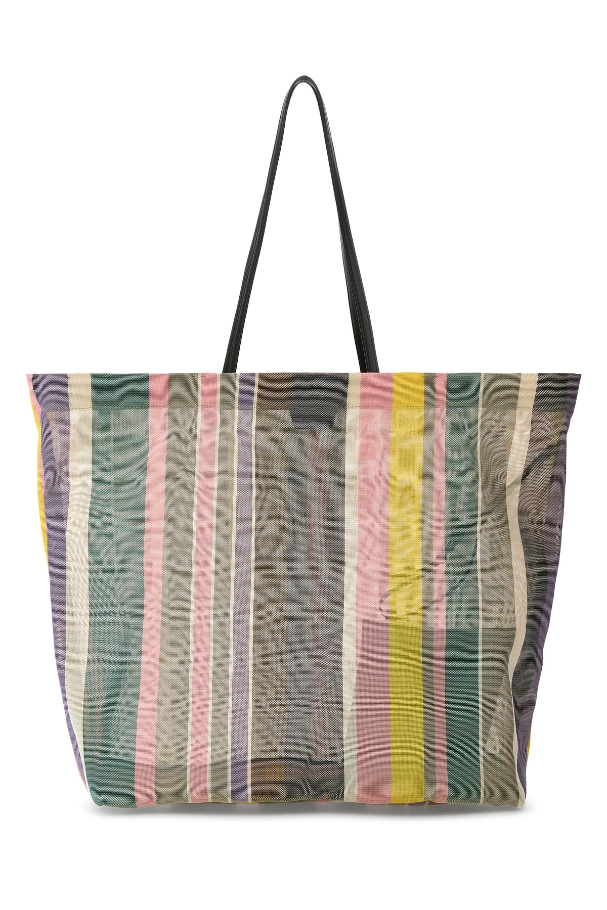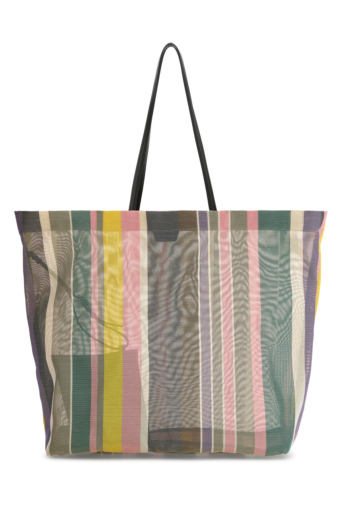Shopping bag realized in mesh characterized by striped embroidery on the entire surface.