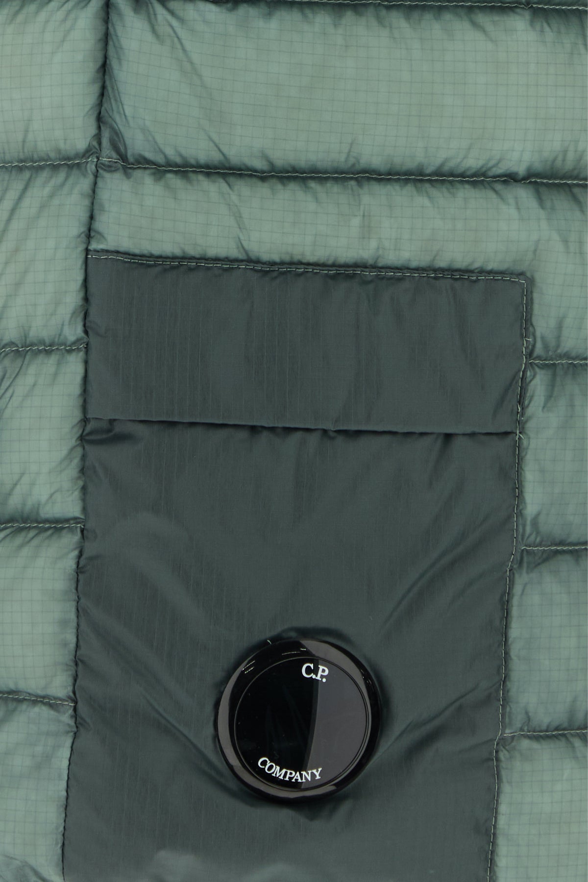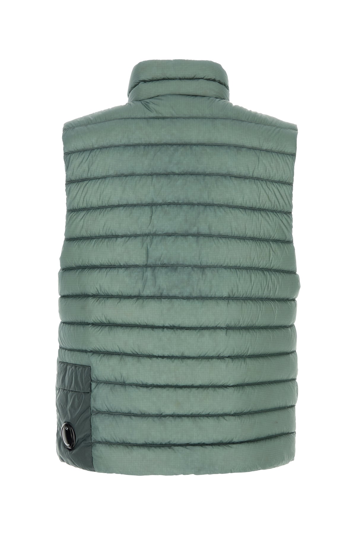 Sleeveless down jacket realized in quilted nylon characterized by high collar.