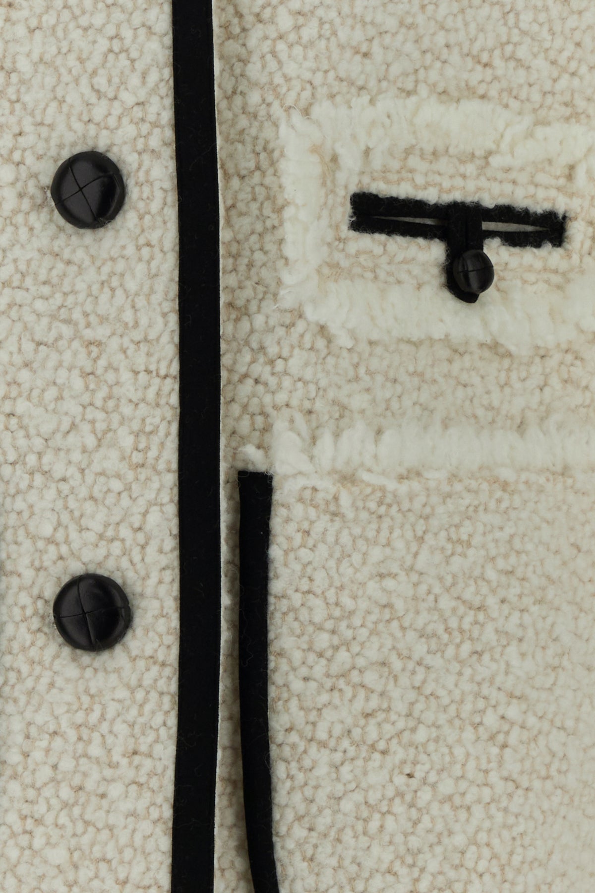 Short-cut coat realized in tweed bouclé enriched by contrasting trimmings.