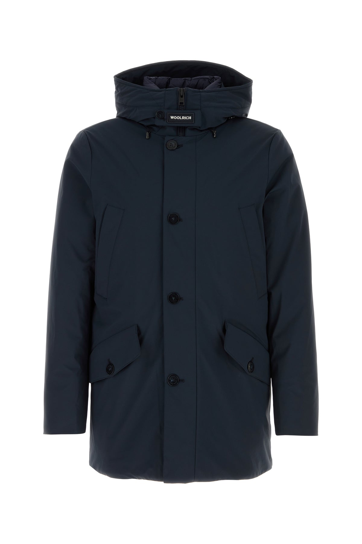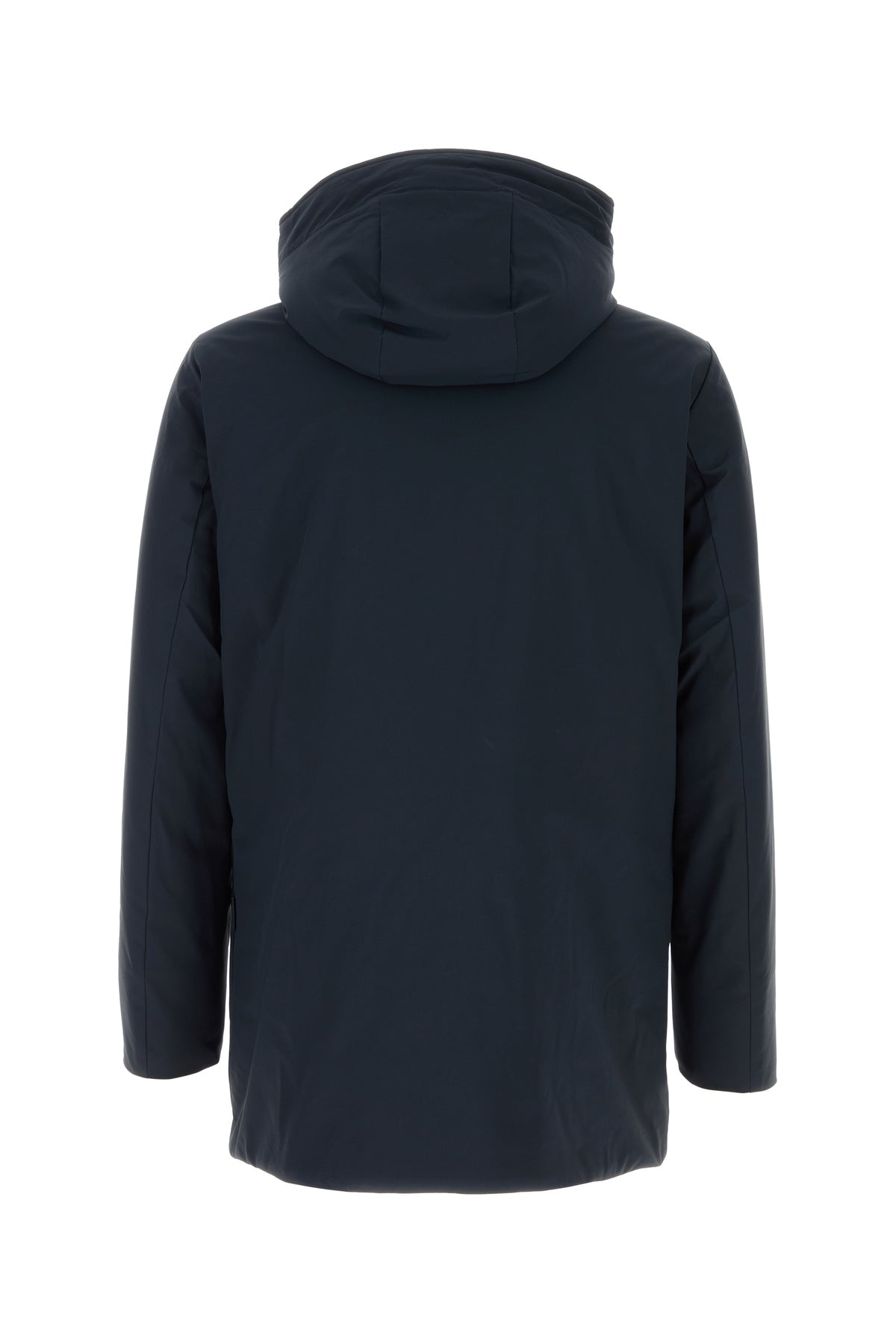 Down jacket realized in stretch nylon enriched by logoed label at the top.