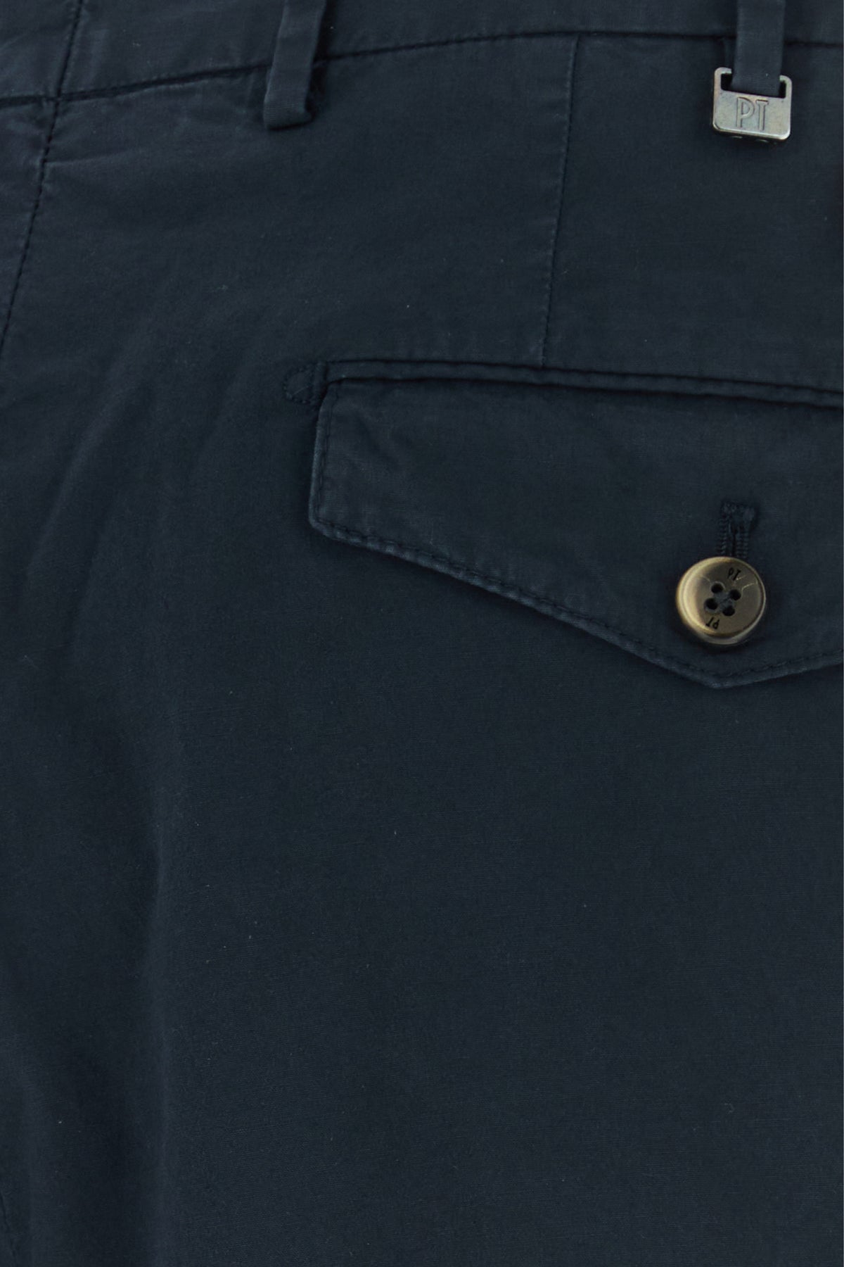 Pant realized in stretch cotton enriched by metal logoed detail at the back.