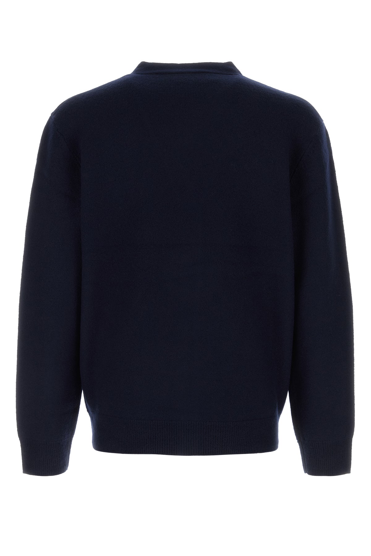 Cardigan realized in pure virgin wool characterized by contrasting printed logo on the hemline.