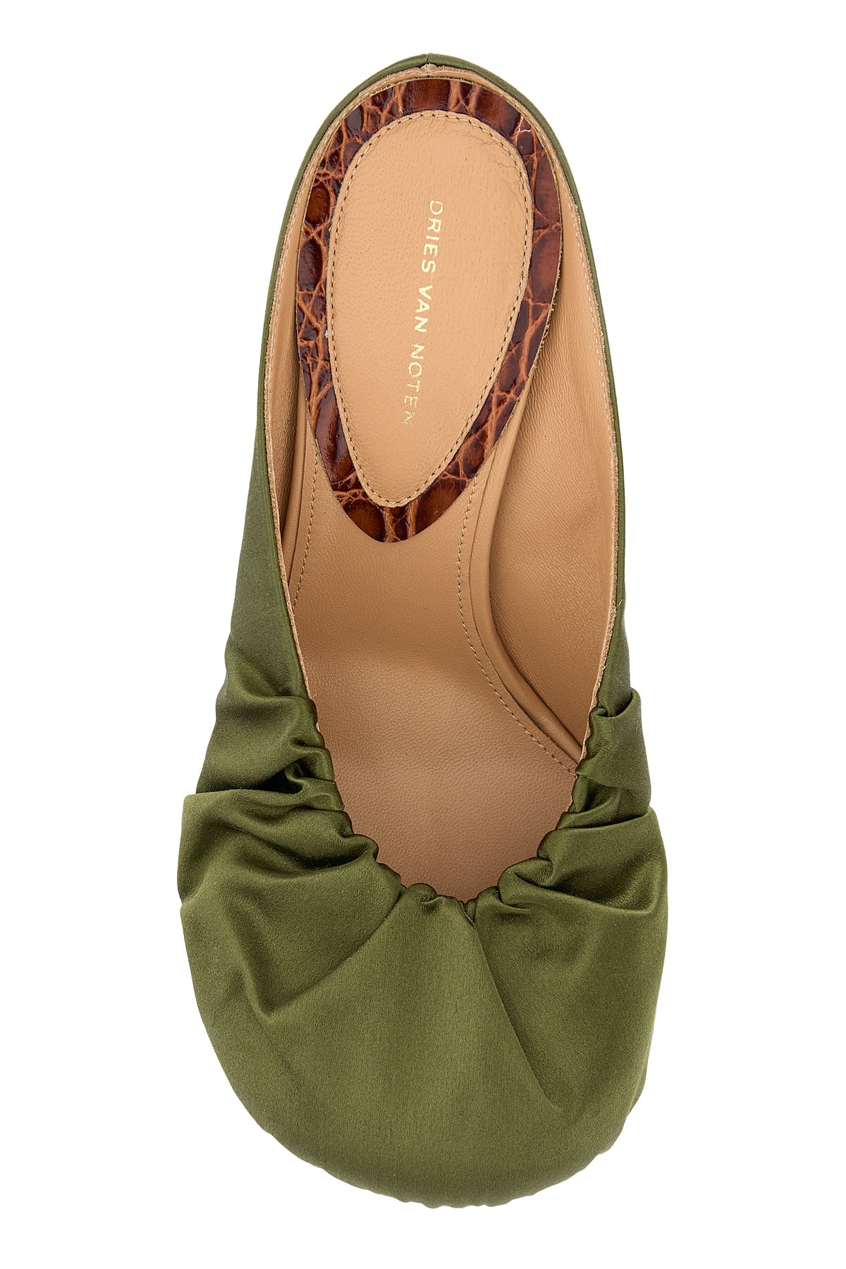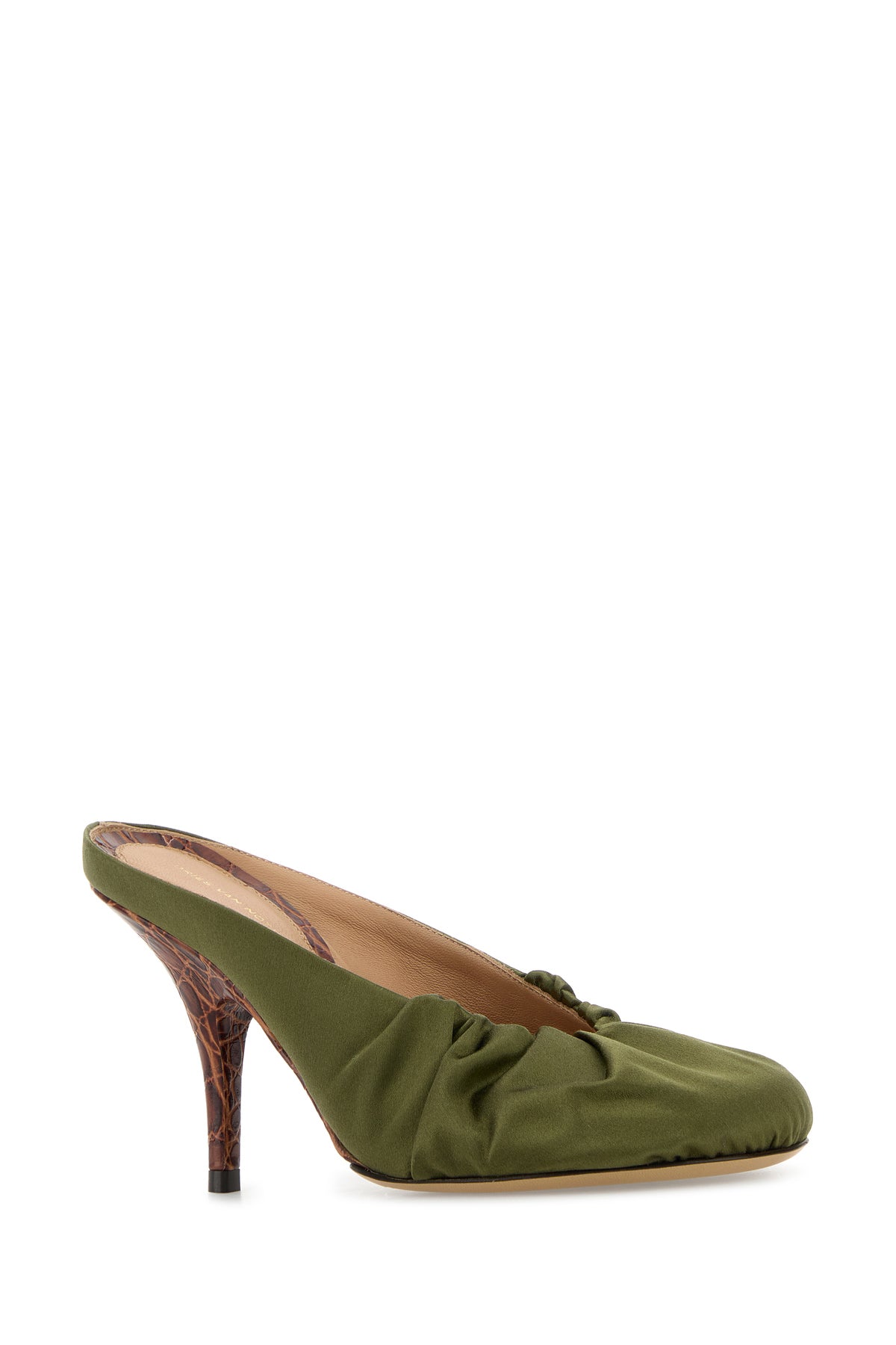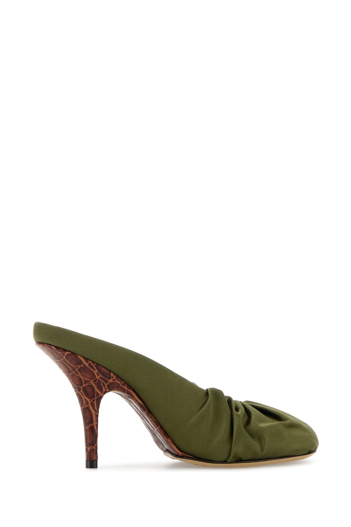 Mules realized in satin enriched by crocodile-motif embossed leather stiletto heel.