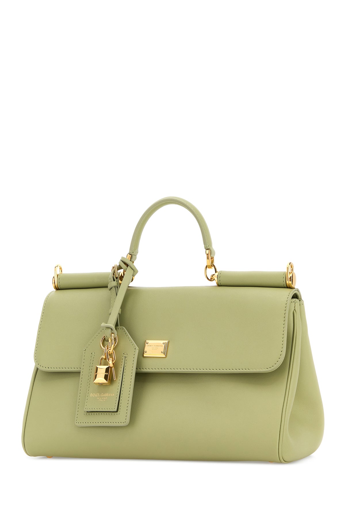 Handbag realized in calf leather enriched by logoed metal plate at the front.