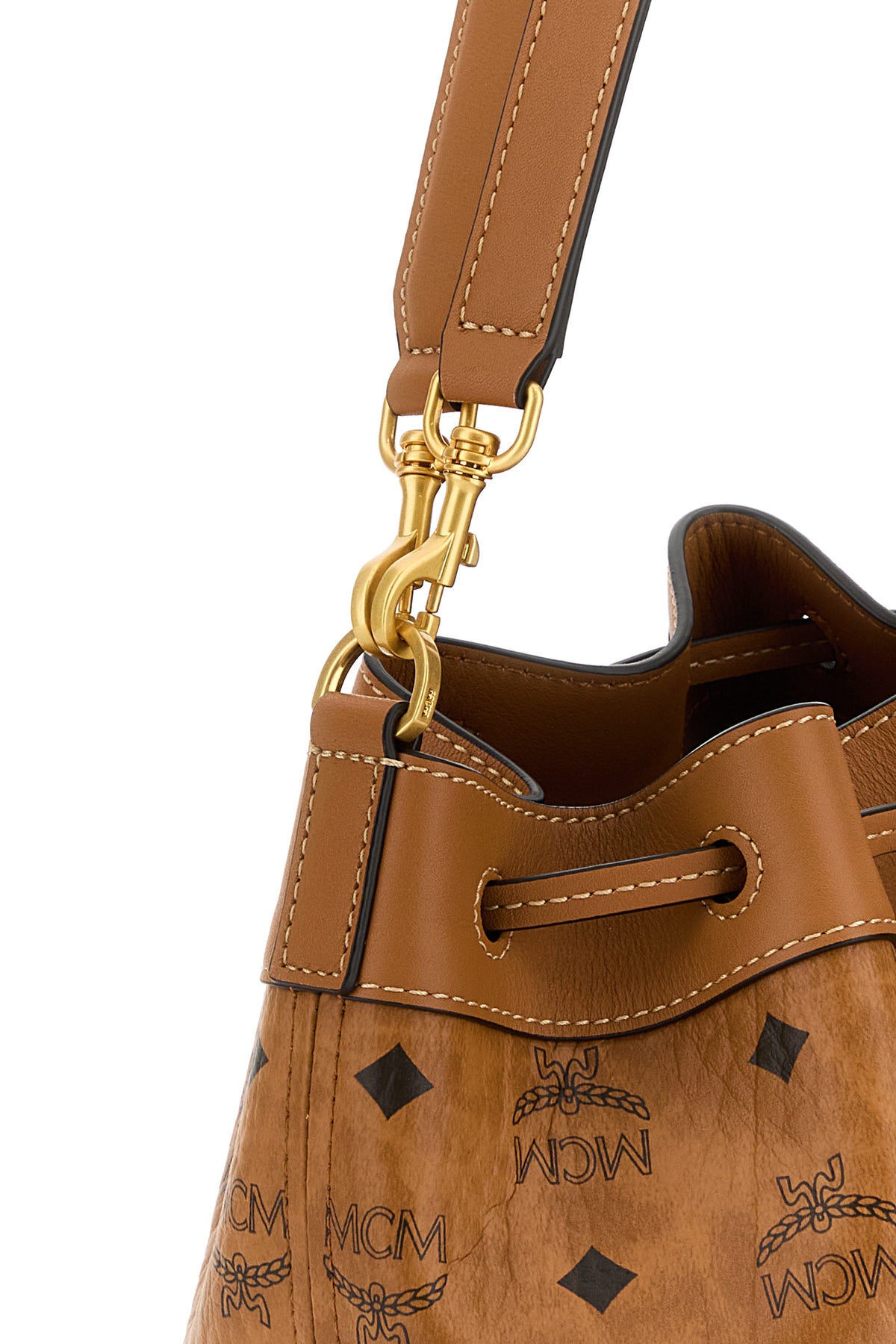 Bucket bag realized in coated canvas characterized by Visetos print on the entire surface enriched by logoed metal plate at the front.