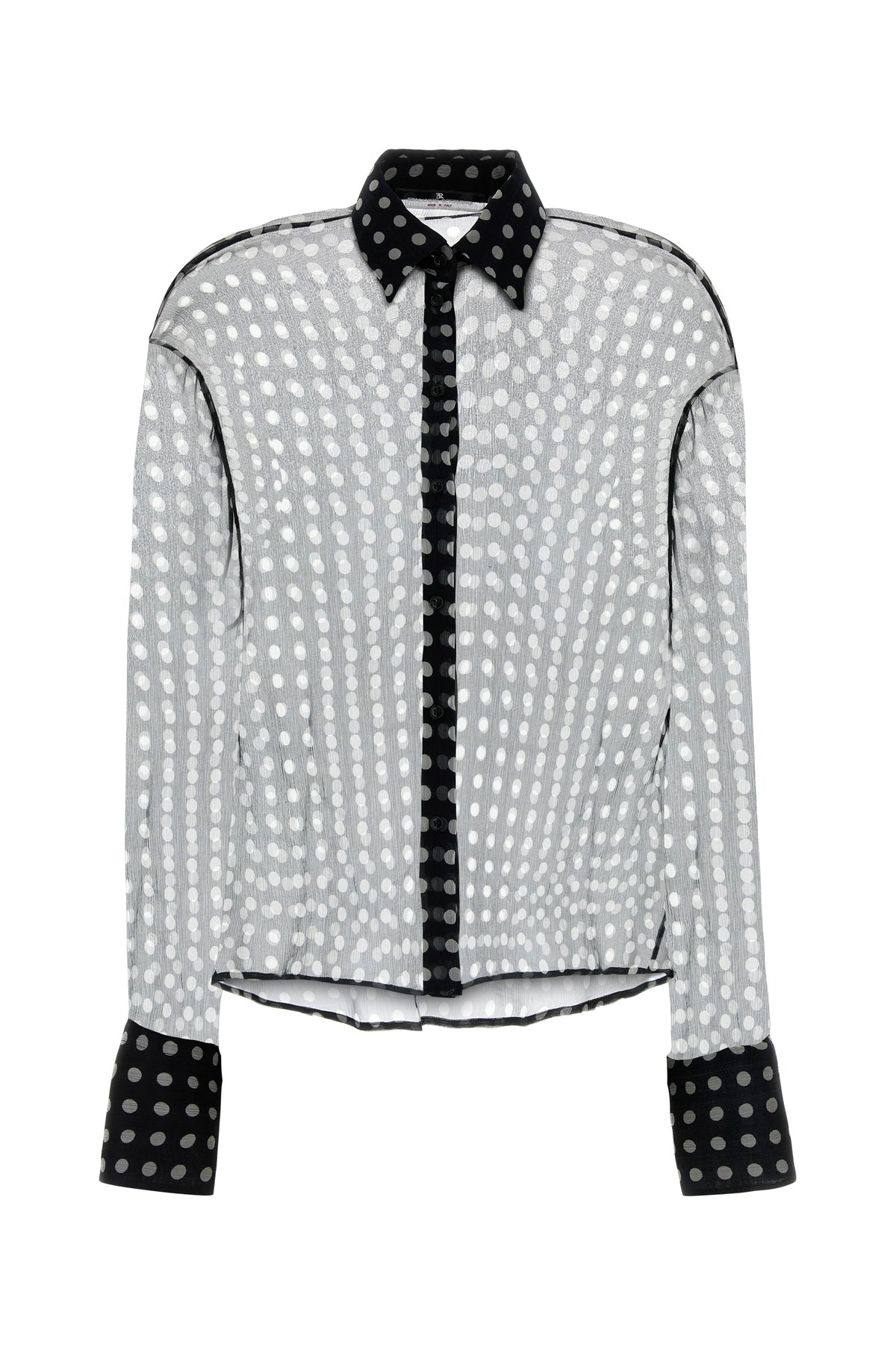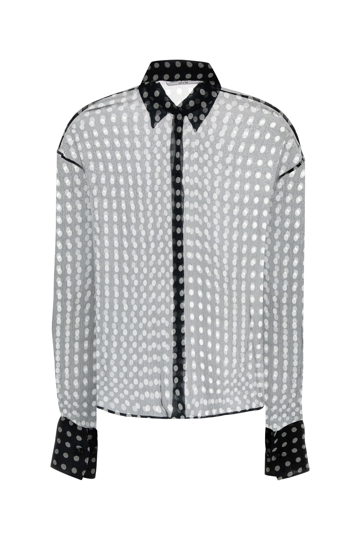 Semi-transparent shirt realized in pur silk crepe characterized by polka-dots print on the entire surface.