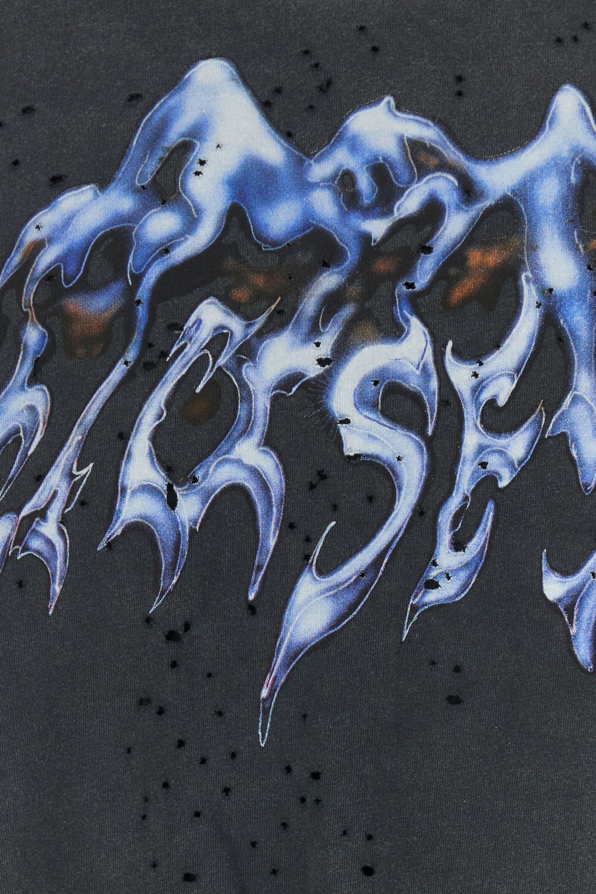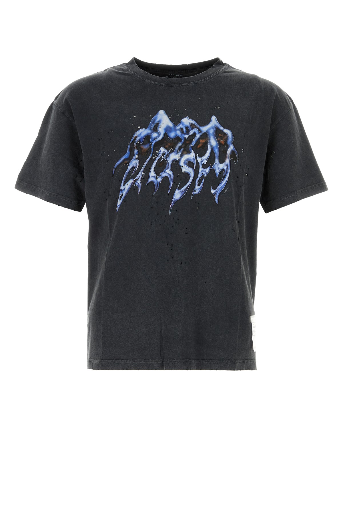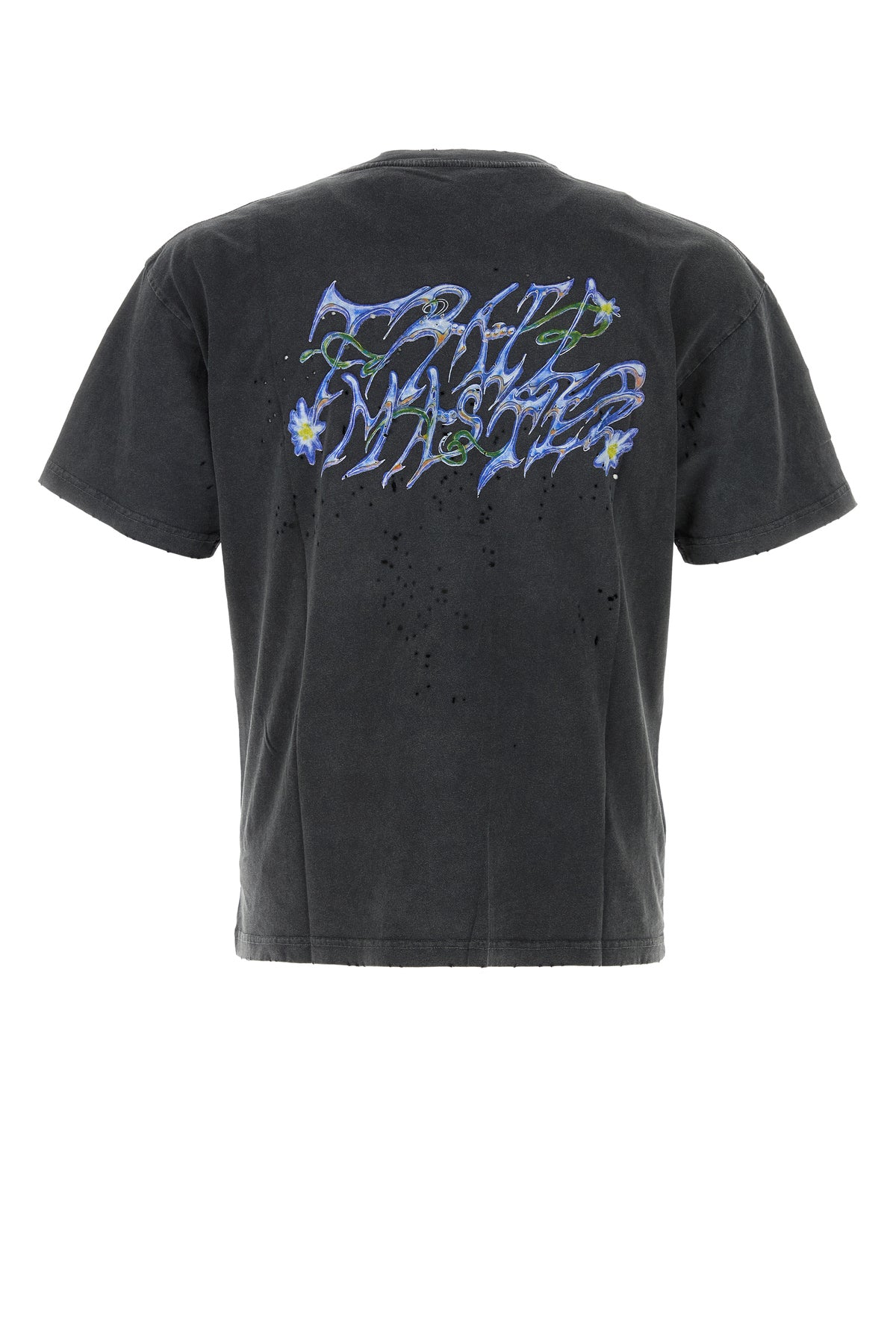 T-shirt realized in distressed pure organic cotton characterized by logoed print at the front and at the back enriched by logoed label on the hemline.