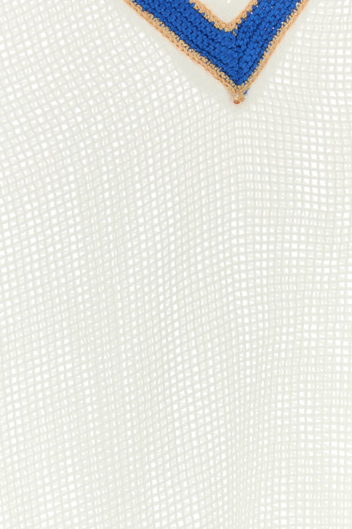 Caftan realized in pure cotton crochet characterized by contrasting bands on the trimmings enriched by peculiar crochet embellishments on the cuffs.