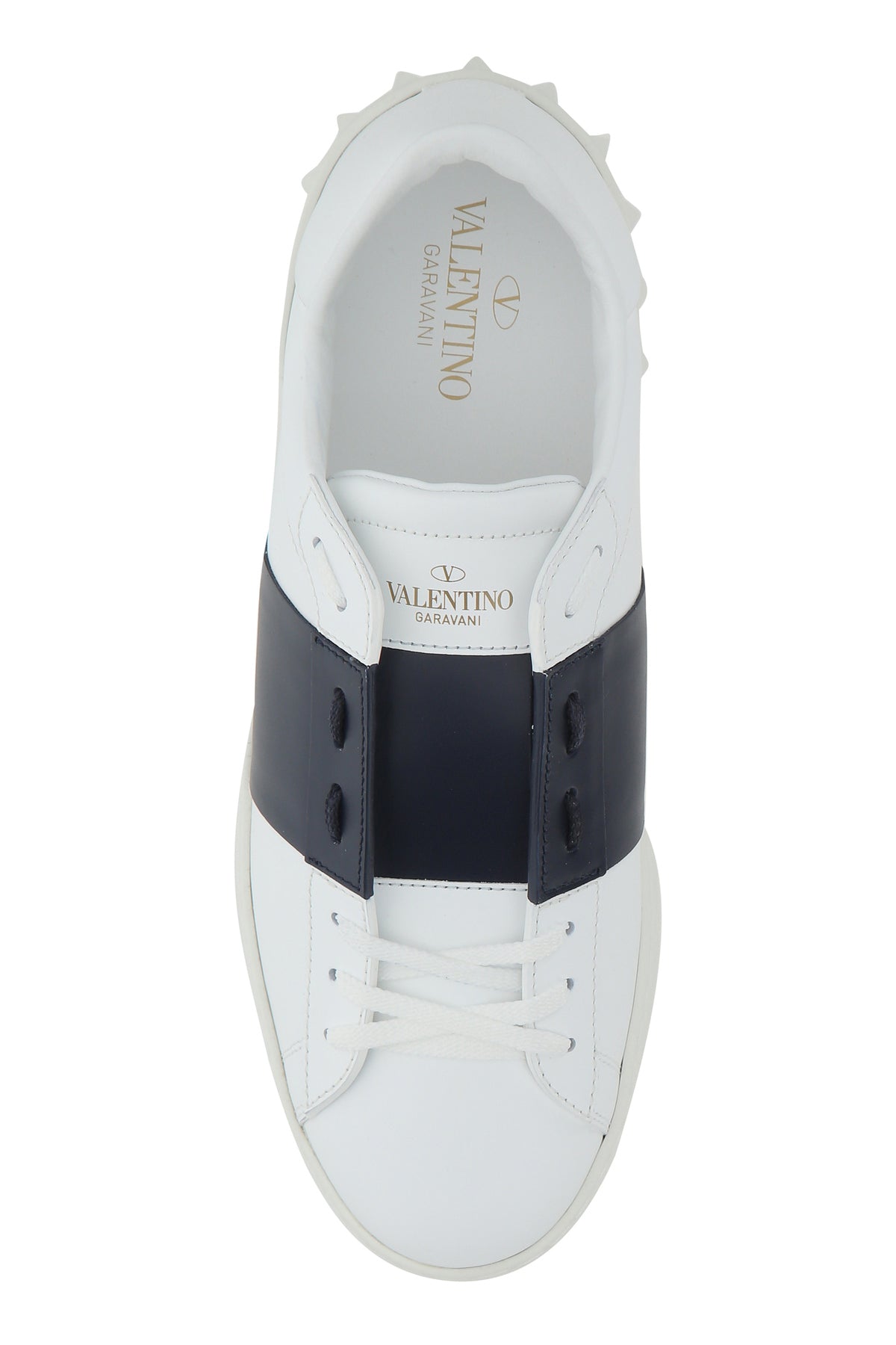 White leather Open sneakers with blue navy band