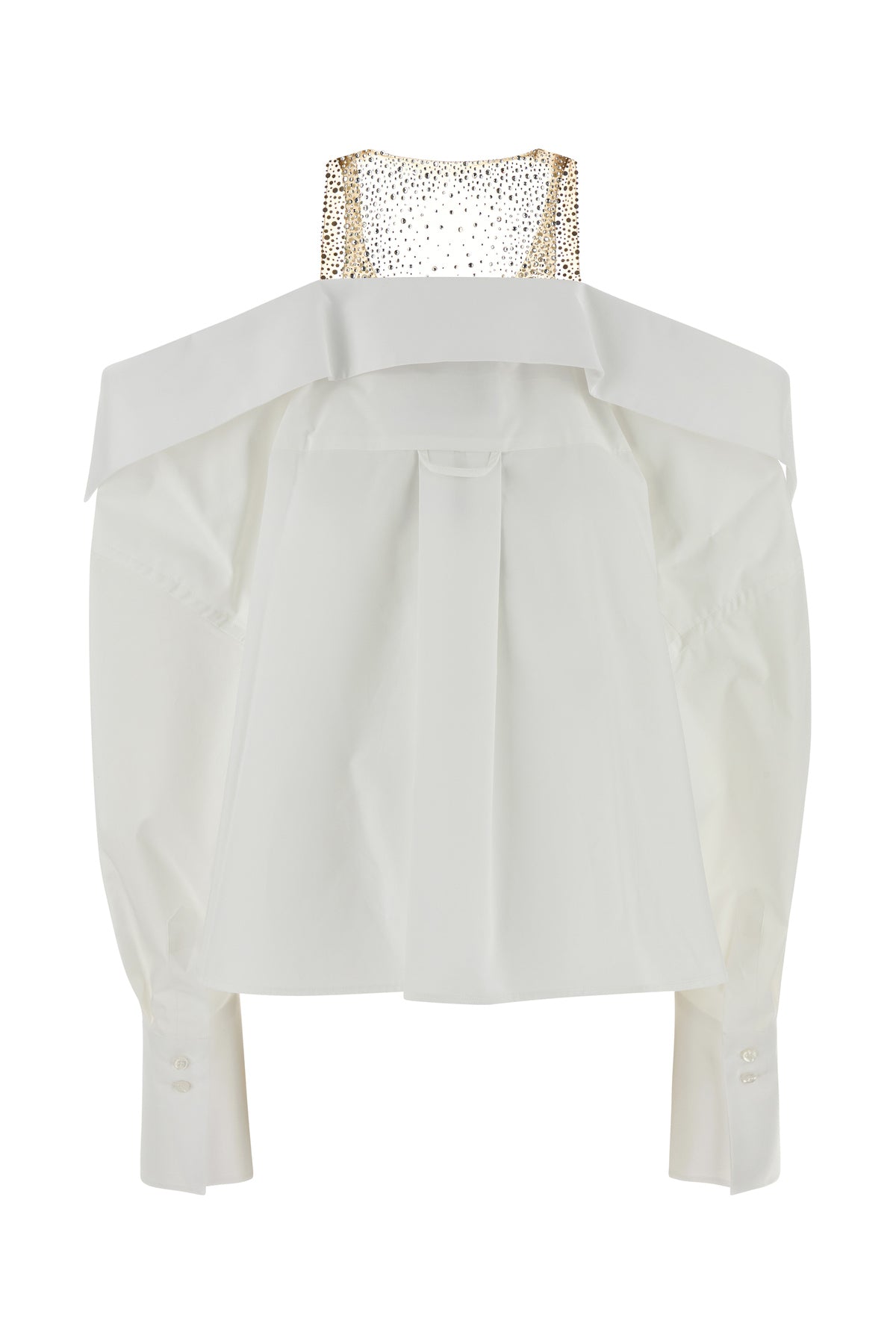 Oversize off-the-shoulder shirt realized in pure cotton poplin enriched by mesh insert with rhinestones at the top.