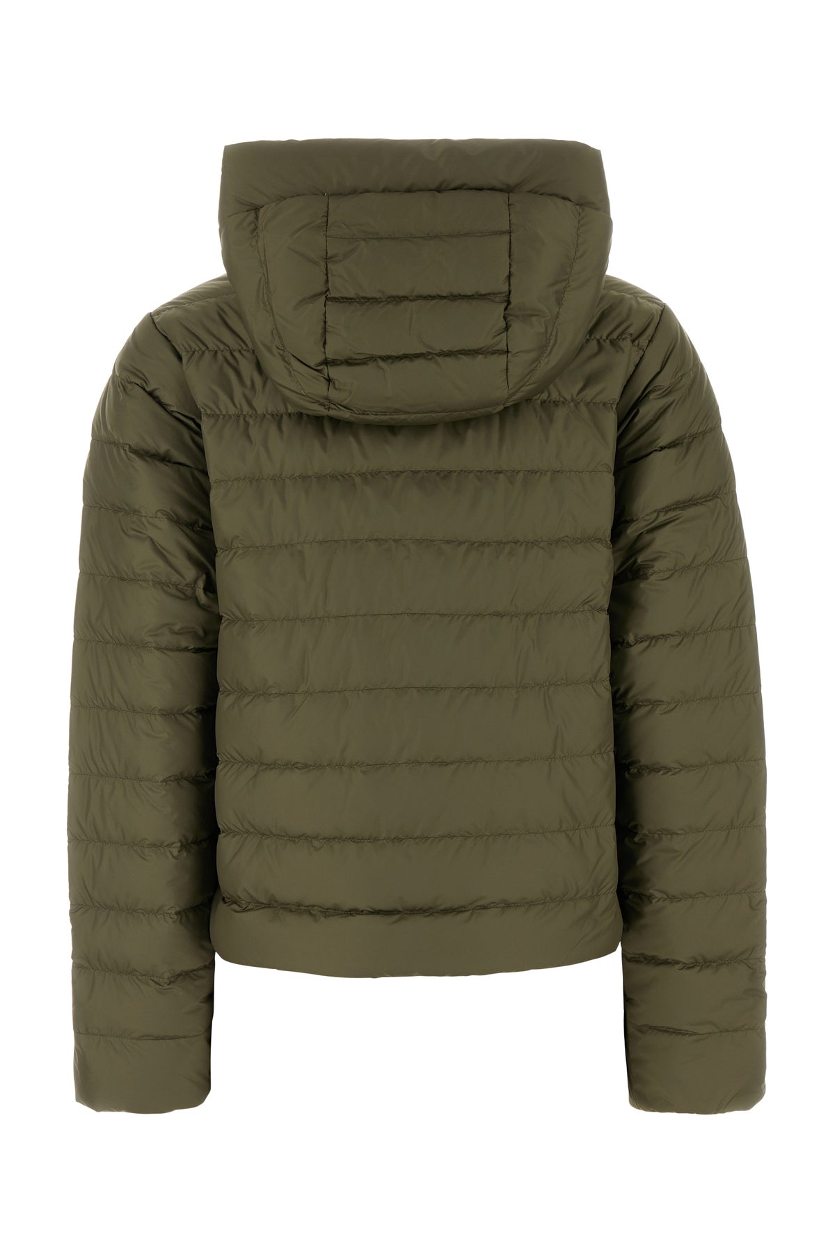 Down jacket realized in quilted polyester characterized by drawstring hood.