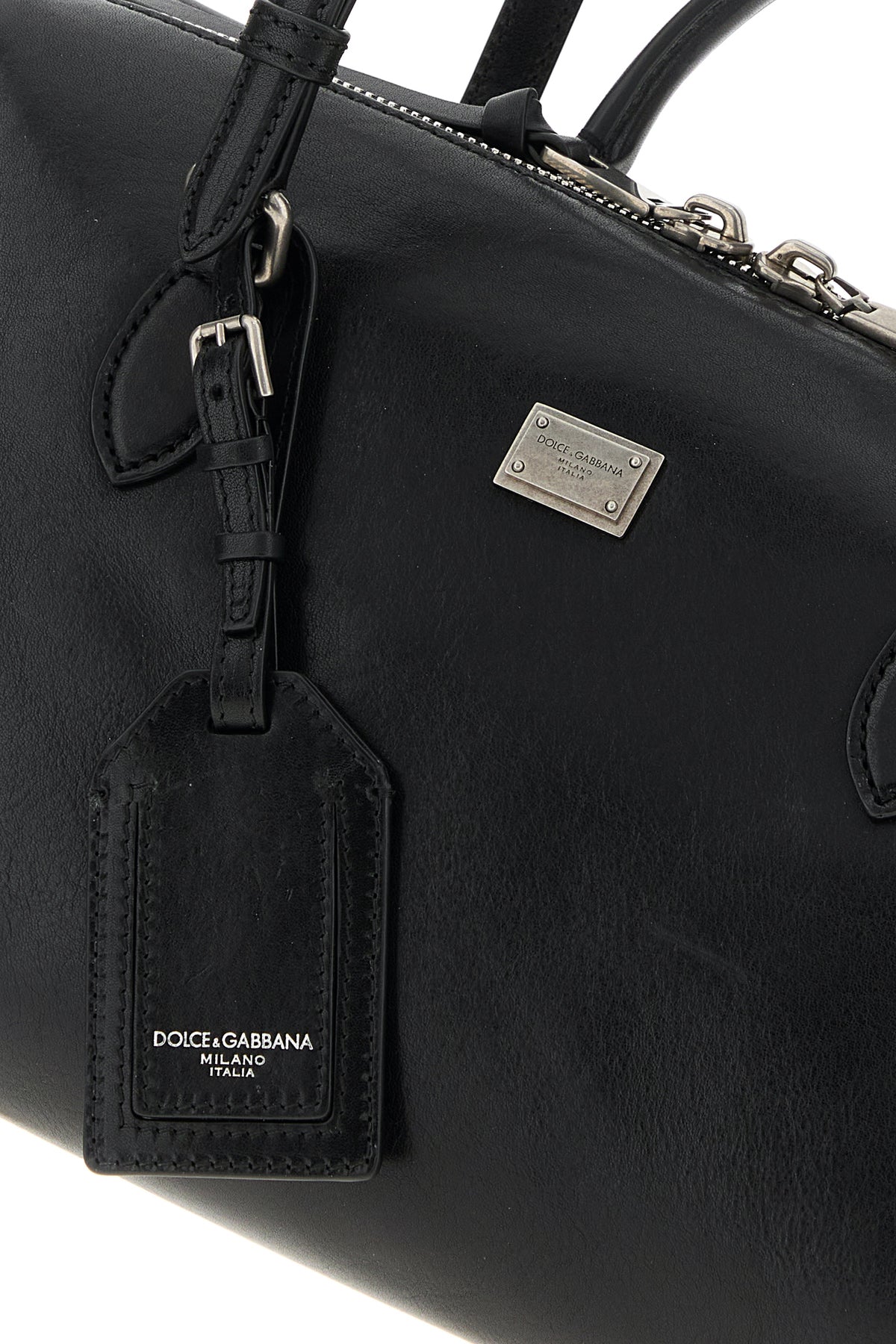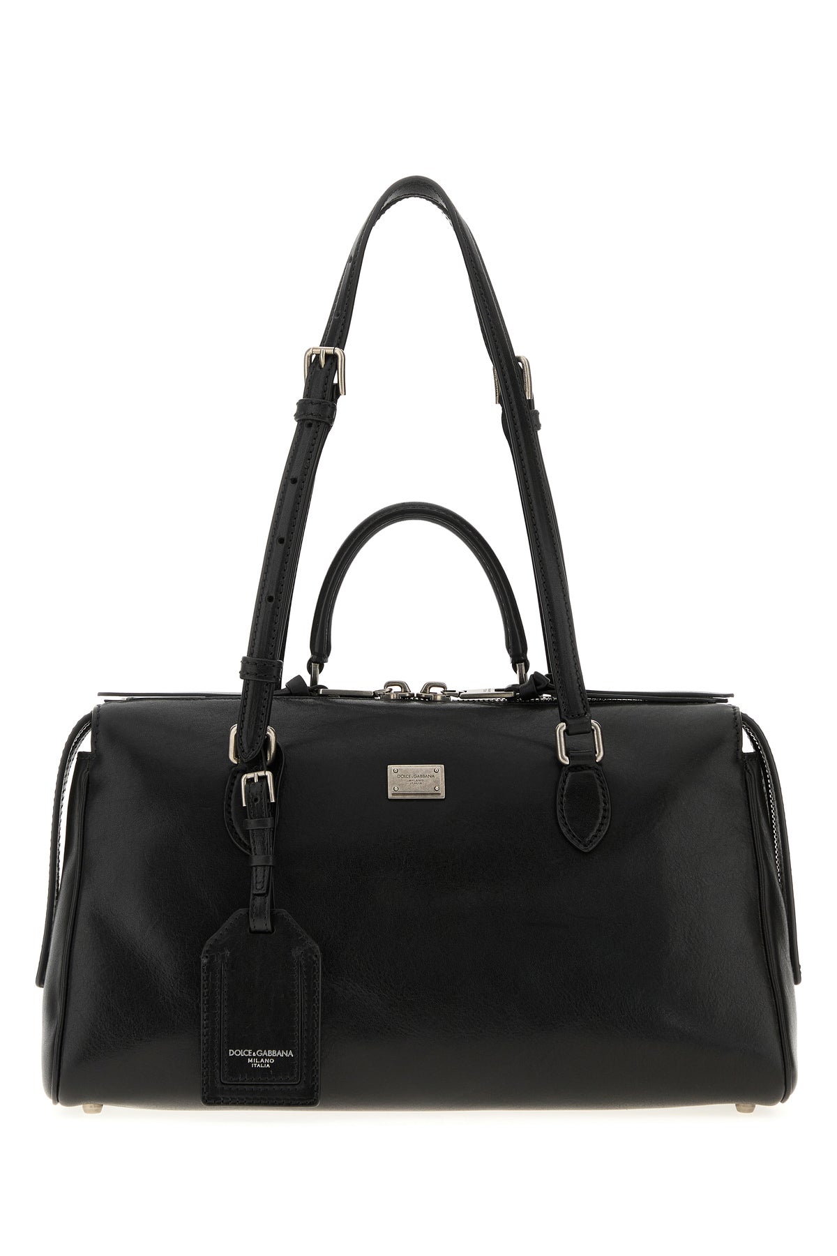 Handbag realized in calf leather enriched by logoed metal plate at the front.
