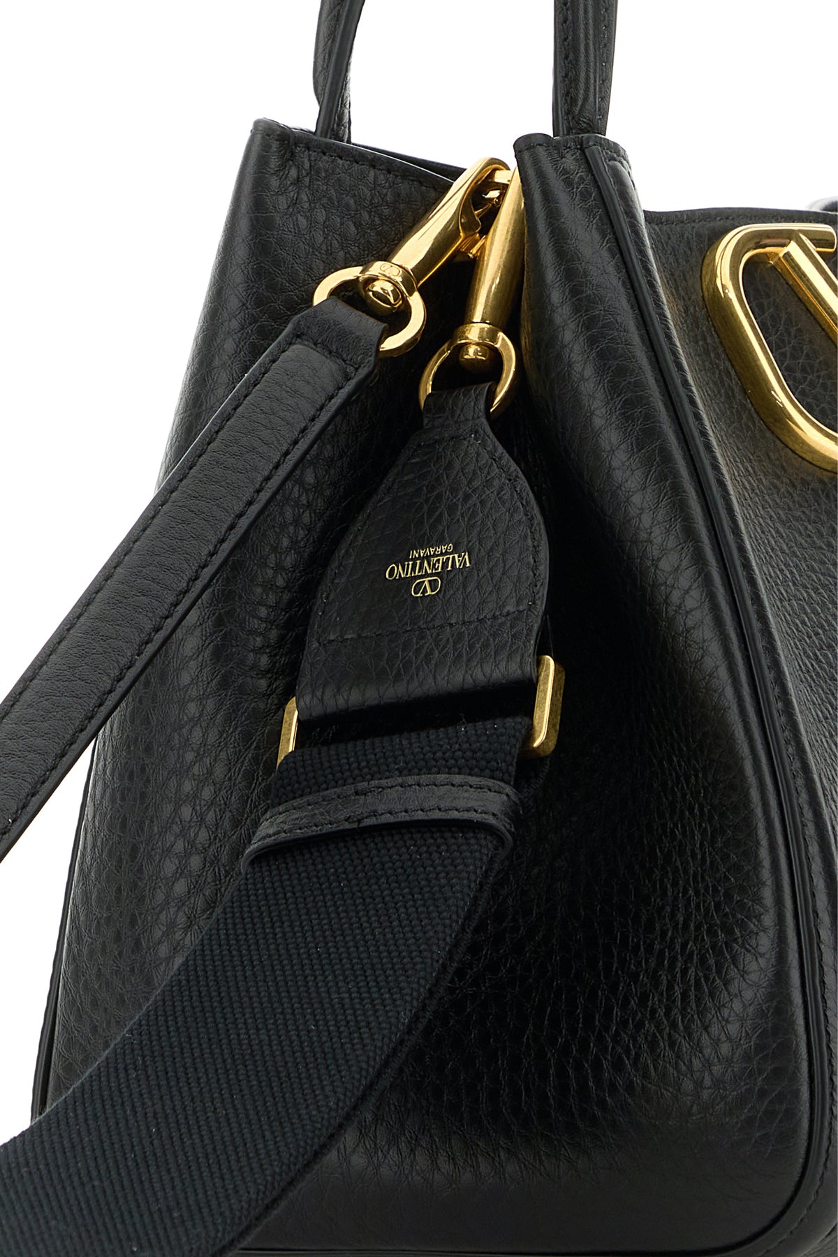 Handbag realized in pebble calf leather enriched by metal VLogo detail at the front.