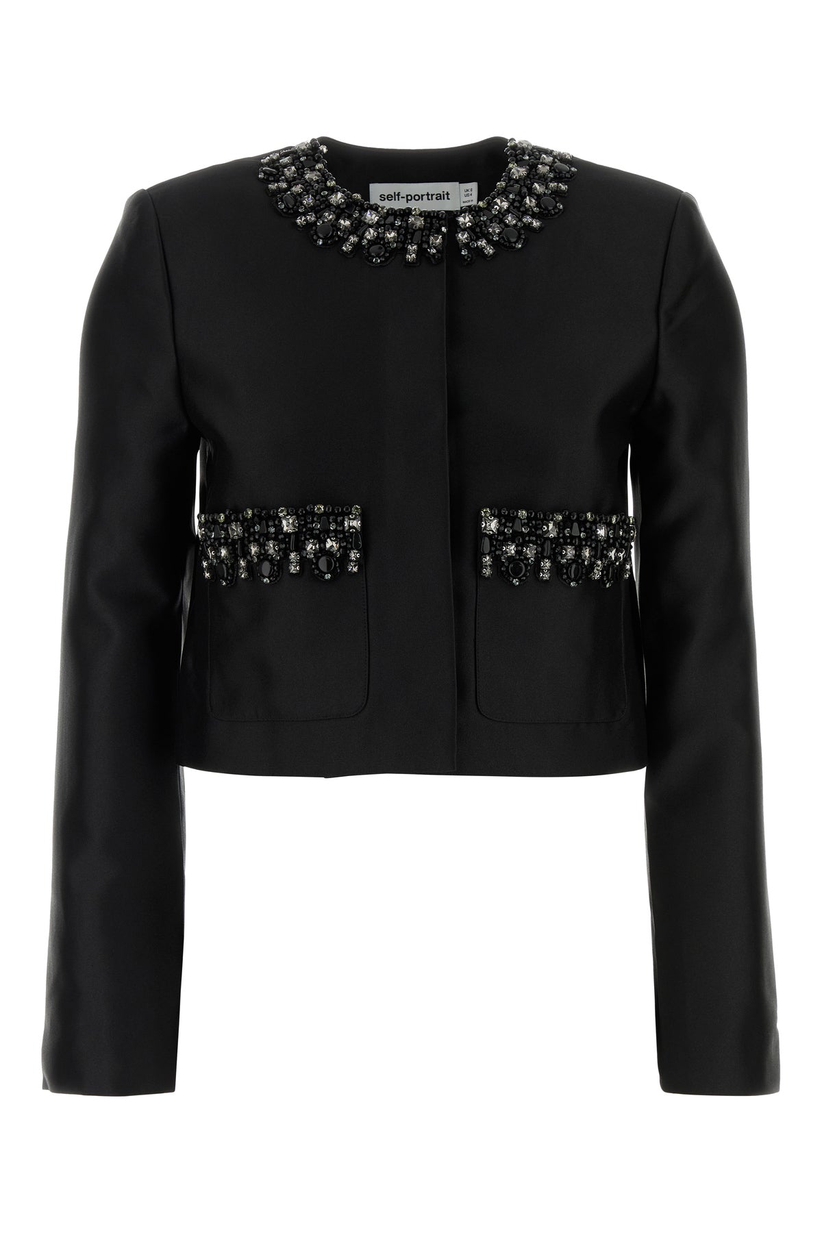 Cropped-cut blazer realized in taffeta enriched by jewel embellishments at the front.