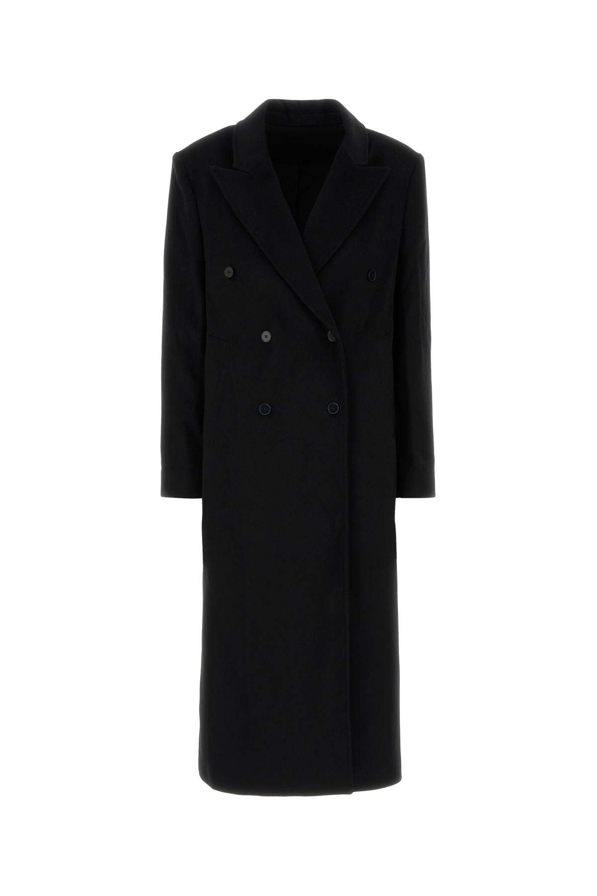 Long-cut coat realized in wool and cashmere.